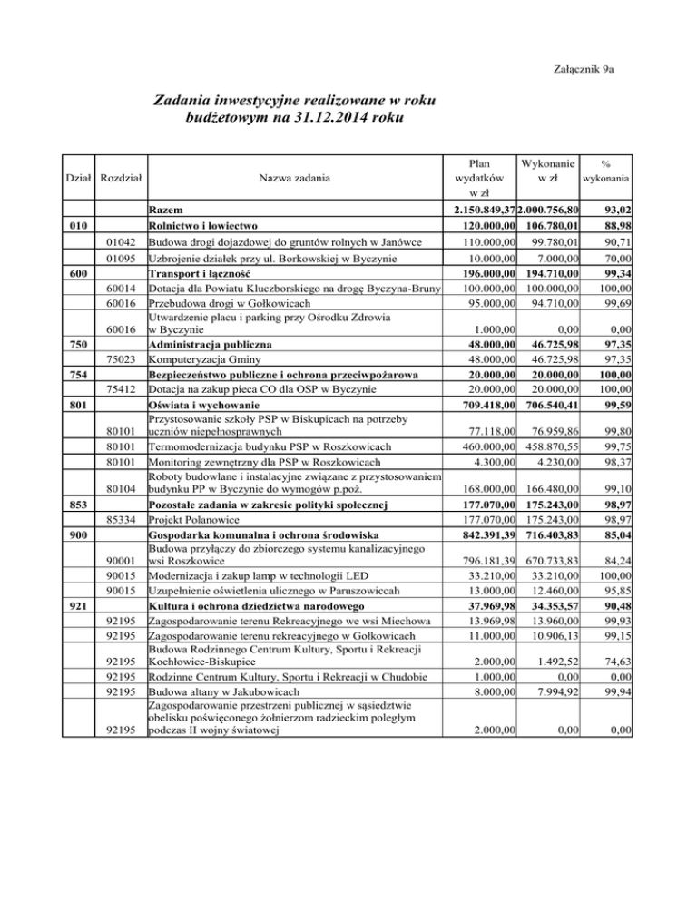 Załącznik 9a Zadania inwestycyjne realizowane w roku budżetowym na 31.12.2014 roku Dział Rozdział Nazwa zadania Razem Plan wydatków w zł Wykonanie % w zł wykonania 2.150.849,37 2.000.756,80 93,02 Rolnictwo i łowiectwo 120.000,00 106.780,01 88,98 01042 Budowa drogi dojazdowej do gruntów rolnych w Janówce 110.000,00 99.780,01 90,71 01095 Uzbrojenie działek przy ul. Borkowskiej w Byczynie Transport i łączność Dotacja dla Powiatu Kluczborskiego na drogę Byczyna-Bruny Przebudowa drogi w Gołkowicach Utwardzenie placu i parking przy Ośrodku Zdrowia w Byczynie Administracja publiczna Komputeryzacja Gminy Bezpieczeństwo publiczne i ochrona przeciwpożarowa Dotacja na zakup pieca CO dla OSP w Byczynie Oświata i wychowanie Przystosowanie szkoły PSP w Biskupicach na potrzeby uczniów niepełnosprawnych Termomodernizacja budynku PSP w Roszkowicach Monitoring zewnętrzny dla PSP w Roszkowicach Roboty budowlane i instalacyjne związane z przystosowaniem budynku PP w Byczynie do wymogów p.poż. Pozostałe zadania w zakresie polityki społecznej Projekt Polanowice Gospodarka komunalna i ochrona środowiska Budowa przyłączy do zbiorczego systemu kanalizacyjnego wsi Roszkowice Modernizacja i zakup lamp w technologii LED Uzupełnienie oświetlenia ulicznego w Paruszowiccah Kultura i ochrona dziedzictwa narodowego Zagospodarowanie terenu Rekreacyjnego we wsi Miechowa Zagospodarowanie terenu rekreacyjnego w Gołkowicach Budowa Rodzinnego Centrum Kultury, Sportu i Rekreacji Kochłowice-Biskupice Rodzinne Centrum Kultury, Sportu i Rekreacji w Chudobie Budowa altany w Jakubowicach Zagospodarowanie przestrzeni publicznej w sąsiedztwie obelisku poświęconego żołnierzom radzieckim poległym podczas II wojny światowej 10.000,00 7.000,00 196.000,00 194.710,00 100.000,00 100.000,00 95.000,00 94.710,00 70,00 99,34 100,00 99,69 1.000,00 0,00 48.000,00 46.725,98 48.000,00 46.725,98 20.000,00 20.000,00 20.000,00 20.000,00 709.418,00 706.540,41 0,00 97,35 97,35 100,00 100,00 99,59 77.118,00 76.959,86 460.000,00 458.870,55 4.300,00 4.230,00 99,80 99,75 98,37 168.000,00 177.070,00 177.070,00 842.391,39 166.480,00 175.243,00 175.243,00 716.403,83 99,10 98,97 98,97 85,04 796.181,39 670.733,83 33.210,00 33.210,00 13.000,00 12.460,00 37.969,98 34.353,57 13.969,98 13.960,00 11.000,00 10.906,13 84,24 100,00 95,85 90,48 99,93 99,15 010 600 60014 60016 60016 750 75023 754 75412 801 80101 80101 80101 80104 853 85334 900 90001 90015 90015 921 92195 92195 92195 92195 92195 92195 2.000,00 1.000,00 8.000,00 1.492,52 0,00 7.994,92 74,63 0,00 99,94 2.000,00 0,00 0,00 Dział 010 Rozdział 01042 Budowa drogi dojazdowej do gospodarstw i gruntów rolnych w sołectwie Janówka - w roku 2012 sołectwo Janówka przekazało część funduszu sołeckiego na poczet zakupienia map do celów projektowych potrzebnych do przygotowania dokumentacji technicznej a następnie w kolejnych latach wykonania drogi „Janówka – Marianka”. W pierwszym półroczu tego roku wyłoniono w drodze przetargu nieograniczonego wykonawcę zadania. Inwestycji została zakończona w III trzecim kwartale 2014 roku, w jej wyniku powstała droga o nawierzchni bitumicznej o długości 267 metrów, 4 metry szerokiej. Inwestycja uzyskała dofinansowanie ze środków Funduszu Ochrony Gruntów Rolnych Województwa Opolskiego w wysokości 47.663,38 zł. Rozdział 01095 Uzbrojenie działek budowlanych przy ul. Borkowskiej w Byczynie – gmina Byczyna planuje uzbrojenie trzynastu działek budowlanych na ulicy Borkowskiej. Chce je wyposażyć w sieć wodociągową, kanalizację sanitarną i deszczową. W roku 2014 środki zostały przeznaczone na wykonanie dokumentacji technicznej. Dział 600 Rozdział 60014 Dotacja dla Powiatu Kluczborskiego-Droga Powiatowa Byczyna-Bruny – w roku 2014 Gmina Byczyna przekazała dotacje do Powiatu Kluczborskiego na przebudowę drogi powiatowej Byczyna – Bruny, która zostanie przeznaczona na mapy i dokumenty na przygotowanie dokumentacji projektowej. Starostwo złoży wniosek o dofinansowanie na przebudowę drogi do Narodowego Planu Przebudowy Dróg Lokalnych 2012 – 2015. Rozdział 60016 Przebudowa drogi w Gołkowicach – w roku 2014 Gmina Byczyna przejęła drogę od Agencji Nieruchomości Rolnych w Opolu, na którą dostała dofinansowanie w kwocie 77.000,00 zł. W roku 2014 został zakupiony materiał na zrealizowanie inwestycji. Nawierzchnia drogi zostanie zrobiona z kostki betonowej. Zakończenie realizacji zadania nastąpi w I kwartale 2015 roku. Utwardzenie placu i parking przy Ośrodku Zdrowia w Byczynie – zadanie ma na celu utwardzenie placu i wykonanie parkingu przy Ośrodku Zdrowia w Byczynie. Zadanie zostanie zrealizowane w latach późniejszych. Dział 750 Rozdział 75023 Komputeryzacja gminy - zadanie to związane jest z zakupem sprzętu komputerowego na potrzeby Urzędu Miejskiego w Byczynie. Dział 754 Rozdział 75412 Zakup pieca CO dla OSP w Byczynie – w związku tym, iż stary piec znajdujący się w jednostce OSP w Byczynie uległ korozji i został zlikwidowany, w drugim półroczu 2014 roku został zakupiony nowy piec gazowy. Gmina dofinansowała zakup pieca dotacją w kwocie 20.000,00 zł. Dział 801 Rozdział 80101 Przystosowanie szkoły PSP w Biskupicach na potrzeby uczniów niepełnosprawnych – w miesiącu lipcu został przeprowadzony remont sanitariatów w PSP w Biskupicach, dotyczył on remontu WC chłopców na parterze i remont WC dla dziewcząt na I piętrze. Został również przeprowadzony remont instalacji wodociągowej i kanalizacji sanitarnej. Toaleta na parterze została przystosowana na potrzeby osób niepełnosprawnych. Termomodernizacja budynku PSP w Roszkowicach – zadanie objęło termomodernizację budynku Szkoły Podstawowej w Roszkowicach wraz z wymianą pokrycia dachowego. Termomodernizacja obejmowała min. odbicie i uzupełnienie tynków, wymianę stolarki okiennej i drzwiowej, ocieplenie ścian zewnętrznych i ościeży, obróbki blacharskie i parapety, ocieplen