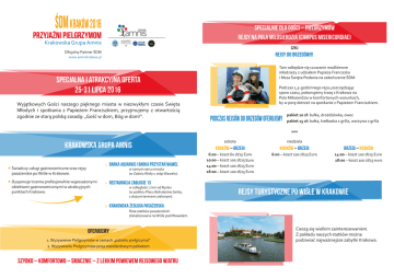 ŚDM Kraków 2016 Specjalnie dla Gości – Pielgrzymów Rejsy na Pola Miłosierdzia (Campus Misericordiae) Przyjaźni Pielgrzymom Krakowska Grupa Amnis czyli Oficjalny Partner ŚDM Rejsy do Brzegów!!! www.amniskrakow.pl Tam odbędzie się czuwanie modlitewne młodzieży z udziałem Papieża Franciszka i Msza Święta Posłania na zakończenie ŚDM. Specjalna i atrakcyjna oferta 25-31 lipca 2016 Wyjątkowych Gości naszego pięknego miasta w niezwykłym czasie Święta Młodych i spotkania z Papieżem Franciszkiem, przyjmujemy z otwartością zgodnie ze starą polską zasadą: „Gość w dom, Bóg w dom!”. Podczas 1,5-godzinnego rejsu,oszczędzając sporo czasu, pokonujemy trasę z Krakowa na Pola Miłosierdzia w komfortowych warunkach, by w porę dotrzeć na spotkanie z Papieżem Franciszkiem. Podczas rejsów do Brzegów Oferujemy pakiet 10 zł: bułka, drożdżówka, owoc pakiet 15 zł: bułka, kiełbaska z grilla, warzywa z grilla *** Krakowska Grupa Amnis 1. Świadczy usługi gastronomiczne oraz rejsy pasażerskie po Wiśle w Krakowie. Barka Aquarius i Barka Przystań Wawel w samym sercu miasta (w Zakolu Wisły u stóp Wawelu). Dysponuje trzema profesjonalnie wyposażonymi obiektami gastronomicznymi w atrakcyjnych punktach Krakowa: 2. niedziela Kraków – Brzegi Kraków – Brzegi Brzegi – Kraków 6:00 – koszt 60 zł/15 Euro 10:00 – koszt 100 zł/25 Euro 14:00 – koszt 100 zł/25 Euro 18:00 – koszt 100 zł/25 Euro 6:00 – koszt 100 zł/25 Euro 14:00 – koszt 100 zł/25 Euro 18:00 – koszt 100 zł/25 euro Restauracja Zabłocie 13 w odległości 2 km od Rynku (w pobliżu Placu Bohaterów Getta, z dużym terenem zielonym). 3. sobota Rejsy turystyczne po Wiśle w Krakowie Krakowska Żegluga Pasażerska flota statków pasażerskich zlokalizowana na Wiśle pod Wawelem. OFERUJEMY 1. Wyżywienie Pielgrzymów w ramach „pakietu pielgrzyma” 2. Wyżywienie Pielgrzymów poza standardowym pakietem Szybko – komfortowo – smacznie – z lekkim powiewem rejsowego wiatru Cieszą się wielkim zainteresowaniem. Z pokładu naszych statków można podziwiać najważniejsze zabytki Krakowa. Barka Aquarius Rejsy spacerowe po rzece Wiśle „Szlakiem krakowskich zabytków” rejs godzinny – 40 zł/10 Euro 10:00, 10:30, 11:00, 11:30 12:30, 13:00, 13:30, 14:00 15:00, 15:30, 16:00, 16:30 17:30, 18:00, 18:30, 19:00 www.aquariuskrakow.pl Pakiet 10 zł Pakiet 20 zł kiełbasa z grilla /150 gram/ bułka sosy /musztarda, ketchup/ 10:00, 11:30, 13:00, 14:30, 16:00, 17:30, 18:00, 19:30 rejs półgodzinny – 25 zł/7 Euro Całoroczna restauracja na wodzie – idealne miejsce na okolicznościowe spotkania. zupa pomidorowa z makaronem lub ryżem pieczony filet z kurczaka, ziemniaki, surówka Pakiet 15 zł kiełbasa z grilla /150 gram/ bułka sosy /musztarda, ketchup/ zupa pomidorowa z makaronem Barka Przystań Wawel www.StatekKrakow.com Pakiet 10 zł kiełbasa z grilla /150 gram/ bułka, sosy /musztarda, ketchup/ Pakiet 15 zł Pakiet 20 zł kiełbasa z grilla /150 gram/ zupa pomidorowa z makaronem lub ryżem bułka, sosy /musztarda, ketchup/ pieczony filet z kurczaka, ziemniaki, surówka zupa pomidorowa z makaronem RESTAURACJA ZABŁOCIE 13 www.zablocie13.pl Rejs do Tyńca Rejs po Wiśle do Opactwa Benedyktynów w Tyńcu. Podczas trzygodzinnego rejsu można zobaczyć m.in.: Wawel, Opactwo Norbertanek, Kopiec Kościuszki, Skałkę, Kazimierz. 100 zł/25 Euro – warunkiem jest grupa minimum 150 osób Do zobaczenia na rejsie! Pakiet 10 zł Pakiet 20 zł kiełbasa z grilla z pieczywem + dodatki Pakiet 15 zł filet z kurczaka, kasza gryczana, surówka karczek,kasza gryczana,surówka ryż z kurczakiem w sosie słodko-kwaśnym wega: ryż z sosem słodko-kwaśnym filet z kurczaka, kasza gryczana, surówka + zupa karczek,kasza gryczana,surówka + zupa ryż z kurczakiem w sosie słodko-kwaśnym + zupa wega: ryż z sosem słodko-kwaśnym + zupa Suchy prowiant 10zł Wszystkie informacje o ofercie oraz lokalizacji miejsc – na naszych stronach internetowych Organizator zastrzega sobie prawo do odwołania lub zmiany oferty z przyczyn niezależnych od niego.