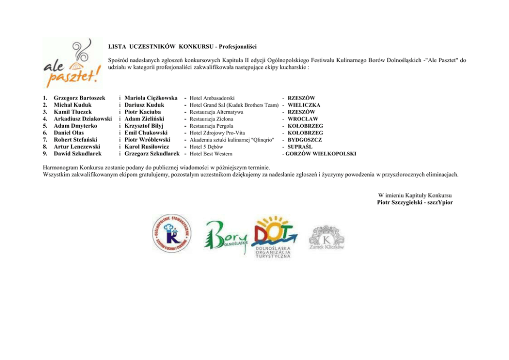 LISTA UCZESTNIKÓW KONKURSU - Profesjonaliści Spośród nadesłanych zgłoszeń konkursowych Kapituła II edycji Ogólnopolskiego Festiwalu Kulinarnego Borów Dolnośląskich -"Ale Pasztet" do udziału w kategorii profesjonaliści zakwalifikowała następujące ekipy kucharskie : 1. 2. 3. 4. 5. 6. 7. 8. 9. Grzegorz Bartoszek Michał Kuduk Kamil Tłuczek Arkadiusz Dziakowski Adam Dmyterko Daniel Olas Robert Stefański Artur Lenczewski Dawid Szkudlarek i i i i i i i i i Mariola Ciężkowska Dariusz Kuduk Piotr Kaciuba Adam Zieliński Krzysztof Biłyj Emil Chukowski Piotr Wróblewski Karol Rusiłowicz Grzegorz Szkudlarek - Hotel Ambasadorski Hotel Grand Sal (Kuduk Brothers Team) Restauracja Alternatywa Restauracja Zielona Restauracja Pergola Hotel Zdrojowy Pro-Vita Akademia sztuki kulinarnej "Qlinqrio" Hotel 5 Dębów Hotel Best Western - RZESZÓW - WIELICZKA - RZESZÓW - WROCŁAW - KOŁOBRZEG - KOŁOBRZEG - BYDGOSZCZ - SUPRAŚL - GORZÓW WIELKOPOLSKI Harmonogram Konkursu zostanie podany do publicznej wiadomości w późniejszym terminie. Wszystkim zakwalifikowanym ekipom gratulujemy, pozostałym uczestnikom dziękujemy za nadesłanie zgłoszeń i życzymy powodzenia w przyszłorocznych eliminacjach. W imieniu Kapituły Konkursu Piotr Szczygielski - szczYpior