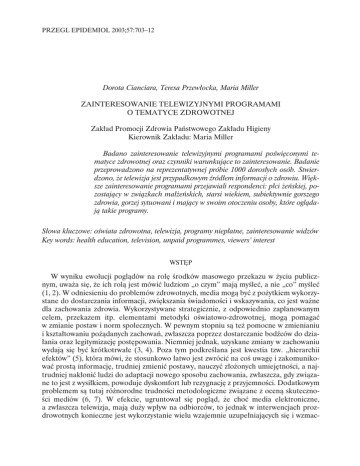PRZEGL EPIDEMIOL 2003;57:703–12 Dorota Cianciara, Teresa Przewłocka, Maria Miller ZAINTERESOWANIE TELEWIZYJNYMI PROGRAMAMI O TEMATYCE ZDROWOTNEJ Zakład Promocji Zdrowia Państwowego Zakładu Higieny Kierownik Zakładu: Maria Miller Badano zainteresowanie telewizyjnymi programami poświęconymi tematyce zdrowotnej oraz czynniki warunkujące to zainteresowanie. Badanie przeprowadzono na reprezentatywnej próbie 1000 dorosłych osób. Stwierdzono, że telewizja jest przypadkowym źródłem informacji o zdrowiu. Większe zainteresowanie programami przejawiali respondenci: płci żeńskiej, pozostający w związkach małżeńskich, starsi wiekiem, subiektywnie gorszego zdrowia, gorzej sytuowani i mający w swoim otoczeniu osoby, które oglądają takie programy. Słowa kluczowe: oświata zdrowotna, telewizja, programy niepłatne, zainteresowanie widzów Key words: health education, television, unpaid programmes, viewers’ interest WSTĘP W wyniku ewolucji poglądów na rolę środków masowego przekazu w życiu publicznym, uważa się, że ich rolą jest mówić ludziom „o czym” mają myśleć, a nie „co” myśleć (1, 2). W odniesieniu do problemów zdrowotnych, media mogą być z pożytkiem wykorzystane do dostarczania informacji, zwiększania świadomości i wskazywania, co jest ważne dla zachowania zdrowia. Wykorzystywane strategicznie, z odpowiednio zaplanowanym celem, przekazem itp. elementami metodyki oświatowo-zdrowotnej, mogą pomagać w zmianie postaw i norm społecznych. W pewnym stopniu są też pomocne w zmienianiu i kształtowaniu pożądanych zachowań, zwłaszcza poprzez dostarczanie bodźców do działania oraz legitymizację postępowania. Niemniej jednak, uzyskane zmiany w zachowaniu wydają się być krótkotrwałe (3, 4). Poza tym podkreślana jest kwestia tzw. „hierarchii efektów” (5), która mówi, że stosunkowo łatwo jest zwrócić na coś uwagę i zakomunikować prostą informację, trudniej zmienić postawy, nauczyć złożonych umiejętności, a najtrudniej nakłonić ludzi do adaptacji nowego sposobu zachowania, zwłaszcza, gdy związane to jest z wysiłkiem, powoduje dyskomfort lub rezygnację z przyjemności. Dodatkowym problemem są tutaj różnorodne trudności metodologiczne związane z oceną skuteczności mediów (6, 7). W efekcie, ugruntował się pogląd, że choć media elektroniczne, a zwłaszcza telewizja, mają duży wpływ na odbiorców, to jednak w interwencjach prozdrowotnych konieczne jest wykorzystanie wielu wzajemnie uzupełniających się i wzmac- 704 D Cianciara, T Przewłocka, M Miller Nr 4 niających kanałów komunikowania się – multimedialnego, oddziaływań grupowych i interpersonalnych (8). Fakt, że media mogą wywoływać przypadkowe i nieprzewidywalne efekty znany jest od czasu udokumentowania paniki wywołanej przez radiową audycję pt. „War of the Worlds”, którą w latach 30. stworzył Orson Welles na podstawie książki H. G. Wells’a. W odniesieniu do kwestii zdrowotnych, niezamierzone efekty nie były chyba nigdy tak dramatyczne, ale często przywołuje się przykład lęków przed pigułką antykoncepcyjną, wywołanych w latach 80., przetrwałych do dzisiaj i trudnych do zwalczenia (9). Specjaliści od edukacji zdrowotnej zwracają też uwagę, że w środkach masowego komunikowania się, zwłaszcza telewizji, która potrzebuje obrazu ilustrującego informacje, trwa supremacja technologii medycznych i medycyny specjalistycznej nad prewencją. Przyczynia się to błędnego pojmowania spraw ochrony zdrowia i wyrastania szkodliwych społecznie mitów. W pracy tej podjęto próbę poznania opinii publicznej na temat roli telewizji w edukacji zdrowotnej. Celem jej było oszacowanie zainteresowania programami poświęconymi tematyce zdrowotnej oraz czynników, które warunkują to zainteresowanie. Badanie było komplementarne do telemetrycznego badania oglądalności programów o zdrowiu. MATERIAŁ I METODA Badanie przeprowadzono na ogólnopolskiej próbie reprezentatywnej o liczebności N=1000 osób w październiku 1999 roku, we współpracy z Centrum Badania Opinii Społecznej. Do cyklicznego badania CBOS, tzw. „omnibusa”, dołączono 13 specjalnie opracowanych, w większości zamkniętych, pytań dotyczących programów poświęconych problematyce zdrowotnej. Do badania wybrano następujące zmienne: korzystanie z telewizji, radia i prasy codziennej; źródła wiedzy o zdrowiu; samoocena wiedzy o zdrowiu; samoocena stanu zdrowia. Badano stosunek do oglądania programów telewizyjnych o zdrowiu, oddziaływania społeczne i rodzinne związane z oglądaniem programów, czynniki sprzyjające i przeszkody w oglądaniu oraz zainteresowanie programami. Ponadto wykorzystano 12 standardowych pytań społeczno-demograficznych stosowanych w badaniach CBOS. Do analizy statystycznej wykorzystano test χ2 oraz współczynnik V Cramera, który jest miarą siły związku i osiąga górną granicę =1. WYNIKI Charakterystyka grupy zbadanej W badanej grupie nieznaczną większość (52,4%) stanowiły kobiety. Średnia wieku respondentów wynosiła 45 lat. Najwięcej ankietowanych miało wykształcenie podstawowe, zawodowe i średnie (odpowiednio: 33,1%; 28,1% i 27,5%); osoby z wykształceniem wyższym stanowiły około 11% ogółu badanych. Niemal 40% osób mieszkało na wsi, pozostali w miastach, przy czym połowa z nich pochodziła z miast liczących do 100 tysięcy mieszkańców. Przeważająca część respondentów pozostawała w związkach małżeńskich (64,8%); co piąty był stanu wolnego, co dziesiąty – owdowiały, a co dwudziesty – rozwiedziony. Przeciętne gospodarstwo domowe składało się z czterech osób, włączając w to respondenta. Zdecydowana większość ankietowanych, to osoby wierzące, biorące udział w praktykach religijnych. Co dwudziesty respondent był niewierzący, co dziesiąty nie uczestniczył w nabożeństwach i spotkaniach religijnych. Nr 4 Zainteresowanie telewizyjnymi prog