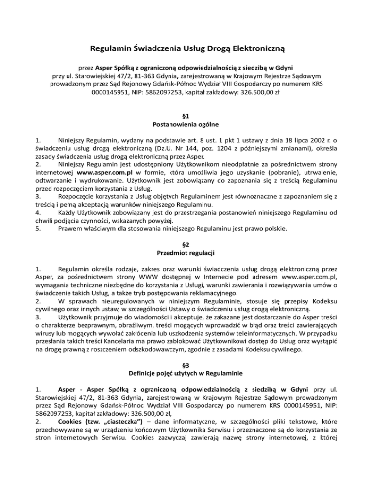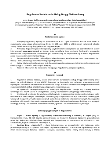 Regulamin Świadczenia Usług Drogą Elektroniczną przez Asper Spółką z ograniczoną odpowiedzialnością z siedzibą w Gdyni przy ul. Starowiejskiej 47/2, 81-363 Gdynia, zarejestrowaną w Krajowym Rejestrze Sądowym prowadzonym przez Sąd Rejonowy Gdańsk-Północ Wydział VIII Gospodarczy po numerem KRS 0000145951, NIP: 5862097253, kapitał zakładowy: 326.500,00 zł §1 Postanowienia ogólne 1. Niniejszy Regulamin, wydany na podstawie art. 8 ust. 1 pkt 1 ustawy z dnia 18 lipca 2002 r. o świadczeniu usług drogą elektroniczną (Dz.U. Nr 144, poz. 1204 z późniejszymi zmianami), określa zasady świadczenia usług drogą elektroniczną przez Asper. 2. Niniejszy Regulamin jest udostępniony Użytkownikom nieodpłatnie za pośrednictwem strony internetowej www.asper.com.pl w formie, która umożliwia jego uzyskanie (pobranie), utrwalenie, odtwarzanie i wydrukowanie. Użytkownik jest zobowiązany do zapoznania się z treścią Regulaminu przed rozpoczęciem korzystania z Usług. 3. Rozpoczęcie korzystania z Usług objętych Regulaminem jest równoznaczne z zapoznaniem się z treścią i pełną akceptacją warunków niniejszego Regulaminu. 4. Każdy Użytkownik zobowiązany jest do przestrzegania postanowień niniejszego Regulaminu od chwili podjęcia czynności, wskazanych powyżej. 5. Prawem właściwym dla stosowania niniejszego Regulaminu jest prawo polskie. §2 Przedmiot regulacji 1. Regulamin określa rodzaje, zakres oraz warunki świadczenia usług drogą elektroniczną przez Asper, za pośrednictwem strony WWW dostępnej w Internecie pod adresem www.asper.com.pl, wymagania techniczne niezbędne do korzystania z Usługi, warunki zawierania i rozwiązywania umów o świadczenie takich Usług, a także tryb postępowania reklamacyjnego. 2. W sprawach nieuregulowanych w niniejszym Regulaminie, stosuje się przepisy Kodeksu cywilnego oraz innych ustaw, w szczególności Ustawy o świadczeniu usług drogą elektroniczną. 3. Użytkownik przyjmuje do wiadomości i akceptuje, że zakazane jest dostarczanie do Asper treści o charakterze bezprawnym, obraźliwym, treści mogących wprowadzić w błąd oraz treści zawierających wirusy lub mogących wywołać zakłócenia lub uszkodzenia systemów teleinformatycznych. W przypadku przesłania takich treści Kancelaria ma prawo zablokować Użytkownikowi dostęp do Usług oraz wystąpić na drogę prawną z roszczeniem odszkodowawczym, zgodnie z zasadami Kodeksu cywilnego. §3 Definicje pojęć użytych w Regulaminie 1. Asper - Asper Spółką z ograniczoną odpowiedzialnością z siedzibą w Gdyni przy ul. Starowiejskiej 47/2, 81-363 Gdynia, zarejestrowaną w Krajowym Rejestrze Sądowym prowadzonym przez Sąd Rejonowy Gdańsk-Północ Wydział VIII Gospodarczy po numerem KRS 0000145951, NIP: 5862097253, kapitał zakładowy: 326.500,00 zł, 2. Cookies (tzw. „ciasteczka”) – dane informatyczne, w szczególności pliki tekstowe, które przechowywane są w urządzeniu końcowym Użytkownika Serwisu i przeznaczone są do korzystania ze stron internetowych Serwisu. Cookies zazwyczaj zawierają nazwę strony internetowej, z której pochodzą, czas przechowywania ich na urządzeniu końcowym oraz unikalny numer; 3. Kodeks cywilny – ustawa z dnia 23 kwietnia 1964 r. Kodeks cywilny (Dz.U. Nr 16, poz. 93 z późniejszymi zmianami). 4. Regulamin – niniejszy „Regulamin świadczenia usług drogą elektroniczną"; 5. Serwis – zorganizowana platforma informatyczno- informacyjna podłączona do sieci Internet stworzona przez Asper, umożliwiająca Użytkownikom korzystanie z mechanizmów informatycznych oraz informacji opracowanych przez Asper lub jej partnerów, w celu świadczenia usług drogą elektroniczną opisanych w niniejszym Regulaminie, dostępna pod adresem internetowym www.asper.com.pl; 6. Szkodliwe oprogramowanie – oprogramowanie, którego celem jest uzyskanie nieuprawnionego dostępu do systemu informatycznego lub oprogramowanie działające na szkodę Użytkownika lub Serwisu (np. wirusy, robaki, konie trojańskie, spyware, keyloggery, rootkity). 7. Usługa/Usługi – usługa/usługi świadczone przez Asper drogą elektroniczną, opisane w niniejszym Regulaminie. 8. Ustawa o ochronie danych osobowych – ustawa z dnia 29 sierpnia 1997 r. o ochronie danych osobowych (tekst jednolity Dz.U. z 2002 r. Nr 101, poz. 926 z późniejszymi zmianami). 9. Ustawa o świadczeniu usług drogą elektroniczną – ustawa z dnia 18 lipca 2002 r. o świadczeniu usług drogą elektroniczną (Dz.U. Nr 144, poz. 1204 z późniejszymi zmianami). 10. Użytkownik – osoba fizyczna posiadająca pełną zdolność do czynności prawnych, która w jakikolwiek sposób korzysta z Serwisu. §4 Rodzaje i Zakres Usług 1. Asper świadczy drogą elektroniczną następujące nieodpłatne Usługi: a) dostęp do informacji na temat działalności Asper i oferowanych przez Asper pożyczek gotówkowych; b) Korzystanie z aplikacji kontaktowych: „Formularz kontaktowy”, która umożliwia Użytkownikowi skontaktowanie się z Asper za pośrednictwem Serwisu, przy czym skorzystanie z tej aplikacji jest równoznaczne z wyrażeniem przez Użytkownika zgody na telefoniczny lub e-mailowy kontakt Konsultanta z Użytkownikiem; „Zamów rozmowę z konsultantem”, która umożliwia Użytkownikowi przekazanie do Asper zamówienia kontaktu z Konsultantem, przy czym takie zamówienie, jest równoznaczne z wyrażeniem przez Użytkownika zgody na telefoniczny lub e-mailowy kontakt Konsultanta z Użytkownikiem; „Złóż wniosek”, która umożliwia Użytkownikowi przekazanie do Asper informacji o tym, że Użytkownik jest zainteresowany zawarciem z Asper umowy pożyczki, przy czym złożenie wniosku nie stanowi oferty Użytkownika i nie skutkuje po stronie Asper obowiązkiem zawarcia z Użytkownikiem umowy pożyczki, a jednocześnie przy czym złożenie wniosku jest równoznaczne z wyrażeniem przez Użytkownika zgody na telefoniczny lub e-mailowy kontakt Konsultanta 