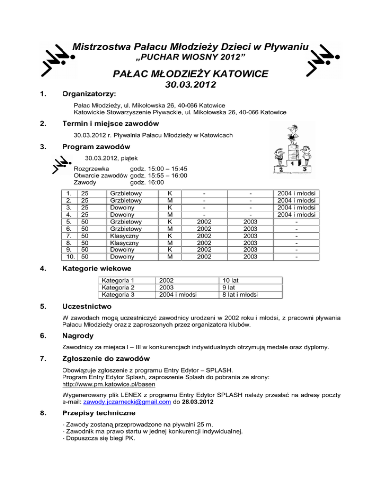 Mistrzostwa Pa acu M odzie y Dzieci w P ywaniu „PUCHAR WIOSNY 2012” PA AC M ODZIE Y KATOWICE 30.03.2012 1. Organizatorzy: Pa ac M odzie y, ul. Miko owska 26, 40-066 Katowice Katowickie Stowarzyszenie P ywackie, ul. Miko owska 26, 40-066 Katowice 2. Termin i miejsce zawodów 30.03.2012 r. P ywalnia Pa acu M odzie y w Katowicach 3. Program zawodów 30.03.2012, pi tek Rozgrzewka godz. 15:00 – 15:45 Otwarcie zawodów godz. 15:55 – 16:00 Zawody godz. 16:00 1. 2. 3. 4. 5. 6. 7. 8. 9. 10. 4. 25 25 25 25 50 50 50 50 50 50 Grzbietowy Grzbietowy Dowolny Dowolny Grzbietowy Grzbietowy Klasyczny Klasyczny Dowolny Dowolny 2002 2002 2002 2002 2002 2002 2003 2003 2003 2003 2003 2003 2004 i m odsi 2004 i m odsi 2004 i m odsi 2004 i m odsi - Kategorie wiekowe Kategoria 1 Kategoria 2 Kategoria 3 5. K M K M K M K M K M 2002 2003 2004 i m odsi 10 lat 9 lat 8 lat i m odsi Uczestnictwo W zawodach mog uczestniczy zawodnicy urodzeni w 2002 roku i m odsi, z pracowni p ywania Pa acu M odzie y oraz z zaproszonych przez organizatora klubów. 6. Nagrody Zawodnicy za miejsca I – III w konkurencjach indywidualnych otrzymuj medale oraz dyplomy. 7. Zg oszenie do zawodów Obowi zuje zg oszenie z programu Entry Edytor – SPLASH. Program Entry Edytor Splash, zaproszenie Splash do pobrania ze strony: http://www.pm.katowice.pl/basen Wygenerowany plik LENEX z programu Entry Edytor SPLASH nale y przes e-mail: [email protected] do 28.03.2012 8. Przepisy techniczne - Zawody zostan przeprowadzone na p ywalni 25 m. - Zawodnik ma prawo startu w jednej konkurencji indywidualnej. - Dopuszcza si biegi PK. na adresy poczty Skre lenia zawodników [email protected] 9. do godz. 20:00 29.03.2012 na adres e-mail: Sprawy organizacyjne Zapisy do zawodów prowadz trenerzy poszczególnych grup dydaktycznych pracowni p ywania Pa acu M odzie y oraz trenerzy z zaproszonych klubów. 10. O wiadczenie, stan zdrowia Jednocze nie z oddaniem zg osze , zaproszony klub, trener oraz opiekun zapewnia, e zg oszeni do tych zawodów uczestnicy posiadaj wa ne badania lekarskie (karty zdrowia sportowca) lub wiadczenia prawnych opiekunów. 11. Zasady finansowania Wszystkie koszty zwi zane z organizacj zawodów ponosi organizator. (nagrody, op aty startowe, komunikaty, komisja s dziowska) 12. Sprawy ró ne Wr czanie medali oraz dyplomów: na bie co podczas zawodów, po zako czeniu danej konkurencji. Wyniki z zawodów zostan opublikowane na stronie internetowej pracowni p ywania Wyniki poszczególnych konkurencji na bie co b wywieszane w holu p ywalni Organizator nie ponosi odpowiedzialno ci za rzeczy zagubione, jak równie szkody i wypadki. 13. Informacja Obs uga informatyczna zawodów: Jacek Czarnecki; e-mail: [email protected] Sprawy organizacyjne, zapisy zawodników, uczestników pracowni p ywania: trenerzy poszczególnych grup dydaktycznych. tel. 32 2516432 wew. 347 Kierownik Pracowni P ywania Jacek Czarnecki -2-