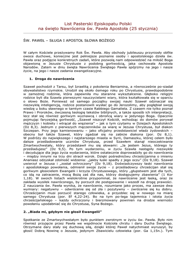 List Pasterski Episkopatu Polski na święto Nawrócenia św. Pawła Apostoła (25 stycznia) ŚW. PAWEŁ – SŁUGA I APOSTOŁ SŁOWA BOśEGO W całym Kościele przeŜywamy Rok Św. Pawła. Aby obchody jubileuszu przyniosły obfite owoce duchowe, konieczne jest pełniejsze poznanie osoby i apostolskiego dzieła św. Pawła oraz podjęcie konkretnych zadań, które pozwolą nam odpowiedzieć na miłość Boga objawioną w Jezusie Chrystusie z podobną gorliwością, jaka cechowała Apostoła Narodów. Zatem w dniu święta Nawrócenia Świętego Pawła spójrzmy na jego i nasze Ŝycie, na jego i nasze zadania ewangelizacyjne. 1. Droga do nawrócenia Szaweł pochodził z Tarsu, był Izraelitą z pokolenia Beniamina, a równocześnie po-siadał obywatelstwo rzymskie. Urodził się około ósmego roku po Chrystusie, prawdopodobnie w zamoŜnej rodzinie, która zapewniła mu staranne wykształcenie. Głęboko religijni rodzice byli dla Szawła pierwszymi nauczycielami wiary, która kształtowała się w oparciu o słowo BoŜe. PoniewaŜ od samego początku swojej nauki Szaweł odznaczał się niezwykłą inteligencją, rodzice postanowili wysłać go do Jerozolimy, aby pogłębiał swoją wiedzę u boku sławnego w tamtym czasie Rabbiego Gamaliela. Z czasem nie tylko poznał Prawo i Proroków, ówczesną teologię tekstów biblijnych, a takŜe sposób ich interpretacji, lecz stał się równieŜ gorliwym wyznawcą i obrońcą wiary w jedynego Boga. Opacznie pojmując faryzejską gorliwość, „Szaweł niszczył Kościół, wchodząc do domów porywał męŜczyzn i kobiety i wtrącał do więzienia” – jak o tym czytamy w Dziejach Apostolskich (Dz 8,3). Jednym z pierwszych męczenników za wiarę w Jezusa Chrystusa, był diakon Szczepan. Przy jego kamienowaniu – jako oficjalny przedstawiciel władz Ŝydowskich – obecny był takŜe Szaweł, który zgadzał się na zabicie diakona (por. Dz 8,1). W podróŜy do największego i najstarszego miasta w Syrii, Damaszku, której celem było dalsze prześladowanie uczniów Chrystusa, przed Szawłem stanął nieoczekiwanie Zmartwychwstały, który przedstawił mu się słowami: „Ja jestem Jezus, którego ty prześladujesz” (Dz 9,5). Po tym wydarzeniu, w Ŝyciu Szawła nastąpiły niezwykłe i decydujące dla jego Ŝycia wydarzenia, które ostatecznie doprowadziły go do nawrócenia – między innymi na trzy dni stracił wzrok. Dzięki pośrednictwu chrześcijanina o imieniu Ananiasz odzyskał zdolność widzenia: „jakby łuski spadły z jego oczu” (Dz 9,18). Szaweł uwierzył w Jezusa i „został ochrzczony” (Dz 9,18). Doświadczywszy łaski nawrócenia i apostolskiego powołania, odmienił swoje Ŝycie – z prześladowcy chrześcijan stał się gorliwym głosicielem Ewangelii i krzyŜa Chrystusowego, który „głupstwem jest dla tych, co idą na zatracenie, mocą BoŜą zaś dla nas, którzy dostępujemy zbawienia” (1 Kor 1,18). W swoich listach wielokrotnie przypominał, Ŝe nawrócenie jest łaską, oraz Ŝe zakłada wysiłek nawróconego, by porzucił złe postępowanie i wszedł na drogę prawości. Z nauczania św. Pawła wynika, Ŝe nawrócenie, rozumiane jako proces, ma zawsze dwa wymiary: negatywny – odwrócenie się od zła i pozytywny – zwrócenie się ku dobru. Chrześcijanin musi porzucić starego człowieka, a przyoblec się w nowego na miarę samego Chrystusa (por. Ef 4,22-24). Bo na tym po-lega tajemnica i istota Ŝycia chrześcijańskiego – kaŜdy ochrzczony i bierzmowany powinien na drodze wierności powołaniu upodabniać się do Chrystusa, Syna BoŜego. 2. „Biada mi, gdybym nie głosił Ewangelii” Spotkanie ze Zmartwychwstałym było punktem zwrotnym w Ŝyciu św. Pawła. Było nim równieŜ przyjęcie przez Pawła we wspólnocie Kościoła chrztu i daru Ducha Świętego. Otrzymane dary stały się duchową siłą, dzięki której Paweł natychmiast wyruszył, by głosić Dobrą Nowinę o Jezusie, jedynym Zbawicielu człowieka (por. Ga 1,15n.). Tym samym odpowiedział na wezwanie Jezusa, skierowane do apostołów: „Idźcie na cały świat i głoście Ewangelię wszelkiemu stworzeniu” (Mk 16,15). Św. Paweł uznawał głoszenie Dobrej No-winy za najwaŜniejsze zadanie ucznia Jezusa. Mówił: „Biada mi, gdybym nie głosił Ewangelii” (1 Kor 9,16). Apostoł miał świadomość, Ŝe nawrócenie jest łaską, daną człowiekowi dla innych, dla wspólnoty Kościoła. Kto się nawrócił, powinien dzielić się otrzymanym darem nowego Ŝycia. Paweł czynił to, głosząc Ŝe UkrzyŜowany i Zmartwychwstały Jezus jest Panem (por. Rz 10,9). Do głoszenia słowa BoŜego i jednocześnie karmienia się nim Apostoł wzywał wszystkich swoich uczniów. Pisząc do biskupa Efezu Tymoteusza, pouczał i zachęcał go, by był wzorem „w mowie, w obejściu, w miłości, w wierze, w czystości!” (1 Tm 4,12), ale w sposób szczególny, aby przykładał się „do czytania, zachęcania, nauki” (1 Tm 4,13). To bowiem czyniąc, i siebie samego zbawi, i tych, którzy będą go słuchać (por. 1 Tm 4,16). Wzywając do takiego działania, Paweł wskazywał, Ŝe fundamentem nauczania i wszelkiego dobrego czynu jest słowo BoŜe. Tylko ono moŜe „nauczyć mądrości wiodącej ku zbawieniu przez wiarę w Chrystusie Jezusie” (2 Tm 3,15). Z całą mocą podkreślał, iŜ „wszelkie Pismo od Boga natchnione jest i poŜyteczne do nauczania, do przekonywania, do poprawiania, do kształcenia w sprawiedliwości – aby człowiek BoŜy był doskonały, przysposobiony do kaŜdego dobrego czynu” (2 Tm 3,16). Głoszenie słowa wymaga prorockiego zapału, entuzjazmu i odwagi: „Zaklinam cię wobec Boga i Chrystusa Jezusa, który będzie sądził Ŝywych i umarłych, i na Jego pojawienie się, i na Jego królestwo: głoś naukę, nastawaj w porę, nie w porę, w razie potrzeby wykaŜ błąd, poucz, podnieś na duchu z całą cierpliwością, ilekroć nauczasz. Czuwaj we wszystkim, znoś trudy, wykonaj dzieło ewangelisty, s