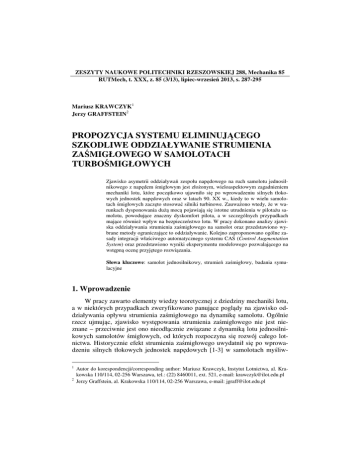 ZESZYTY NAUKOWE POLITECHNIKI RZESZOWSKIEJ 288, Mechanika 85 RUTMech, t. XXX, z. 85 (3/13), lipiec-wrzesień 2013, s. 287-295 Mariusz KRAWCZYK1 Jerzy GRAFFSTEIN2 PROPOZYCJA SYSTEMU ELIMINUJĄCEGO SZKODLIWE ODDZIAŁYWANIE STRUMIENIA ZAŚMIGŁOWEGO W SAMOLOTACH TURBOŚMIGŁOWYCH Zjawisko asymetrii oddziaływań zespołu napędowego na ruch samolotu jednosilnikowego z napędem śmigłowym jest złożonym, wieloaspektowym zagadnieniem mechaniki lotu, które początkowo ujawniło się po wprowadzeniu silnych tłokowych jednostek napędowych oraz w latach 90. XX w., kiedy to w wielu samolotach śmigłowych zaczęto stosować silniki turbinowe. Zauważono wtedy, że w warunkach dysponowania dużą mocą pojawiają się istotne utrudnienia w pilotażu samolotu, powodujące znaczny dyskomfort pilota, a w szczególnych przypadkach mające również wpływ na bezpieczeństwo lotu. W pracy dokonano analizy zjawiska oddziaływania strumienia zaśmigłowego na samolot oraz przedstawiono wybrane metody ograniczające to oddziaływanie. Kolejno zaproponowano ogólne zasady integracji właściwego automatycznego systemu CAS (Control Augmentation System) oraz przedstawiono wyniki eksperymentu modelowego pozwalającego na wstępną ocenę przyjętego rozwiązania. Słowa kluczowe: samolot jednosilnikowy, strumień zaśmigłowy, badania symulacyjne 1. Wprowadzenie W pracy zawarto elementy wiedzy teoretycznej z dziedziny mechaniki lotu, a w niektórych przypadkach zweryfikowano panujące poglądy na zjawisko oddziaływania opływu strumienia zaśmigłowego na dynamikę samolotu. Ogólnie rzecz ujmując, zjawisko występowania strumienia zaśmigłowego nie jest nieznane – przeciwnie jest ono nieodłącznie związane z dynamiką lotu jednosilnikowych samolotów śmigłowych, od których rozpoczyna się rozwój całego lotnictwa. Historycznie efekt strumienia zaśmigłowego uwydatnił się po wprowadzeniu silnych tłokowych jednostek napędowych [1-3] w samolotach myśliw1 2 Autor do korespondencji/corresponding author: Mariusz Krawczyk, Instytut Lotnictwa, al. Krakowska 110/114, 02-256 Warszawa, tel.: (22) 8460011, ext. 521, e-mail: [email protected] Jerzy Graffstein, al. Krakowska 110/114, 02-256 Warszawa, e-mail: [email protected] 288 M. Krawczyk, J. Graffstein skich wykorzystywanych podczas II wojny światowej oraz w latach 90., kiedy to w wielu samolotach śmigłowych zaczęto stosować silniki turbinowe. Wtedy też zauważono, że w warunkach dysponowania dużą mocą pojawiają się istotne utrudnienia w pilotażu samolotu, powodujące znaczny dyskomfort pilota, a w szczególnych przypadkach mające wpływ na bezpieczeństwo lotu. Jako przykład można wymienić dwa samoloty szkolne (wykorzystywane w Polsce i USA): PZL-130TC-III Orlik oraz Beechcraft T-6 Texan II (rys. 1.). Każdy z nich wyposażono w silnik Pratt & Whitney Canada PT6A o mocach odpowiednio 560 kW i 840 kW. Zjawisko efektu zaśmigłowego zostało więc zaobserwowane stosunkowo dawno, niemniej należy stwierdzić, że adekwatna wiedza teoretyczna nie powstawała spójnie wraz z dynamicznym rozwojem całej awiacji. Może dlatego w „bibliach” mechaników lotu [1, 2] zjawisku temu poświęcono zaledwie parę akapitów, w których zamanifestowano właściwie jedynie jego fakt istnienia. a) b) Rys. 1. Samoloty turbośmigłowe: PZL-130TC-III Orlik (a) oraz Beechcraft T-6 Texan II (b) Fig. 1. Turboprop airplanes: PZL-130TC-III Orlik (a) and Beechcraft T-6 Texan II (b) W pracy dokonano analizy zjawiska oddziaływania strumienia zaśmigłowego na samolot oraz przedstawiono wybrane metody ograniczające to oddziaływanie. Kolejno zaproponowano ogólne zasady integracji automatycznego systemu klasy CAS oraz przedstawiono wyniki eksperymentu modelowego pozwalającego na wstępną ocenę przyjętego rozwiązania. 2. Zjawisko efektu zaśmigłowego W samolotach jednosilnikowych napędzanych śmigłem ciągnącym przyczyną asymetrii oddziaływań zespołu napędowego na samolot są następujące zjawiska: • niesymetryczny opływ samolotu przez strumień zaśmigłowy SSE (Side Slip Effect), który w związku z obrotem śmigła także obraca się wokół Propozycja systemu eliminującego szkodliwe oddziaływanie ... 289 osi podłużnej układu odniesienia związanego z samolotem (rys. 2.), powodując niesymetryczny opływ statecznika pionowego, generujący w konsekwencji moment odchylający działający na samolot, • tzw. efekt P (P-effect), tj. wystąpienie składowej poprzecznej siły (generującej moment odchylający), wywołany różnym od prostopadłego kierunkiem napływu powietrza na płaszczyznę obrotu śmigła, co jest związane z różną wartością kąta natarcia podczas obrotu śmigła, • oddziaływanie reakcyjne wywoływane przez opór powietrza przeciwdziałający ruchowi obrotowemu śmigła, wywołujące moment przechylający, • efekt giroskopowy wywoływany przez wirujące elementy zespołu napędowego. Rys. 2. Asymetryczne oddziaływanie strumienia zaśmigłowego w samolocie Beechcraft T-6 Texan II, na podstawie [2] Fig. 2. Asymmetric action of slipstream in Beechcraft T-6 Texan II airplane, according to [2] Rezultatem wypadkowym tych zjawisk jest asymetryczne zachowanie samolotu względem płaszczyzny symetrii samolotu, które ujawnia się zarówno podczas wykonywania manewrów, jak też w ustalonym locie prostoliniowym przy zmianach mocy, z jaką pracuje zespół napędowy. Doświadczony pilot, przeszkolony na samolotach jednosilnikowych z napędem śmigłowym i przyzwyczajony do ich specyfiki, doskonale orientuje się w mechanizmach powstawania omawianego zjawiska i zwykle potrafi je kompensować zarówno w locie ustalonym, jak też podczas akrobacji. W przypadku samolotów szkolno-treningowych sytuacja jest jednak bardziej złożona. Zgodnie z tendencjami panującymi na świecie szkolenie pilotów wojskowych rozpoczyna się od jednosilnikowych samolotów z napędem śmigłowym, 290 M. Krawczyk, J. Graffstein specjalnie s