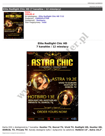 Informacje o produkcie Utworzono 07-03-2017 Elite Redlight Chic HD (7 kanałów / 12 miesięcy) Cena : 339,00 zł w w w .c ar d sp lit te r Elite Redlight Chic HD 7 kanałów / 12 miesięcy .p l Nr katalogowy : Elite Redlight Chic HD 7/12 Producent : CARDSPLITTER Dostępność : Dostępny Stan magazynowy : niski Karta XXX z dostępnością 7 kanałów: Hustler TV, Dorcel TV, Vivid TV, Redlight HD, Hustler HD, DORCEL TV, Private TV. Kanały dostępne tylko i wyłącznie na satelicie: Hotbird 13°, Astra 19,2°. Wygenerowano w programie www.oscGold.com Karta działa we wszystkich modułach Viaccess oraz odbiornikach satelitarnych z uniwersalnym czytnikiem kart współpracujących w systemie Viaccess. Wymagany dekoder HD. Karta z 12 miesięcznym dostępem. Dostępne kanały: ● Dorcel TV - erotyka nadawana od 22.30 do 6.00 parametry odbioru: Astra 19,2°, Częstotliwość: 12285; Symbol Rate: 29700; polaryzacja: pionowa V; ● Hustler TV - erotyka nadawana 24godz. na dobę (wymagany odbiornik HD) VIVID TV - erotyka nadawana 24godz. na dobę (wymagany odbiornik HD) sp lit te r ● .p l parametry odbioru: Astra 19,2°, Częstotliwość: 12721; Symbol Rate: 23500; polaryzacja: pozioma H; parametry odbioru: Astra 19,2°, Częstotliwość: 12515; Symbol Rate: 22000; Polaryzacja: pozioma H; ● Redlight HD, HD Hustler HD parametry odbioru: Hotbird 13°, Częstotliwość: 11662; Symbol Rate: 27500; polaryzacja: pionowa V; ● TV Dorcel Private TV w .c parametry odbioru: Hotbird 13°, Częstotliwość: 11179; Symbol Rate: 27500; Polaryzacja: pozioma H; Uwaga!!! w w ● ar d parametry odbioru: Hotbird 13°, Częstotliwość: 12322; Symbol Rate: 27500; Polaryzacja: pozioma H; Brak gwarancji za zmiany ilościowe nadawania kanałów, zmiany nazw kanałów oraz ich pozycji na satelicie. W przypadku całkowitego wygaśnięcia karty przed upływem ważności, wymieniamy kartę na nową o podobnej liczbie kanałów, rozliczając niewykorzystany okres z wygasłej karty. Jesteśmy dystrybutorem kart erotycznych już od ponad 10 lat.