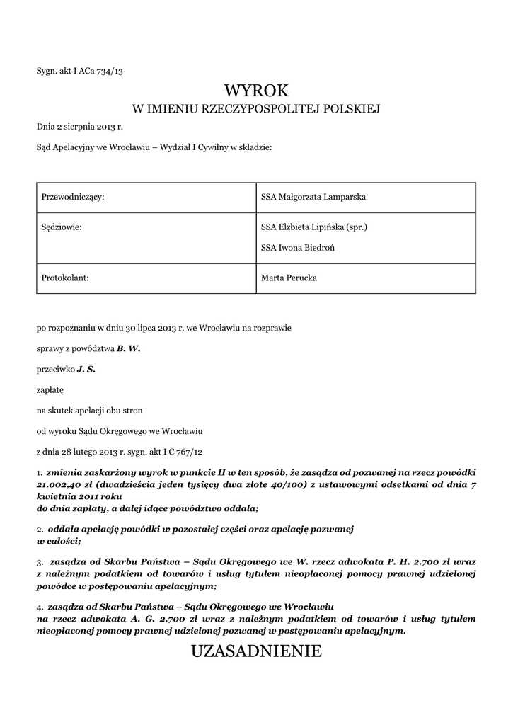 Sygn. akt I ACa 734/13 WYROK W IMIENIU RZECZYPOSPOLITEJ POLSKIEJ Dnia 2 sierpnia 2013 r. Sąd Apelacyjny we Wrocławiu – Wydział I Cywilny w składzie: Przewodniczący: SSA Małgorzata Lamparska Sędziowie: SSA Elżbieta Lipińska (spr.) SSA Iwona Biedroń Protokolant: Marta Perucka po rozpoznaniu w dniu 30 lipca 2013 r. we Wrocławiu na rozprawie sprawy z powództwa B. W. przeciwko J. S. zapłatę na skutek apelacji obu stron od wyroku Sądu Okręgowego we Wrocławiu z dnia 28 lutego 2013 r. sygn. akt I C 767/12 1. zmienia zaskarżony wyrok w punkcie II w ten sposób, że zasądza od pozwanej na rzecz powódki 21.002,40 zł (dwadzieścia jeden tysięcy dwa złote 40/100) z ustawowymi odsetkami od dnia 7 kwietnia 2011 roku do dnia zapłaty, a dalej idące powództwo oddala; 2. oddala apelację powódki w pozostałej części oraz apelację pozwanej w całości; 3. zasądza od Skarbu Państwa – Sądu Okręgowego we W. rzecz adwokata P. H. 2.700 zł wraz z należnym podatkiem od towarów i usług tytułem nieopłaconej pomocy prawnej udzielonej powódce w postępowaniu apelacyjnym; 4. zasądza od Skarbu Państwa – Sądu Okręgowego we Wrocławiu na rzecz adwokata A. G. 2.700 zł wraz z należnym podatkiem od towarów i usług tytułem nieopłaconej pomocy prawnej udzielonej pozwanej w postępowaniu apelacyjnym. UZASADNIENIE Wyrokiem z dnia 28 lutego 2013 r. Sąd Okręgowy we Wrocławiu zasądził od pozwanej na rzecz powódki 33.300,56 zł z ustawowymi odsetkami od kwoty 14.997,60 zł. od dnia 7 kwietnia 2011 r. i od kwoty 18.302,96 zł. od dnia 30 listopada 2011 r. do dnia zapłaty, a w pozostałej części powództwo oddalił. Sąd ten ustalił następujący stan faktyczny: Z. Z. (1) z nieformalnego związku z M. Ś. miał córkę – powódkę B. Ś., urodzoną dnia (...) 14.07.1979 r. zawarła ona związek małżeński z A. W., przyjmując jego nazwisko. Powódka utrzymywała sporadyczne kontakty z ojcem i nie kontaktowała się z członkami jego rodziny. Powódka ostatni raz widziała się z ojcem w 2003 roku. Z. Z. (1) miał czworo rodzeństwa: A. Z., J. Z. (1), S. Z. oraz pozwaną J. Z. (2) (S.). Na podstawie postanowienia Sądu Powiatowego w O. z dnia 18.02.1958 r. (sygn. akt: Ns 7/58) odziedziczyli oni po zmarłym w dniu 2.12.1947 r. ojcu K. Z. nieruchomość położną w Z. w gminie O., oznaczoną jako działka nr (...) o powierzchni 0,20 ha zabudowana budynkami gospodarczymi oraz domem mieszkalnym o powierzchni około 50-70 m2. Udziały w nieruchomości każdego z rodzeństwa wynosiły po ¼. W dniu 26.09.1969 r. Sąd Powiatowy w O. Cywilny uzupełnił postanowienie z dnia 18.02.1958 r. stwierdzając, że prawo do udziału wynoszącego ½ części w gospodarstwie rolnym położonym w Z. o powierzchni 7,45 ha na mocy ustawy dziedziczy Z. Z. (1). Gospodarstwo rolne w latach siedemdziesiątych przeszło na własność Skarbu Państwa z uwagi na zaległości podatkowe. Działka nr (...), na której wybudowane były nieruchomości, uległa później podziałowi na działkę nr (...) o powierzchni 807 m( 2) opisaną w KW nr (...) oraz nr (...) o powierzchni 1193 m( 2) opisaną w KW nr (...). Kontakty z Z. Z. (1) utrzymywała tylko pozwana. Udzielała mu ona pomocy materialnej pożyczając pieniądze na opłacenie rachunków oraz na leki i inne wydatki. Z. Z. (1) zmarł dnia 22.01.2005 r. Przed śmiercią nie uregulował nakazu płatniczego dotyczącego podatku od nieruchomości. Pozwana została przez zakład pogrzebowy obciążona fakturą VAT nr (...) na kwotę 922,34 zł, w późniejszym czasie pobrała ona zasiłek pogrzebowy w wysokości 4.539,86 zł. Postanowieniem z dnia 23.06.2005 r. Sąd Rejonowy w O. (sygn. akt I Ns 93/05) stwierdził, że spadek po zmarłym Z. Z. (1) zmarłym w dniu 22.01.2005 r. w Z. gmina O. i tamże ostatnio zamieszkałym, na podstawie ustawy nabyła jego siostra J. S. w całości i wprost. Powódka dowiedziała się o śmierci ojca od znajomych. Na skutek jej wniosku postanowieniem z dnia 24.07.2008 r. zmieniono postanowienie o stwierdzeniu nabycia spadku z dnia 23.06.2005 r. w sprawie o sygn. akt I Ns 93/05 w ten sposób, że stwierdzono, iż spadek po zmarłym Z. Z. (1) zmarłym w dniu 22.01.2005 r. w Z. w gminie O. i tamże ostatnio stale zamieszkałym, na podstawie ustawy nabyła córka B. W. w całości wprost. W piśmie z dnia 2.08.2011 r. Bank (...) S.A. poinformował pozwaną, że prowadził na rzecz Z. Z. (1) książeczki oszczędnościowe, które w dniu 5.10.2005 r. zostały zlikwidowane. Ich salda wynosiły łącznie 18.302,96 zł. W dniu 28.12.2006 r. własność zabudowanej nieruchomości położonej w Z., oznaczonej w ewidencji jako działka nr (...) o powierzchni 0,20 ha, współwłaściciele opisanej nieruchomości Z. Z. (2) (s. J., który miał 1/6 spadku wg zapisu w księdze wieczystej) oraz J. S. przenieśli na A. i D. L., łącznie z częścią, którą A. – 1/6 – darowała pozwanej). Cenę sprzedaży nieruchomości określono na 25.000 zł. Według opinii biegłego wartość rynkowa tej nieruchomości według stanu z dnia otwarcia spadku po zmarłym Z. Z. (1) wynosiła 72.000 zł. W dniu 13.04.2011 r. pozwana przekazała powódce kwotę 6.250 zł. Powódka zwróciła otrzymaną kwotę. Przy takich ustaleniach Sąd Okręgowy uznał, że powództwo jest częściowo uzasadnione, nie jest jednak uzasadniona kwota, jakiej zasądzenia powódka się domaga. Wartość nieruchomości położonej w Z., jaką posiadał przed śmiercią Z. Z. (1), Sąd ustalił na podstawie opinii biegłego sądowego z zakresu szacowania nieruchomości na kwotę 72.000 zł. Strony nie wnosiły zastrzeżeń do treści tej opinii, podstaw jej sporządzenia ani też wartości nieruchomości wskazanej przez biegłego. Sąd również uznał, że została ona sporządzona w sposób prawidłowy i rzetelny i przyjął wyliczoną przez biegłego wartość za podstawę wyrokowania. W ocenie Sądu dokumenty sprawy dowodziły, wbrew temu, co twierdziła powódka