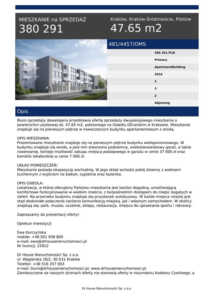 MIESZKANIE na SPRZEDAŻ 380 291 Kraków, Kraków-Śródmieście, Pilotów 47.65 m2 481/4457/OMS 380 291 PLN Primary ApartmentBuilding 2016 1 3 2 Adjoining Opis Biuro sprzedaży dewelopera przedstawia ofertę sprzedaży dwupokojowego mieszkania o powierzchni użytkowej ok. 47,65 m2, położonego na Osiedlu Oficerskim w Krakowie. Mieszkanie znajduje się na pierwszym piętrze w nowoczesnym budynku apartamentowym z windą. OPIS MIESZKANIA: Prezentowane mieszkanie znajduje się na pierwszym piętrze budynku wielopoziomowego. W budynku znajduje się winda, a pod nim stworzono podziemny, wielostanowiskowy garaż, a także rowerownię. Istnieje możliwość zakupu miejsca postojowego w garażu w cenie 37 000 zł oraz komórki lokatorskiej w cenie 7 000 zł. UKŁAD POMIESZCZEŃ: Mieszkanie posiada ekspozycję wschodnią. W jego skład wchodzi pokój dzienny z aneksem kuchennym z wyjściem na balkon, sypialnia oraz łazienka. OPIS OSIEDLA: Lokalizacja, w której oferujemy Państwu mieszkania jest bardzo dogodną, umożliwiającą komfortowe funkcjonowanie w wielkim mieście, z bezpośrednim dostępem do miejsc bogatych w zieleń. Na przeciwko budynku znajduje się przystanek autobusowy. W każde miejsce miasta jest stąd doskonałe połączenie zarówno komunikacją miejską, jak i własnym samochodem. W okolicy znajdują się: park, muzea, uczelnie, sklepy, restauracja, miejsca do uprawiania sportu i rekreacji. Zapraszamy do prezentacji oferty! Opiekun inwestycji: Ewa Korczyńska mobile: +48 501 938 800 e-mail: [email protected] Nr licencji: 22912 Dr House Nieruchomości Sp. z o.o. ul. Węgierska 16/2, 30-531 Kraków Telefon: +48 516 257 003 e-mail: [email protected], www.drhousenieruchomosci.pl Zamieszczone na naszych stronach oferty nie stanowią oferty w rozumieniu Kodeksu Cywilnego, a Dr House Nieruchomości Sp. z o.o. dane w nich zawarte mają jedynie charakter informacyjny. Ewa Korczyńska tel. +48 501 938 800 email: [email protected] Dr House Nieruchomości Sp. z o.o. Powered by TCPDF (www.tcpdf.org)