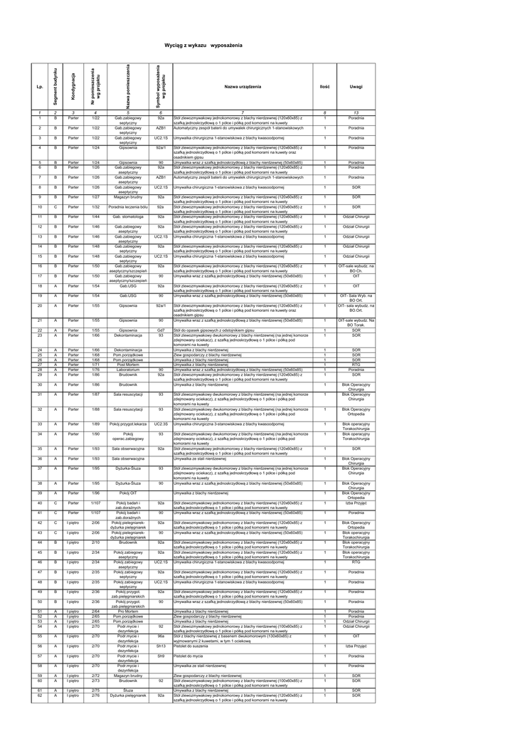 Symbol wyposażenia wg projektu 2 3 4 5 6 1 B Parter 1/22 92a 2 B Parter 1/22 3 B Parter 1/22 4 B Parter 1/24 Gab.zabiegowy septyczny Gab.zabiegowy septyczny Gab.zabiegowy septyczny Gipsownia 5 6 B B Parter Parter 1/24 1/26 7 B Parter 1/26 8 B Parter 1/26 9 B Parter 1/27 Gipsownia Gab.zabiegowy aseptyczny Gab.zabiegowy aseptyczny Gab.zabiegowy aseptyczny Magazyn brudny 10 C Parter 1/32 Poradnia leczenia bólu 92a 11 B Parter 1/44 Gab. stomatologa 92a 12 B Parter 1/46 92a 13 B Parter 1/46 14 B Parter 1/48 15 B Parter 1/48 16 B Parter 1/50 17 B Parter 1/50 18 A Parter 1/54 Gab.zabiegowy aseptyczny Gab.zabiegowy aseptyczny Gab.zabiegowy septyczny Gab.zabiegowy septyczny Gab.zabiegowy aseptyczny/szczepień Gab.zabiegowy aseptyczny/szczepień Gab.USG 19 A Parter 1/54 Gab.USG 90 20 A Parter 1/55 Gipsownia 92a/1 21 A Parter 1/55 Gipsownia 90 22 23 A A Parter Parter 1/55 1/66 Gipsownia Dekontaminacja Gd7 93 24 25 26 27 28 29 A A A A A A Parter Parter Parter Parter Parter Parter 1/66 1/68 1/68 1/71 1/76 1/86 Dekontaminacja Pom.porządkowe Pom.porządkowe Post Mortem Laboratorium Brudownik 30 A Parter 1/86 Brudownik 31 A Parter 1/87 Sala resuscytacji 93 32 A Parter 1/88 Sala resuscytacji 93 33 A Parter 1/89 Pokój przygot.lekarza UC2.3S 34 A Parter 1/90 Pokój operac.zabiegowy 93 35 A Parter 1/93 Sala obserwacyjna 92a 36 A Parter 1/93 Sala obserwacyjna 37 A Parter 1/95 Dyżurka-Śluza 93 38 A Parter 1/95 Dyżurka-Śluza 90 39 A Parter 1/96 Pokój OIT 40 C Parter 1/107 92a 41 C Parter 1/107 42 C I piętro 2/06 43 C I piętro 2/06 44 B I piętro 2/10 Pokój badań i zab.doraźnych Pokój badań i zab.doraźnych Pokój pielegniarekdyżurka pielęgniarek Pokój pielegniarekdyżurka pielęgniarek Brudownik 45 B I piętro 2/34 92a 46 B I piętro 2/34 47 B I piętro 2/35 48 B I piętro 2/35 49 B I piętro 2/36 50 B I piętro 2/36 51 52 53 54 A A A A I piętro I piętro I piętro I piętro 2/64 2/65 2/65 2/70 55 A I piętro 2/70 56 A I piętro 2/70 57 A I piętro 2/70 58 A I piętro 2/70 59 60 A A I piętro I piętro 2/72 2/73 Pokój zabiegowy aseptyczny Pokój zabiegowy aseptyczny Pokój zabiegowy septyczny Pokój zabiegowy septyczny Pokój przygot. zab.pielęgniarskich Pokój przygot. zab.pielęgniarskich Pro Mortem Pom.porządkowe Pom.porządkowe Podr.mycie i dezynfekcja Podr.mycie i dezynfekcja Podr.mycie i dezynfekcja Podr.mycie i dezynfekcja Podr.mycie i dezynfekcja Magazyn brudny Brudownik 61 62 A A I piętro I piętro 2/75 2/76 Śluza Dyżurka pielęgniarek Nr pomieszczenia wg projektu 1 Kondygnacja Lp. Segment budynku Nazwa pomieszczenia Wyciąg z wykazu wyposażenia Nazwa urządzenia Ilość 7 Uwagi 8 13 Stół zlewozmywakowy jednokomorowy z blachy nierdzewnej (120x60x85) z szafką jednoskrzydłową o 1 półce i półką pod komorami na kuwety Automatyczny zespół baterii do umywalek chirurgicznych 1-stanowiskowych 1 Poradnia 1 Poradnia Umywalka chirurgiczna 1-stanowiskowa z blachy kwasoodpornej 1 Poradnia Stół zlewozmywakowy jednokomorowy z blachy nierdzewnej (120x60x85) z szafką jednoskrzydłową o 1 półce i półką pod komorami na kuwety oraz osadnikiem gipsu Umywalka wraz z szafką jednoskrzydłową z blachy nierdzewnej (50x60x85) Stół zlewozmywakowy jednokomorowy z blachy nierdzewnej (120x60x85) z szafką jednoskrzydłową o 1 półce i półką pod komorami na kuwety Automatyczny zespół baterii do umywalek chirurgicznych 1-stanowiskowych 1 Poradnia 1 1 Poradnia Poradnia 1 Poradnia Umywalka chirurgiczna 1-stanowiskowa z blachy kwasoodpornej 1 SOR Stół zlewozmywakowy jednokomorowy z blachy nierdzewnej (120x60x85) z szafką jednoskrzydłową o 1 półce i półką pod komorami na kuwety Stół zlewozmywakowy jednokomorowy z blachy nierdzewnej (120x60x85) z szafką jednoskrzydłową o 1 półce i półką pod komorami na kuwety Stół zlewozmywakowy jednokomorowy z blachy nierdzewnej (120x60x85) z szafką jednoskrzydłową o 1 półce i półką pod komorami na kuwety Stół zlewozmywakowy jednokomorowy z blachy nierdzewnej (120x60x85) z szafką jednoskrzydłową o 1 półce i półką pod komorami na kuwety Umywalka chirurgiczna 1-stanowiskowa z blachy kwasoodpornej 1 SOR 1 SOR 1 Odział Chirurgii 1 Odział Chirurgii 1 Odział Chirurgii Stół zlewozmywakowy jednokomorowy z blachy nierdzewnej (120x60x85) z szafką jednoskrzydłową o 1 półce i półką pod komorami na kuwety Umywalka chirurgiczna 1-stanowiskowa z blachy kwasoodpornej 1 Odział Chirurgii 1 Odział Chirurgii Stół zlewozmywakowy jednokomorowy z blachy nierdzewnej (120x60x85) z szafką jednoskrzydłową o 1 półce i półką pod komorami na kuwety Umywalka wraz z szafką jednoskrzydłową z blachy nierdzewnej (50x60x85) 1 1 OIT-sale wybudz. na BO Ch. OIT Stół zlewozmywakowy jednokomorowy z blachy nierdzewnej (120x60x85) z szafką jednoskrzydłową o 1 półce i półką pod komorami na kuwety Umywalka wraz z szafką jednoskrzydłową z blachy nierdzewnej (50x60x85) 1 OIT 1 Stół zlewozmywakowy jednokomorowy z blachy nierdzewnej (120x60x85) z szafką jednoskrzydłową o 1 półce i półką pod komorami na kuwety oraz osadnikiem gipsu Umywalka wraz z szafką jednoskrzydłową z blachy nierdzewnej (50x60x85) 1 OIT- Sala Wyb. na BO Ort. OIT- sala wybudz. na BO.Ort. Stół do opasek gipsowych z odstojnikiem gipsu Stół zlewozmywakowy dwukomorowy z blachy nierdzewnej (na jednej komorze zdejmowany ociekacz), z szafką jednoskrzydłową o 1 półce i półką pod komorami na kuwety Umywalka z blachy nierdzewnej Zlew gospodarczy z blachy nierdzewnej Umywalka z blachy nierdzewnej Umywalka z blachy nierdzewnej Umywalka wraz z szafką jednoskrzydłową z blachy nierdzewnej (50x60x85) Stół zlewozmywakowy jednokomorowy z blachy nierdzewnej (120x60x85) z szafką jednoskrzydłową o 1 półce i półką pod komorami na kuwety Umywalka z blachy nierdzewnej 1 1 OIT-sale wybudz. Na BO Torak. SOR SOR 1 1 1 1 1 1 SOR SOR SOR RTG Poradnia SOR 1 Stół zlewozmywakowy dwukomorowy z blachy nierdzewnej (na jednej komorze zdejmowa