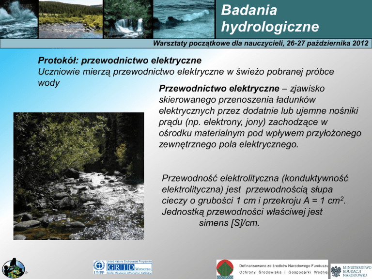 Badania hydrologiczne Warsztaty początkowe dla nauczycieli, 26-27 października 2012 Protokół: przewodnictwo elektryczne Uczniowie mierzą przewodnictwo elektryczne w świeżo pobranej próbce wody Przewodnictwo elektryczne – zjawisko skierowanego przenoszenia ładunków elektrycznych przez dodatnie lub ujemne nośniki prądu (np. elektrony, jony) zachodzące w ośrodku materialnym pod wpływem przyłożonego zewnętrznego pola elektrycznego. Przewodność elektrolityczna (konduktywność elektrolityczna) jest przewodnością słupa cieczy o grubości 1 cm i przekroju A = 1 cm2. Jednostką przewodności właściwej jest simens [S]/cm. Badania hydrologiczne Warsztaty początkowe dla nauczycieli, 26-27 października 2012 •Jak przewodnictwo elektryczne wody w miejscu wykonywania pomiarów zmienia się w ciągu roku? •W jaki sposób deszcz lub topnienie śniegu wpływa na przewodność? •Jakie działalności człowieka mają wpływ na przewodność wody w miejscu wykonywania pomiarów? Badania hydrologiczne Warsztaty początkowe dla nauczycieli, 26-27 października 2012 Pozwala ocenić jakość wody pod względem zawartości w niej wszystkich obcych substancji – Przewodność próbki wody jest miarą jej możliwości przewodzenia prądu elektrycznego. – Im więcej substancji rozpuszczonych, tym większe przewodnictwo elektryczne. – Przewodnictwo jest pośrednią miarą ilości substancji rozpuszczonych. – Przewodność wyrażana jest w µS/cm. – Temperatura ma wpływ na przewodność i przyrządy muszą być kompensowane temperaturowo. Badania hydrologiczne Warsztaty początkowe dla nauczycieli, 26-27 października 2012 Istotne wartości – Do użytku domowego woda ma korzystnie przewodność poniżej 1100 µS/cm. – W rolnictwie i przemyśle woda ma korzystnie przewodność poniżej 2200-2600 µS/cm . – TDS (ppm) Przewodność x 0.67 (Total Dissolved Solids = całkowitej ilości związków rozpuszczonych ) (Uwaga: współczynnik zależy od składu wody i może być w granicach 0.46 - 0.9) Badania hydrologiczne Warsztaty początkowe dla nauczycieli, 26-27 października 2012 Kalibracja Roztwór wzorcowy i próbka wody powinny mieć te samą temperaturę ( 2 o C). Korzystnie 20 - 30 o C. Zapisz obie temperatury. Nalej roztworu wzorcowego do dwóch suchych zlewek. Przepłucz elektrodę wodą destylowaną i wysusz miękkim materiałem. Umieść przyrząd pomiarowy w pierwszej zlewce, aby przepłukać elektrodę. Wytrzyj i umieść w drugiej zlewce. Delikatnie zamieszaj wodę w celu ustabilizowania wyniku. Nareguluj tak, aby przyrząd wskazywał prawidłową wartość. WYLEJ ROZTWÓR WZORCOWY! Badania hydrologiczne Warsztaty początkowe dla nauczycieli, 26-27 października 2012 Badanie próbki wody Próbka wody powinna mieć temperaturę pokojową, korzystnie 20 - 30 o C. Zapisz temperaturę. Nalej roztworu wzorcowego do dwóch suchych zlewek. Przepłucz elektrodę wodą destylowaną i wysusz. Umieść przyrząd pomiarowy w pierwszej zlewce, aby przepłukać elektrodę. Wytrzyj i umieść w drugiej zlewce. Delikatnie zamieszaj wodę w celu ustabilizowania wyniku. Powtórz trzy razy i oblicz średnią. Jeżeli wartości nie różnią się 40 µS/cm od średniej, przekaż pomiar do Serwera Danych.