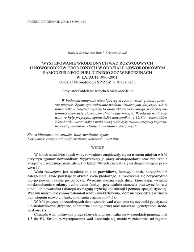 PRZEGL 58:693-699 wrodzonych wad rozwojowych Wystêpowanie Nr 4 EPIDEMIOL 2004; 693 Izabela Krukiewicz-Ruta1, Krzysztof Ruta2 WYSTÊPOWANIE WRODZONYCH WAD ROZWOJOWYCH U NOWORODKÓW URODZONYCH W ODDZIALE NOWORODKOWYM SAMODZIELNEGO PUBLICZNEGO ZOZ W BRZEZINACH W LATACH 1990-2001. Oddzia³ Neonatologii SP ZOZ w Brzezinach Ordynator Oddzia³u: Izabela Krukiewicz-Ruta W badanym materiale wród przyczyn zgonów wady zajmuj¹ pierwsze miejsce. Zgony spowodowane wadami wrodzonymi dotyczy³y 4,8 % noworodków. Najczêciej by³y to wady uk³adu nerwowego, w dalszej kolejnoci aberracje chromosomalne i wady mnogie. Wrodzone wady rozwojowe by³y przyczyn¹ zgonu 8,3% noworodków i 12,1% wczeniaków. Wczeniaki i noworodki z ma³a mas¹ cia³a by³y istotnie czêciej zagro¿one wyst¹pieniem wrodzonych anomalii rozwojowych. S³owa kluczowe: noworodek, wady wrodzone, zgony Key words: congenital malformations, newborm, mortality WSTÊP W latach szeædziesi¹tych wady rozwojowe znajdowa³y siê na trzecim miejscu wród przyczyn zgonów noworodków. Wyprzedza³y je urazy oko³oporodowe oraz zaburzenia zwi¹zane z wczeniactwem, ale ju¿ w latach 70-tych znalaz³y siê na drugim miejscu przyczyn (1). Wada rozwojowa jest to odchylenie od prawid³owej budowy tkanek, narz¹dów lub ca³ego cia³a, które powstaje w okresie ¿ycia p³odowego, a uwidacznia siê bezporednio lub po pewnym czasie po porodzie. Wyró¿niæ mo¿na wady du¿e, które daj¹c wyrane zniekszta³cenia struktury i zaburzenia funkcji, potencjalnie stanowi¹ przyczynê mierci p³odu lub noworodka i dlatego wymagaj¹ szybkiej konsultacji i pomocy specjalistycznej. Wadami ma³ymi nazywamy natomiast wady i zniekszta³cenia, które nie upoledzaj¹ w znacznym stopniu rozwoju i funkcjonowania organizmu (4,5). W ród przyczyn prowadz¹cych do powstania wad wymienia siê czynniki genetyczne lub rodowiskowe (fizyczne, chemiczne i biologiczne) oraz mieszane: genetyczno- rodowiskowe (l). Czêstoæ wad, podawana przez ró¿nych autorów, waha siê w szerokich granicach od 1,5 do 4%. Struktura wystêpowania wad kszta³tuje siê ró¿nie w zale¿noci od regionu 694 I Krukiewicz-Ruta, K Ruta Nr 4 kraju (2,6-10). W obserwacjach Oslislo i S³awskiej (10) czêstoæ wystêpowania du¿ych wad kszta³towa³a siê na poziomie 3,8%. Dominowa³y anomalie uk³adu kostno-stawowego (27%), uk³adu kr¹¿enia (23%) i uk³adu moczowo-p³ciowego (18%). Rozk³ad odsetka wad zbli¿ony by³ do danych innych autorów (9,11). Nieco mniejszy odsetek wad 2,4% notowa³a Lach i wsp.(7). Natomiast rozk³ad wad w jej doniesieniach by³ podobny do poprzednio cytowanych danych. Okres noworodkowy charakteryzuje siê wysokim ryzykiem wyst¹pienia choroby oraz zgonu (12-15). Nale¿y przypomnieæ, ¿e narodziny noworodka z mas¹ cia³a poni¿ej 2500 g zwiêkszaj¹ mo¿liwoæ jego zgonu 40-krotnie, a z mas¹ cia³a poni¿ej 1500 g, a¿ 200-krotnie. Zgony noworodków stanowi¹ oko³o 70%-80% zgonów w ogólnej umieralnoci niemowl¹t (6,13,15-22). Podobne pogl¹dy dotycz¹ce ryzyka nag³ego zgonu wród noworodków z ma³¹ mas¹ urodzeniow¹ prezentuje Oyen i wsp. (23). Równie¿ Brzeziñski i wsp. donosz¹, ¿e ma³a masa urodzeniowa jest czynnikiem ryzyka zwiêkszonej zachorowalnoci i umieralnoci, noworodków (24). Umieralnoæ oko³oporodowa w Polsce jest nadal wysoka w porównaniu do innych krajów Europy. W ostatnim dziesiêcioleciu uleg³a obni¿eniu z 19,5 w 1990 roku do 13,9 w 1996 i do 9,5 na tysi¹c ¿ywo urodzonych w 1998 r. Szamotulska (25) zwraca uwagê, ¿e obni¿anie siê odsetka noworodków z ma³¹ mas¹ urodzeniow¹ jest czynnikiem sprzyjaj¹cym obni¿aniu siê wskaników umieralnoci oko³oporodowej. Umieralnoæ oko³oporodowa wród noworodków z mas¹ cia³a powy¿ej 2500 g wynosi tylko 3,3 (1). CEL PRACY Celem pracy by³a retrospektywna analiza przyczyn zgonów noworodków urodzonych w Oddziale Neonatologii Samodzielnego Publicznego Zespo³u Opieki Zdrowotnej w Brzezinach w latach 1990-2001 oraz ocena czêstoci wystêpowania wad wrodzonych wród noworodków z ma³¹ mas¹ urodzeniow¹ i wród wczeniaków. MATERIA£ I METODY W pracy poddano retrospektywnej analizie dokumentacjê 5496 noworodków urodzonych w Samodzielnym Publicznym ZOZ w Brzezinach, w latach 1990-2001. Dane urodzonych dzieci uzyskano z archiwum SP ZOZ w Brzezinach. W pracy wykorzystano informacje zawarte w historii rozwoju noworodka. Noworodki z ma³¹ mas¹ urodzeniow¹ cia³a (<2500 g) zakwalifikowano do grupa A. Grup¹ odniesienia by³y dla nich dzieci z mas¹ urodzeniow¹ powy¿ej 2500 g (grupa A1). Noworodki urodzone przed ukoñczeniem 37 tygodnia ci¹¿y zaliczono do grupy B, a dla tych dzieci grupê odniesienia stanowi³y noworodki urodzone o czasie (grupa B l). W badanych grupach przeanalizowano czêstoæ wystêpowania wad wrodzonych i zgony noworodków. Analizowano w badanej grupie noworodków wady wrodzone ogó³em oraz wady wrodzone du¿e. Badany materia³ poddano analizie statystycznej. Wykorzystano test dla dwóch rednich z du¿ych prób (U) i przyjêto poziom istotnoci p< 0,05. Nr 4 Wystêpowanie wrodzonych wad rozwojowych 695 WYNIKI W grupie ogó³em 5496 noworodków, wady wrodzone stwierdzono u 188, tj. u 3,4%, natomiast w grupie 387 dzieci urodzonych z ma³¹ mas¹ cia³a <2500 g wady stwierdzono u 32 noworodków, tj. u 8,3 %, a wród 280 wczeniaków u 12,1 %. W grupach odniesienia wady wrodzone stwierdzono odpowiednio u 179 dzieci tj. 3,5% z ogólnej liczby 5109 dzieci z mas¹ cia³a powy¿ej 2500 g i u 177 dzieci, tj. 3,4% z ogólnej liczby 5216 dzieci donoszonych. Wród wszystkich noworodków u 68 dzieci stwierdzono du¿e wady (1,2%). Wady du¿e wród dzieci z mas¹ cia³a poni¿ej 2500 g obserwowano w 13 przypadkach (3,4%), za w grupie odniesienia Al u 55 1,1%. W grupie 280 wczeniaków u 13 4,6%), a w grupie odniesienia B1, 5216 donoszonych noworodków, wady du¿e stwierdzono u 55 tj.1,1% (tab.I). Ta b e l a I . Ta b l e I . Czêstoæ wystêpowania wad ogó³em, du¿ych wad wrodzonych i z