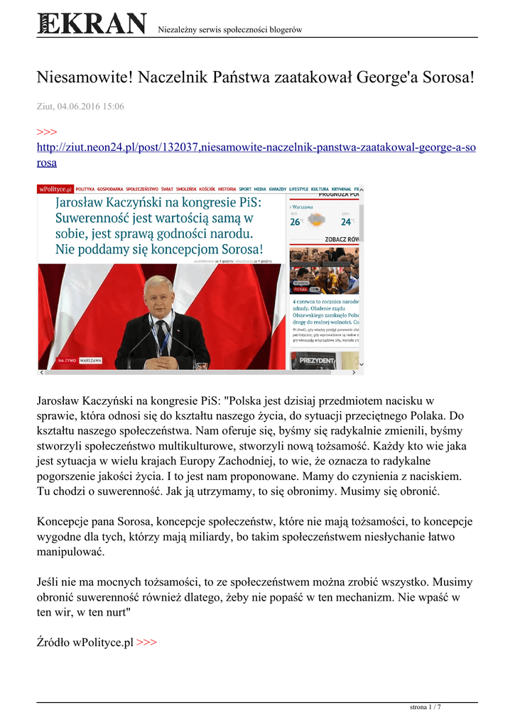 Niezależny serwis społeczności blogerów Niesamowite! Naczelnik Państwa zaatakował George'a Sorosa! Ziut, 04.06.2016 15:06 >>> http://ziut.neon24.pl/post/132037,niesamowite-naczelnik-panstwa-zaatakowal-george-a-so rosa Jarosław Kaczyński na kongresie PiS: "Polska jest dzisiaj przedmiotem nacisku w sprawie, która odnosi się do kształtu naszego życia, do sytuacji przeciętnego Polaka. Do kształtu naszego społeczeństwa. Nam oferuje się, byśmy się radykalnie zmienili, byśmy stworzyli społeczeństwo multikulturowe, stworzyli nową tożsamość. Każdy kto wie jaka jest sytuacja w wielu krajach Europy Zachodniej, to wie, że oznacza to radykalne pogorszenie jakości życia. I to jest nam proponowane. Mamy do czynienia z naciskiem. Tu chodzi o suwerenność. Jak ją utrzymamy, to się obronimy. Musimy się obronić. Koncepcje pana Sorosa, koncepcje społeczeństw, które nie mają tożsamości, to koncepcje wygodne dla tych, którzy mają miliardy, bo takim społeczeństwem niesłychanie łatwo manipulować. Jeśli nie ma mocnych tożsamości, to ze społeczeństwem można zrobić wszystko. Musimy obronić suwerenność również dlatego, żeby nie popaść w ten mechanizm. Nie wpaść w ten wir, w ten nurt" Źródło wPolityce.pl >>> strona 1 / 7 Niezależny serwis społeczności blogerów http://wpolityce.pl/polityka/295423-jaroslaw-kaczynski-na-kongresie-pis-suwerennosc-jes t-wartoscia-sama-w-sobie-jest-sprawa-godnosci-narodu-nie-poddamy-sie-koncepcjom-sor osa?strona=3 Wygląda na to, że Jarosław Kaczyński nie posłuchał apeli Hanny Gronkiewicz-Waltz która nie tak dawno mówiła: "Kilka miesięcy temu we Wrocławiu spalono kukłę Żyda", .... uściślijmy spalono kukłę George'a Sorosa - To ten Pan, pierwszy od lewej, obok "Złotej Rybki" pRrezydenta Komorowskiego. ... We Wrocławiu kilka miesięcy temu spalono jego kukłę (tak przynajmniej zadeklarował Piotr Rybak w TELEWIZJI NARODOWEJ Eugeniusza Sendeckiego). >>> http://ziut.neon24.pl/post/131152,waltz-spalono-kukle-zyda-niezwyklego-zyda-red strona 2 / 7 Niezależny serwis społeczności blogerów strona 3 / 7 Niezależny serwis społeczności blogerów BRAWO PAN NACZELNIK! Taka deklaracja winna by? przez nas natychmiast podj?ta i rozwini?ta. Nie mo?emy pozwoli? Prezesowi, ?eby o niej zapomnia?. On i Jego Otoczenie. I dlatego koniecznie trzeba Pana Prezesa Kaczy?skiego zaprosi? na 28 czerwca pod pomnik Dmowskiego i ofiarowa? jemu statuetk? Pana Romana wyrze?bion? przez Bart?omieja Kurzej?. Eugeniusz Sendecki 04.06.2016 15:55:22 Ziut @ EugeniuszSendecki 15:55:22 Tak, tak, ... tylko jest jeden problem. / Statuetkę obiecał Pan Prezydentowi Andrzejowi Dudzie, ... nawet jakaś zbiórka pieniędzy się na to ukonstytuowała. - Mam nadzieję że "przy okazji" nie dojdzie do defraudacji środków zbieranych na inny cel. (: *** Tą statuetkę należałoby też prześwietlić. / Słyszałem że na biurku jednego z amerykańskich dyplomatów stała figurka z zainstalowaną pluskwą. / Statuetki Dmowskiego o to nie posądzam, ale standardy bezpieczeństwa powinno się zachować. Ziut 04.06.2016 16:00:45 strona 4 / 7 Niezależny serwis społeczności blogerów . C.D.N? ... panie Eugeniuszu Sendecki, redaktorze TELEWIZJI NARODOWEJ. - Obieca? Pan przeprowadzi? wywiad z "warto?ciowym Polakiem", czyli ze mn?. [na wspomnienie tego okre?lenia Ziut poczu? si? jak "milion $$$ men"] .... Mo?e teraz jest najw?a?ciwszy moment? [Ciekawe jaki "unik" zastosuje redaktor / podniesie r?kawic?, ... czy stchórzy?] Eugeniusz Sendecki @ Ziut 17:34:38- PROSZĘ BARDZO - Jestem gotów przeprowadzić z Panem wywiad - pogłębioną analizę tego co Pan opisał w w/w tekście i na wszelkie inne tematy. Od ręki, natychmiast możemy zrobić wywiad w formie rozmowy telefonicznej, ewentualnie umówić się na wywiad w miejscowości w pobliżu Warszawy, gdzie by Pan dojechał. W samej Warszawie zamierzam być dostępny w najbliższy czwartek i tego dnia mogę dojechać do Pana. Proszę, oto mój telefon +48 601 787 407. Eugeniusz Sendecki 04.06.2016 18:41:35 ZIUT @ Eugeniusz Sendecki 18:41:35 Proponuję wywiad "tu i teraz" na temat "pogłębionej analizy tego co opisałem w w/w tekście" - ZGADZA SIĘ PAN? Ziut 04.06.2016 18:45:23 Eugeniusz Sendecki @ Ziut 18:45:23 - ZGODA! - Jak to piszą w narodowej sztuce teatralnej: Zakrzyknęli; Zgoda! Zgoda! A Bóg wtedy rękę poda! Eugeniusz Sendecki 04.06.2016 20:53:30 ZIUT @ Eugeniusz Sendecki 20:53:30 Proponuję więc temat jak wyżej: Na zmianę / Pan zadaje mi dwa pytania, ja odpowiadam. Ja zadaję Panu dwa pytania, Pan odpowiada. / Zgoda? Ziut 04.06.2016 21:04:30 strona 5 / 7 Niezależny serwis społeczności blogerów Eugeniusz Sendecki @ Ziut 21:04:30 - DOBRZE, BARDZO DOBRE WARUNKI Proszę się odezwać na telefon: +48 601 787 407. Eugeniusz Sendecki 04.06.2016 21:36:14 ZIUT @ Eugeniusz Sendecki 21:36:14 Dlaczego na +48? Ziut 04.06.2016 21:42:16 Eugeniusz Sendecki @ Ziut 21:42:16 - BO TO POLSKA WŁAŚNIE. +48 to jest prefiks do Polski. Eugeniusz Sendecki 04.06.2016 22:09:24 ZIUT @ Eugeniusz Sendecki 22:09:24 Ale po co mi ten prefiks panie Eugeniuszu? Ziut 04.06.2016 22:12:36 ZIUT @ Eugeniusz Sendecki Pan "sfiksował" panie Eugeniuszu? Ziut 05.06.2016 00:06:10 "Nocna zmiana wczoraj i dziś" >> http://ziut.neon24.pl/post/132039,syn-zaplutego-karla-reakcji-atakuje-jaroslawa-kaczynski ego strona 6 / 7 Niezależny serwis społeczności blogerów strona 7 / 7 Powered by TCPDF (www.tcpdf.org)