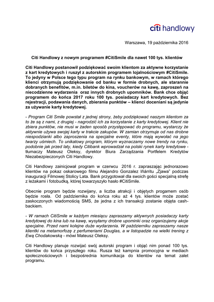 Warszawa, 19 października 2016 Citi Handlowy z nowym programem #CitiSmile dla nawet 100 tys. klientów Citi Handlowy postanowił podziękować swoim klientom za aktywne korzystanie z kart kredytowych i ruszył z autorskim programem lojalnościowym #CitiSmile. To jedyny w Polsce tego typu program na rynku bankowym, w ramach którego klienci otrzymują podziękowanie od banku w formie drobnych, ale starannie dobranych benefitów, m.in. biletów do kina, voucherów na kawę, zaproszeń na niecodzienne wydarzenia oraz innych drobnych upomników. Bank chce objąć programem do końca 2017 roku 100 tys. posiadaczy kart kredytowych. Bez rejestracji, podawania danych, zbierania punktów – klienci doceniani są jedynie za używanie karty kredytowej. - Program Citi Smile powstał z jednej strony, żeby podziękować naszym klientom za to że są z nami, z drugiej - nagrodzić ich za korzystanie z karty kredytowej. Klient nie zbiera punktów, nie musi w żaden sposób przystępować do programu, wystarczy że aktywnie używa swojej karty w trakcie zakupów. W zamian otrzymuje od nas drobne niespodzianki albo zaproszenia na specjalne eventy, które mają wywołać na jego twarzy uśmiech. To unikatowy program, którym wyznaczamy nowe trendy na rynku, podobnie jak przed laty, kiedy Citibank wprowadzał na polski rynek karty kredytowe tłumaczy Mateusz Oleksy, dyrektor Biura Zarządzania Portfelem Kredytów Niezabezpieczonych Citi Handlowy. Citi Handlowy zainicjował program w czerwcu 2016 r. zapraszając jednorazowo klientów na pokaz oskarowego filmu Alejandro Gonzalez Iñárritu „Zjawa” podczas inauguracji Filmowej Stolicy Lata. Bank przygotował dla swoich gości specjalną strefę z leżakami i fotobudką, której towarzyszyło hasło #CitiSmile. Obecnie program będzie rozwijany, a liczba atrakcji i objętych progamem osób będzie rosła. Od października do końca roku aż 4 tys. klientów może zostać zaskoczonych wiadomością SMS, że jedna z ich transakcji zostanie objęta cashbackiem. - W ramach CitiSmile w każdym miesiącu zapraszamy aktywnych posiadaczy karty kredytowej do kina lub na kawę, wysyłamy drobne upominki oraz organizujemy akcje specjalne. Przed nami kolejne duże wydarzenia. W październiku zapraszamy nasze klientki na metamorfozę z perfumeriami Douglas, a w listopadzie na wielki trening z Ewą Chodakowską - mówi Mateusz Oleksy. Citi Handlowy planuje rozwijać swój autorski program i objąć nim ponad 100 tys. klientów do końca przyszłego roku. Rusza też kampnia promocyjna w mediach społecznościowych i bezpośrednia komunikacja do klientów na temat zalet programu. Oprócz CitiSmile posiadacze kart wydawanych przez bank mogą także korzystać z Programu Rabatowego, który oferuje zniżki nawet do 50% w ponad 4800 punktach usługowo-sprzedażowych w całej Polsce. To pierwsza i jedna z największych jeśli chodzi o liczbę partnerów oraz miejsc inicjatywa tego typu w Polsce. Klienci Citi Handlowy mogą z nich korzystać przez cały rok. Oprócz regularnych rabatów, posiadacze kart kredytowych mają dostęp do wyjątkowych okazji, tzw. gorących ofert. To limitowane w czasie specjalne promocje i zniżki w wybranych punktach. Więcej o Programie Rabatowym na http://www.citirabaty.pl/. *** Kontakt dla mediów: Mirosław Kuk, rzecznik prasowy, tel. (0-22) 690 1049; +48 783 915 134 E-mail: [email protected] Agata Charuba-Chadryś, kierownik ds. kontaktów z mediami, tel. (0-22) 692 9416 E-mail: [email protected] Patrycja Długołęcka-Wójcik, specjalista ds.kontaktów z mediami, tel. (0-22) 692 9052 E-mail: [email protected] Bank Handlowy w Warszawie SA to jedna z największych instytucji finansowych w Polsce, oferująca pod marką Citi Handlowy bogaty i nowoczesny asortyment produktów i usług bankowości korporacyjnej, inwestycyjnej i detalicznej. Bank Handlowy obsługuje 6,6 tys. klientów korporacyjnych i ok. 680 tys. klientów indywidualnych poprzez nowoczesne kanały dystrybucji oraz sied 37 oddziałów. W skład grupy kapitałowej Banku wchodzą takie podmioty jak: Dom Maklerski Banku Handlowego i Handlowy Leasing. Przynależnośd do Citigroup, największej na świecie instytucji finansowej, zapewnia klientom Banku Handlowego dostęp do usług finansowych w ponad 100 krajach. Dodatkowe we informacje można uzyskad na stronie internetowej www.citihandlowy.pl