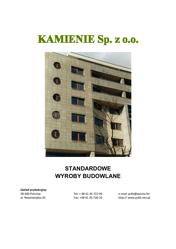 STANDARDOWE WYROBY BUDOWLANE Zakład produkcyjny: 28-400 Pińczów ul. Nowowiejska 43 Tel: + 48 41 35-722-05 Fax: +48 41 35-726-10 e-mail: [email protected] http:// www.pzkb.neo.pl SPIS TREŚCI 1. Wstęp 2. Elementy posadzkowe 3. Elementy posadzkowe – przykłady realizacji 4. Okładziny elewacyjne 5. Okładziny elewacyjne – przykłady realizacji 6. Okładziny elewacyjne – „Marysieńka” 7. Okładziny elewacyjne – przykłady realizacji „Marysieńka” 8. Parapety 9. Parapety – przykłady realizacji 10. Stopnie 11. Stopnie – przykłady realizacji 12. Podstopnie 13. Cokoliki i wangi Szanowni Państwo! Kamienie Sp. z o.o. kontynuują działalność Pińczowskich Zakładów Kamienia Budowlanego, które funkcjonowały po II Wojnie Światowej od 1953 roku. Kamienie Sp. z o. o. są spadkobiercą tradycji kamieniarskich regionu pińczowskiego sięgających czasów renesansu. Eksploatacja kamienia w Pińczowie dla celów dla celów budowlanych rozwinęła się już w latach 1040-1250. Świadczą o tym zabytkowe budowle takie jak np. Kościół w Wiślicy, kościół św. Wincentego Kadłubka w Jędrzejowie, kościół w Kijach. Na wiek XVI i XVII przypada wielki rozkwit kaminiołomów. Do Pińczowa przeprowadza się włoski rzeźbiarz SANTI GUCCI, gdzie zakłada główny ośrodek kamieniarstwa w Polsce. Miękki wapień pińczowski, dający się łatwo obrabiać nawet zwykłymi narzędziami stolarskimi został doceniony jako doskonały materiał budowlany, jak i materiał do wykonwania delikatnych profili architektonicznych, rzeźbionych precyzyjnie wzorów takich jak: arabeski i groteski oraz maszkarony np. w Sukiennicach w Krakowie. W tym czasie z użyciem tego kamienia wzniesione zostay takie zabytki jak: zamek w Łobzowie, kaplica w Niepołomicach, Zamek Leszczyńskich w Baranowie Sandomierskim. Kamień „PIŃCZAK” był stosowany nie tylko w Polsce, ale i na całym świecie np. w Niemczech, Austrii, we włoszech. Tysiące ton tego materiału zużyto do odbudowy Warszawy po II Wojnie Światowej w tym do budowy Pałacu Kultury i Nauki (ściany nośne, elewacje, rzeźby, portale). Od setek lat wydobywano i wykorzystywano do wykańczania obiektów kamienie kielecki „Morawica” i „Bolechowice”. Służyły one do układania posadzek, schodów, okładania ścian, obudowy okien i drzwi, obudowy kominków, wytwaezania tralek i balustrad oraz do wykonywania nagrobków. Jedne z najstarszych przykładów zastosowania tych kamieni można zobaczyć na Zamku w Piaskowej Skale oraz na Wawelu. Posadzki z „Morawicy” zdobią setki kościołów, dworów i pałaców oraz urzędów w całym kraju. Kamień „Morawica” i „Bolechowice” mają bardzo dobre właściwości fizyko – chemiczne. Kamienie te są skałami ciężkimi, mało nasiąkliwymi, o małej ścieralności i bardzo dobrej mrozoodporności. Wapień „PIŃCZAK” natomiast kwalifikuje się jako skała lekka, miękka, średnio nasiąkliwa, o dużej ścieralności i bardzo dobrej mrozoodporności. Przekazujemy Państwu materiał informacyjno-promocyjny, dotyczący produkowanych przez naszą firmę podstawowych wyrobów z polskich kamieni naturalnych. Liczymy, że nasza oferta spotka się z Państwa zainteresowaniem i zachęci Państwo do zakupu wyrobów z kamieni naturalnych. ELEMENTY POSADZKOWE Opis Elementy posadzkowe są wykonywane z naturalnych kamieni świętokrzyskich „Morawica”, „Bolechowice Ciemne”, „Bolechowice Jasne” oraz z marmuru „Perła Cristal”. Elementy z „Morawicy” mogą występować w kolorze kakaowym, beżowym, miodowo-szarym, szaro-zielonkawym, natomiast z „Bolechowic” brązowym z odcieniem fioletowym i bogatym użyleniem kalcytowym – białym lub różowym. Występują też w odmianie jasnobrązowe i ciemnobrązowej (czekoladowej). „Perła Cristal” jest marmurem koloru białego z żółtawymi i beżowymi przerostami. Standardowa grubość elementów posadzkowych to 2cm lub 3 cm, o wymiarach 20x20 cm, 30x30 cm, 30x40 cm, 30x50 cm, 30x60 cm. Proponujemy filka faktur licowych dla elementów posadzkowych: poler, półpoler, szlif, antico, piaskowana. Wykończenie krawędzi – proste. Elementy posadzkowe wykonywane są na indywidualne zamówienie. Ponadto na indywidualne zamówienie wykonujemy elementy posadzkowe w różnych, dowolnych rozmiarach i różnych kształtach (również łukowe). Opakowanie W zależności od wielkości zamówienia elementy posadzkowe są pakowane na palecie standardowej 120x80 cm lub w skrzyni. Układanie Elementy posadzkowe można montować na klejach do kamieni naturalnych lub zaprawie cementowo-piaskowej. Impregnowanie Elementy posadzkowe proponujemy zaimpregnować „Pogłębiaczem koloru” lub środkiem „Przeciw plamom” do kamieni naturalnych np. oferowanych przez firmę AKEMI. Czyszczenie i konserwacja Do czyszczenia posadzek bardzo zabrudzonych zalecamy środki do gruntownego czyszczenia kamienia. W bierzącej konserwacji można zmywać kamienie czstą, ciepłą wodą lub wodą z bardzo niewielkiem dodatkiem środków zmiękczających, ewentualnie emulsji do mycia kamieni. Zabarania się stosowania środków żrących typu Cilit, Domestos itp. Opis Okładziny elewacyjne są wykonywane z wapienia „PIŃCZAK” w kolorze biało-kremowym, lekko żółtawym lub białym z żółtymi smuchami. Zgodnie z wynikiem badań wapień „PIŃCZAK” może być stosowany w budownictwie jako kamień łamany lub w formie bloczków i okładzin do murów budynków mieszkalnych. Uzyskujemy z niego płyty elewacyjne o różnych kształtach, w tym również łuki, wcięcia, otwory okrągłe i inne. Jest to materiał trwały i odporny na wpływ czynników atmosferycznych, takich jak mróz, wysoka temperatura czy deszcz. Charakteryzuje się całkowitą mrozoodpornością, odpornością na czynniki zewnętrzne, łatwą odnawialnością powierzchni. Proponujemy kilka faktur licowych: po pile diamentowej, szlifowana, piaskowana. Elementy mają standardowe rozmia