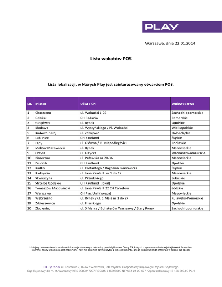 Warszawa, dnia 22.01.2014 Lista wakatów POS Lista lokalizacji, w których Play jest zainteresowany otwarciem POS. Lp. Miasto Ulica / CH Województwo 1 2 3 4 5 6 7 8 9 10 11 12 13 14 15 16 17 18 19 20 ul. Wolności 1-23 CH Radunia ul. Rynek ul. Wyszyńskiego / Pl. Wolności ul. Zdrojowa CH Kaufland ul. Główna / Pl. Niepodległości ul. Rynek ul. Giżycka ul. Puławska nr 20-36 CH Kaufland ul. Korfantego / Rogozina Iwanowicza ul. Jana Pawła II nr 1 do 12 ul. Piłsudskiego CH Kaufland (lokal) ul. Jana Pawła II 22 CH Carrefour CH Plac Unii (wyspa) ul. Rynek / ul. 1 Maja nr 1 do 27 ul. Filarskiego ul. 5 Marca / Bohaterów Warszawy / Stary Rynek Zachodniopomorskie Pomorskie Opolskie Wielkopolskie Dolnośląskie Śląskie Podlaskie Mazowieckie Warmińsko-mazurskie Mazowieckie Opolskie Śląskie Mazowieckie Lubuskie Opolskie Łódzkie Mazowieckie Kujawsko-Pomorskie Opolskie Zachodniopomorskie Choszczno Gdańsk Głogówek Kłodawa Kudowa-Zdrój Lubliniec Łapy Maków Mazowiecki Orzysz Piaseczno Prudnik Radlin Radzymin Skwierzyna Strzelce Opolskie Tomaszów Mazowiecki Warszawa Wąbrzeźno Zdzieszowice Złocieniec Niniejszy dokument może zawierać informacje stanowiące tajemnicę przedsiębiorstwa Grupy P4, których rozpowszechnianie w jakiejkolwiek formie bez pisemnej zgody właściciela jest zabronione. Nikt nie powinien czynić użytku z tego dokumentu, ani go kopiować bądź przesyłać w całości lub części. P4 Sp. z o.o. ul. Taśmowa 7, 02-677 Warszawa, XIII Wydział Gospodarczy Krajowego Rejestru Sądowego Sąd Rejonowy dla m. st. Warszawy KRS 0000217207 REGON 015808609 NIP 951-21-20-077 Kapitał zakładowy 48 456 500,00 PLN