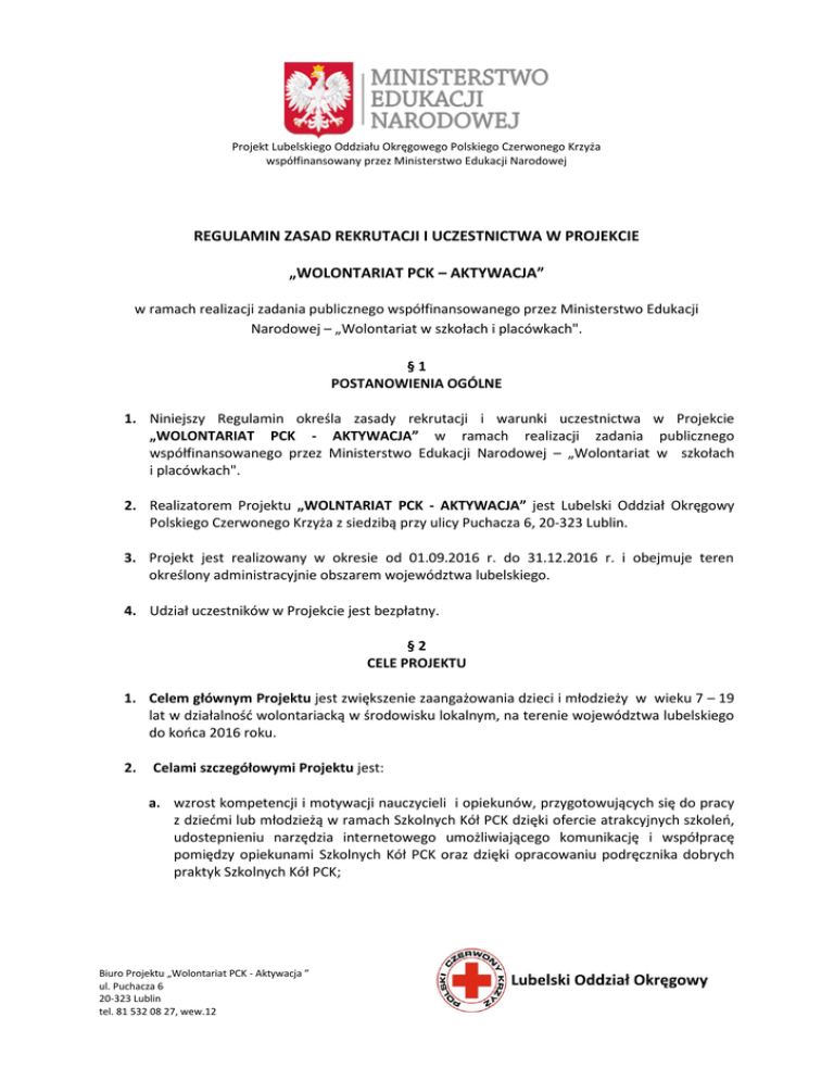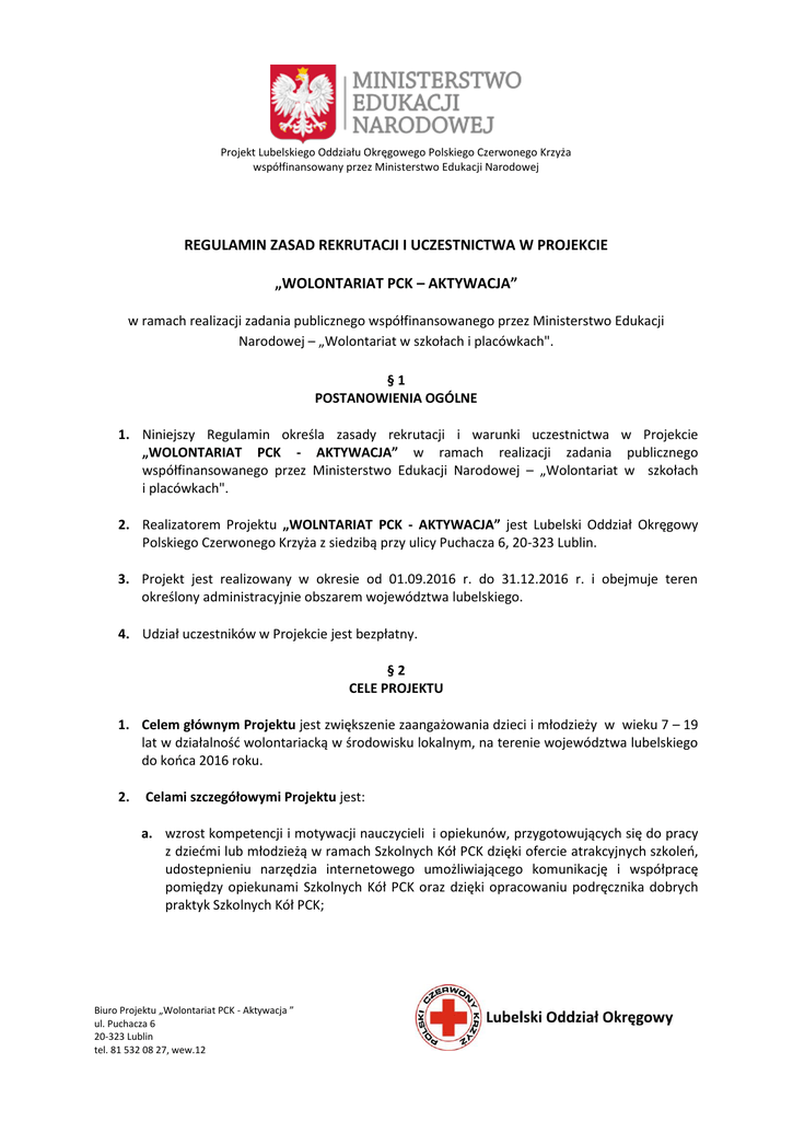 Projekt Lubelskiego Oddziału Okręgowego Polskiego Czerwonego Krzyża współfinansowany przez Ministerstwo Edukacji Narodowej REGULAMIN ZASAD REKRUTACJI I UCZESTNICTWA W PROJEKCIE „WOLONTARIAT PCK – AKTYWACJA” w ramach realizacji zadania publicznego współfinansowanego przez Ministerstwo Edukacji Narodowej – „Wolontariat w szkołach i placówkach". §1 POSTANOWIENIA OGÓLNE 1. Niniejszy Regulamin określa zasady rekrutacji i warunki uczestnictwa w Projekcie „WOLONTARIAT PCK - AKTYWACJA” w ramach realizacji zadania publicznego współfinansowanego przez Ministerstwo Edukacji Narodowej – „Wolontariat w szkołach i placówkach". 2. Realizatorem Projektu „WOLNTARIAT PCK - AKTYWACJA” jest Lubelski Oddział Okręgowy Polskiego Czerwonego Krzyża z siedzibą przy ulicy Puchacza 6, 20-323 Lublin. 3. Projekt jest realizowany w okresie od 01.09.2016 r. do 31.12.2016 r. i obejmuje teren określony administracyjnie obszarem województwa lubelskiego. 4. Udział uczestników w Projekcie jest bezpłatny. §2 CELE PROJEKTU 1. Celem głównym Projektu jest zwiększenie zaangażowania dzieci i młodzieży w wieku 7 – 19 lat w działalność wolontariacką w środowisku lokalnym, na terenie województwa lubelskiego do końca 2016 roku. 2. Celami szczegółowymi Projektu jest: a. wzrost kompetencji i motywacji nauczycieli i opiekunów, przygotowujących się do pracy z dziećmi lub młodzieżą w ramach Szkolnych Kół PCK dzięki ofercie atrakcyjnych szkoleń, udostepnieniu narzędzia internetowego umożliwiającego komunikację i współpracę pomiędzy opiekunami Szkolnych Kół PCK oraz dzięki opracowaniu podręcznika dobrych praktyk Szkolnych Kół PCK; Biuro Projektu „Wolontariat PCK - Aktywacja ” ul. Puchacza 6 20-323 Lublin tel. 81 532 08 27, wew.12 Projekt Lubelskiego Oddziału Okręgowego Polskiego Czerwonego Krzyża współfinansowany przez Ministerstwo Edukacji Narodowej b. wzrost kompetencji uczniów i uczennic wstępujących do nowopowstałych Szkolnych Kół PCK/grup Społecznych Instruktorów Młodzieżowych dzięki ofercie atrakcyjnych warsztatów odpowiadających na zdiagnozowane potrzeby oraz dzięki realizacji wolontariackich projektów lokalnych przez dzieci i młodzież; c. poprawa jakości funkcjonowania istniejących Szkolnych Kół PCK dzięki wsparciu w zakresie diagnozy stanu i potrzeb wolontariuszy/ek oraz dzięki umożliwieniu opiekunom Szkolnych Kół PCK wymiany dobrych praktyk; d. poprawa jakości funkcjonowania istniejących grup Społecznych Młodzieżowych dzięki ofercie warsztatów dopasowanych do ich potrzeb; Instruktorów e. wzrost liczby Szkolnych Kół PCK, grup Społecznych Instruktorów Młodzieżowych oraz liczby wolontariuszy/ek wśród dzieci i młodzieży szkolnej w woj. lubelskim; f. rozwój wśród uczniów postaw uważności i wrażliwości na potrzeby otoczenia oraz promocja idei wolontariatu wśród młodych ludzi i w społecznościach lokalnych. §3 GRUPA ADRESATÓW 1. Grupę adresatów Projektu stanowi 13 szkół podstawowych, 13 gimnazjów oraz 13 szkół ponadgimnazjalnych z terenu województwa lubelskiego gotowych utworzyć w swojej placówce Szkolne Koła PCK. 2. Bezpośrednimi odbiorcami Projektu jest: a. min. 390 uczniów/uczennic w wieku 7-19 lat, w tym min. 130 ze szkół podstawowych, min. 130 ze szkół gimnazjalnych oraz min. 130 ze szkół ponadgimnazjalnych; b. min.39 nauczycieli/pedagogów, w tym. min. 13 ze szkół podstawowych, min. 13 ze szkół gimnazjalnych oraz min. 13 ze szkół ponadgimnazjalnych; c. min. 70 opiekunów dotychczas funkcjonujących Szkolnych Kół PCK; d. min. 50 uczniów młodzieżowych liderów, należących do 3 istniejących grup Społecznych Instruktorów Młodzieżowych oraz min. 10 uczniów, którzy utworzą nową grupę Społecznych Instruktorów Młodzieżowych . 3. Pośrednimi odbiorcami Projektu są społeczności lokalne, do których adresowane będą lokalne projekty autorskie. Biuro Projektu „Wolontariat PCK - Aktywacja ” ul. Puchacza 6 20-323 Lublin tel. 81 532 08 27, wew.12 Projekt Lubelskiego Oddziału Okręgowego Polskiego Czerwonego Krzyża współfinansowany przez Ministerstwo Edukacji Narodowej §4 ZAKRES I FORMY WSPARCIA 1. Projekt obejmuje wsparciem szkoły podstawowe, szkoły gimnazjalne oraz szkoły ponadgimnazjalne z obszaru woj. lubelskiego w następujących formach: a. szkolenia dla nauczycieli/lek do pełnienia ról opiekunów nowo utworzonych Szkolnych Kół PCK (39 osób): 2 grupy x 24 godz.; b. warsztaty dla uczniów i organizację projektów lokalnych, w tym: - warsztat na temat: idei wolontariatu, praw i obowiązków wolontariusza/ki, zasad działania Szkolnego Koła PCK, wolontariat a PCK - 2 godziny/szkoła, - warsztaty dostosowane do potrzeb danej szkoły na podstawie przeprowadzonej diagnozy (badanie ankietowe, wywiad) z następujących modułów tematycznych: zbiórki publiczne i kwesty, udzielanie pierwszej pomocy, pomoc osobom starszym, ewolontariat, savoir-vivre wobec osób niepełnosprawnych, tolerancja i akceptacja, zdrowie i zdrowy styl życia, honorowe krwiodawstwo, warsztat aktywistyczny jak organizować działania na rzecz pomocy innym, inny (dostosowany do potrzeb szkoły) - 8 godzin/szkoła; c. animacja działań wolontariuszy/ek współpracujących z już istniejącymi Szkolnymi Kołami PCK; d. warsztaty dla młodzieżowych liderów już funkcjonujących grup Społecznych Instruktorów Młodzieżowych – 8 godzin/grupa oraz dla jednej grupy nowopowstałej – 10 godzin; e. udostepnienie narzędzia internetowego typu: lista mailowa, forum/grupa; f. opracowanie i publikacja podręcznika dobrych praktyk pracy Szkolnych Kół PCK. §5 REKRUTACJA I DOKUMENTY REKRUTACYJNE 1. Uczestnikiem Projektu może zostać: nauczyciel/lka, uczeń/nica szkoły podstawowej, gimnazjalnej i ponadgimnazjalnej z terenu woj. lubelskiego zainteresowani utworzeniem Szkolnych Kół PCK oraz wolontariusz/ka współpracujący/a z PCK na obszarze całego wojewód
