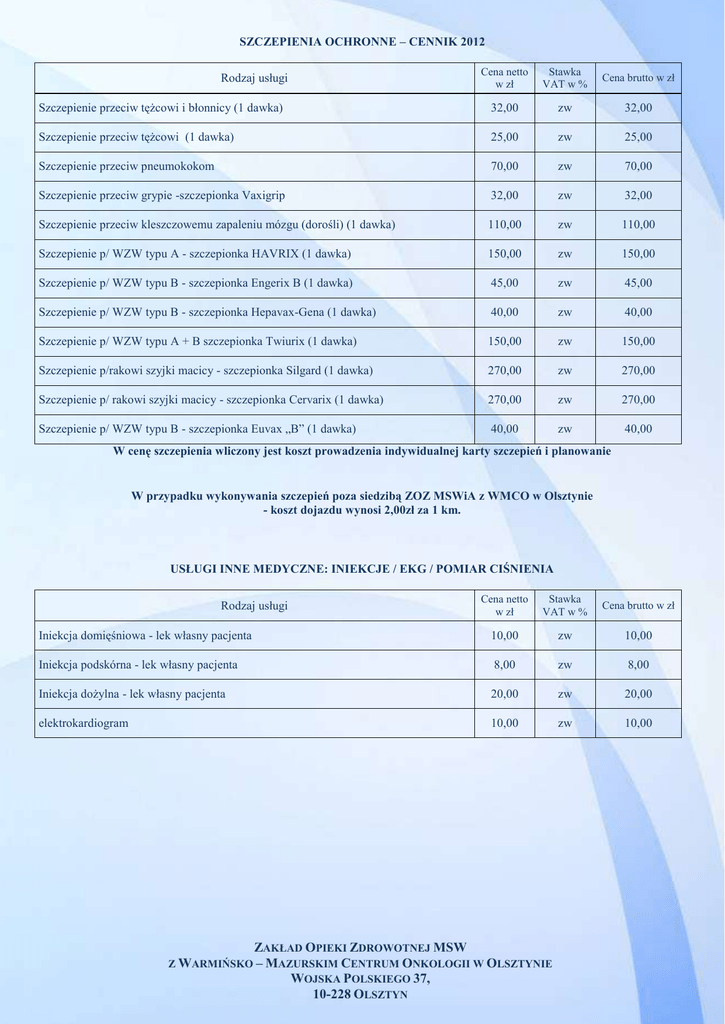 SZCZEPIENIA OCHRONNE – CENNIK 2012 Cena netto w zł Stawka VAT w % Cena brutto w zł Szczepienie przeciw tężcowi i błonnicy (1 dawka) 32,00 zw 32,00 Szczepienie przeciw tężcowi (1 dawka) 25,00 zw 25,00 Szczepienie przeciw pneumokokom 70,00 zw 70,00 Szczepienie przeciw grypie -szczepionka Vaxigrip 32,00 zw 32,00 Szczepienie przeciw kleszczowemu zapaleniu mózgu (dorośli) (1 dawka) 110,00 zw 110,00 Szczepienie p/ WZW typu A - szczepionka HAVRIX (1 dawka) 150,00 zw 150,00 Szczepienie p/ WZW typu B - szczepionka Engerix B (1 dawka) 45,00 zw 45,00 Szczepienie p/ WZW typu B - szczepionka Hepavax-Gena (1 dawka) 40,00 zw 40,00 Szczepienie p/ WZW typu A + B szczepionka Twiurix (1 dawka) 150,00 zw 150,00 Szczepienie p/rakowi szyjki macicy - szczepionka Silgard (1 dawka) 270,00 zw 270,00 Szczepienie p/ rakowi szyjki macicy - szczepionka Cervarix (1 dawka) 270,00 zw 270,00 Szczepienie p/ WZW typu B - szczepionka Euvax „B” (1 dawka) 40,00 zw 40,00 Rodzaj usługi W cenę szczepienia wliczony jest koszt prowadzenia indywidualnej karty szczepień i planowanie W przypadku wykonywania szczepień poza siedzibą ZOZ MSWiA z WMCO w Olsztynie - koszt dojazdu wynosi 2,00zł za 1 km. USŁUGI INNE MEDYCZNE: INIEKCJE / EKG / POMIAR CIŚNIENIA Cena netto w zł Stawka VAT w % Cena brutto w zł Iniekcja domięśniowa - lek własny pacjenta 10,00 zw 10,00 Iniekcja podskórna - lek własny pacjenta 8,00 zw 8,00 Iniekcja dożylna - lek własny pacjenta 20,00 zw 20,00 elektrokardiogram 10,00 zw 10,00 Rodzaj usługi ZAKŁAD OPIEKI ZDROWOTNEJ MSW Z WARMIŃSKO – MAZURSKIM CENTRUM ONKOLOGII W OLSZTYNIE WOJSKA POLSKIEGO 37, 10-228 OLSZTYN HOSPITALIZACJE – CENNIK 2012 Rodzaj usługi Oddziały szpitalne Badania diagnostyczne i konsultacje wykonane w trakcie hospitalizacji ( nie objęte procedurą) Wysokocenne materiały medyczne -np.: endoprotezy Stawka VAT w % Cena brutto w zł Cena hospitalizacji w oddziałach ustalona na podstawie ilości punktów określonych procedur medycznych; wartość 1 punktu wynosi 63,00zł zw Cena hospitalizacji w oddziałach ustalona na podstawie ilości punktów określonych procedur medycznych; wartość 1 punktu wynosi 63,00zł według cennika ZOZ MSWiA w Olsztynie zw według cennika ZOZ MSWiA w Olsztynie Cena netto w zł według ceny zakupu + koszty administracyjne 50zł według ceny zakupu + według ceny zakupu + koszty koszty administracyjne administracyjne 50zł 50zł ZAKŁAD OPIEKI ZDROWOTNEJ MSW Z WARMIŃSKO – MAZURSKIM CENTRUM ONKOLOGII W OLSZTYNIE WOJSKA POLSKIEGO 37, 10-228 OLSZTYN