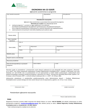 EKONOMIA NA CO DZIEŃ Zgłoszenie uczestnictwa w programie Imię, nazwisko nauczyciela Województwo Rok zgłoszenia Oświadczenie nauczyciela Zgłaszam chęć uczestnictwa w warsztatach dla nauczycieli do programu Ekonomia na co dzień oraz zobowiązuję się do: realizacji programu* z uczniami w ciągu najbliższych 3 lat szkolnych (na lekcjach przedmiotowych lub godzinach wychowawczych, lub godzinach kartowych, lub na zajęciach pozalekcyjnych realizowanych w systemie klasowym lub międzyklasowym), wykorzystywania otrzymanych materiałów dydaktycznych podczas zajęć. Nazwa szkoły Imię i nazwisko dyrektora Ulica, nr Dane szkoły Kod Miejscowość Województwo Telefon Fax e-mail REGON szkoły Stopień awansu zawodowego Nauczany przedmiot Dane do korespondencji w sprawach programu Numer telefonu e-mail Wyrażam zgodę na gromadzenie i przetwarzanie moich danych osobowych (w tym fotografii) dla celów programu „Ekonomia na co dzień” oraz innych programów edukacyjnych Fundacji Młodzieżowej Przedsiębiorczości z siedzibą w Warszawie, przy ulicy Kieleckiej 1/1, kod 02-504, oraz na przekazywanie ich do wykorzystania w trakcie badań ewaluacyjnych, realizowanych przez podmiot prowadzący ewaluację zewnętrzną programu „Ekonomia na co dzień”, zleconą przez Narodowy Bank Polski, zgodnie z art. 6 Ustawy z dnia 29 sierpnia 1997 r. o ochronie danych osobowych (Dz. U. z 1997 r. Nr 133 poz. 883). Jednocześnie oświadczam, iż zostałem/łam poinformowany/na, przez Administratora danych – Fundację Młodzieżowej Przedsiębiorczości o prawie dostępu do treści swoich danych oraz ich poprawiania, zgodnie z art. 24 ust. 3 ww. Ustawy. ……………………………………… (miejscowość, data) …………………………… (podpis nauczyciela) Potwierdzam zgłoszenie nauczyciela ……………………………………………………………………………. Pieczęć i podpis dyrektora szkoły Uwaga Wypełniony formularz prosimy oddać trenerowi lub odesłać faksem na numer +48 58 7810050, lub odesłać zeskanowany na adres koordynatora programu: [email protected] albo odesłać pocztą na adres: Oddział Regionalny Fundacji Młodzieżowej Przedsiębiorczości, ul. Gospodarska 1, 81-068 Gdynia. * Opis realizacji programu znajduje się na odwrocie. * Realizacja programu Ekonomia na co dzień oznacza pracę z uczniami z wykorzystaniem otrzymanych pakietów dydaktycznych opracowanych do programu tak, by w wyniku jego realizacji: a. Wzrósł poziom wiedzy uczniów w zakresie: racjonalnego gospodarowania finansami, planowania i zakładania własnej działalności gospodarczej, efektywnych sposobów poruszania się na rynku pracy, planowania własnej edukacyjnej. kariery zawodowej poprzez wytyczanie ścieżki b. Wzrósł poziom umiejętności uczniów w zakresie: korzystania z usług banku, sporządzania budżetu, podejmowania decyzji w oparciu o ustalone kryteria wyboru i analizowania skutków swoich decyzji finansowych, aktywnych sposobów poszukiwania pracy, przygotowywania dokumentów, racjonalnego zarządzania czasem.