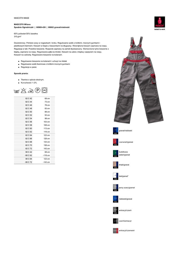 MASCOT® IMAGE MASCOT® Milano Spodnie Ogrodniczki | 00969-430 | 88802 granat/niebieski 65% poliester/35% bawełna 310 g/m² Dwukolorowy. Potrójne szwy w nogawkach i kroku. Regulowane szelki z krótkimi, mocnymi gumkami i plastikowymi klamrami. Kieszeń w klapie z kieszonkami na długopisy. Wewnętrzna kieszeń zapinana na rzepy. Regulacja w talii. Przednie kieszenie. Rozporek zapinany na zamek błyskawiczny. Wzmocnione tylne kieszenie z klapką, zapinane na rzepy. Regulowana pętla na młotek. Kieszeń na udzie z klapką i zapięciem na rzepy. Kieszeń na calówkę. Regulowane kieszenie na kolanach. l Regulowane kieszenie na kolanach i uchwyt na młotek l Regulowane szelki tkaninowe z krótkimi mocnymi gumkami l Regulacja w pasie Sposób prania: l Tkanina o splocie skośnym. l Kurczliwość 1-2%. 82 C 42 68 cm 82 C 44 73 cm 82 C 46 78 cm 82 C 48 83 cm 82 C 50 88 cm 82 C 52 93 cm 82 C 54 98 cm 82 C 56 103 cm 82 C 58 108 cm 82 C 60 113 cm 82 C 62 118 cm 82 C 64 123 cm 82 C 66 128 cm 82 C 68 133 cm 82 C 70 138 cm 82 C 72 143 cm 90 C 42 68 cm -90 C 62 -118 cm 90 C 64 123 cm -90 C 72 -143 cm granat/niebieski czerwień/granat butelkowa zieleń/granat khaki/granat biel/granat* jasny szary/granat niebieski/granat antracyt/czerń czerń/antracyt antracyt/czerwień