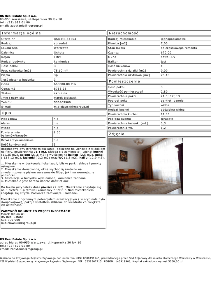 RS Real Estate Sp. z o.o. 00-950 Warszawa, ul.Kopernika 30 lok.10 tel.: (22) 629 01 80 email: [email protected] Informacje ogólne Nieruchomość Oferta nr RSR-MS-11303 Rodzaj mieszkania jednopoziomowe Rodzaj sprzedaż Piwnica [m2] 7,00 Lokalizacja Warszawa Stan lokalu do częściowego remontu Dzielnica Ochota Czynsz 670,00 Rejon Filtry Okna nowe PCV Rodzaj budynku kamienica Balkon jest Ilość pokoi 3 Ilość balkonów 1 Pow. całkowita [m2] 75.10 m² Powierzchnia działki [m2] 0.00 Piętro 3p Powierzchnia użytkowa [m2] 75,10 Ilość pięter w budynku 3 Cena 660000.00 PLN Cena/m2 8788.28 Status Imię i nazwisko Telefon E-mail aktualna Marek Bielawski 536309900 [email protected] Opis Pomieszczenia Ilość pokoi 3 Wysokość pomieszczeń 2,80 Powierzchnia pokoi 21,5; 12; 13 Podłogi pokoi parkiet, panele Typ kuchni widna Rodzaj kuchni oddzielna widna Powierzchnia kuchni 11,35 Plac zabaw nie Podłoga kuchni terakota Alarm nie Powierzchnia łazienki [m2] 3,3 Winda nie Powierzchnia WC 1,2 Powierzchnia balkonów/tarasów 2,50 Drzwi antywłamaniowe nie Ilość kondygnacji 3 Zdjęcia Rozkładowe dwustronne mieszkanie, położone na Ochocie z widokiem na filtry, powierzchnia 75,1 m2. Składa się zamkniętej, widnej kuchni (11,35 m2), salonu (21,6 m2) z wyjściem na balkon (2,5 m2), pokoi ( 13 i 12 m2), łazienki ( 3,3 m2) oraz WC (1,2 m2), hall'u (12,9 m2). 1 . Mieszkanie w doskonałej lokalizacji, blisko parki, sklepy i punkty usługowe 2 . Mieszkanie dwustronne, okna wychodzą zarówno na zmodernizowane piękne warszawskie filtry, jak i na wewnętrzne podwórko 3. Instalacje w budynku wymienione, kamienica zadbana 4. Mieszkanie jest bardzo dobrze doświetlone Do lokalu przynależy duża piwnica (7 m2). Mieszkanie znajduje się na 3 piętrze 3-piętrowej kamienicy z 1936 r. Nad mieszkaniem znajduje się strych. Podwórze zamknięte i zadbane. Mieszkanie z ogromnym potencjałem aranżacyjnym ( w oryginale było dwupokojowe), pokoje kształtem zbliżone do kwadratu co zwiększa ich ustawność. ZADZWOŃ DO MNIE PO WIĘCEJ INFORMACJI Marek Bielawski RS Real Estate 536 309 900 [email protected] RS Real Estate Sp. z o.o. adres biura: 00-950 Warszawa, ul.Kopernika 30 lok.10 tel.: (22) 629 01 80 email: [email protected] Wpisana do Krajowego Rejestru Sądowego pod numerem KRS: 0000491145, prowadzonego przez Sąd Rejonowy dla miasta stołecznego Warszawy w Warszawie, XII Wydział Gospodarczy Krajowego Rejestru Sądowego. NIP: 5252567915, REGON: 146919968, Kapitał zakładowy wynosi 5000,00 zł.