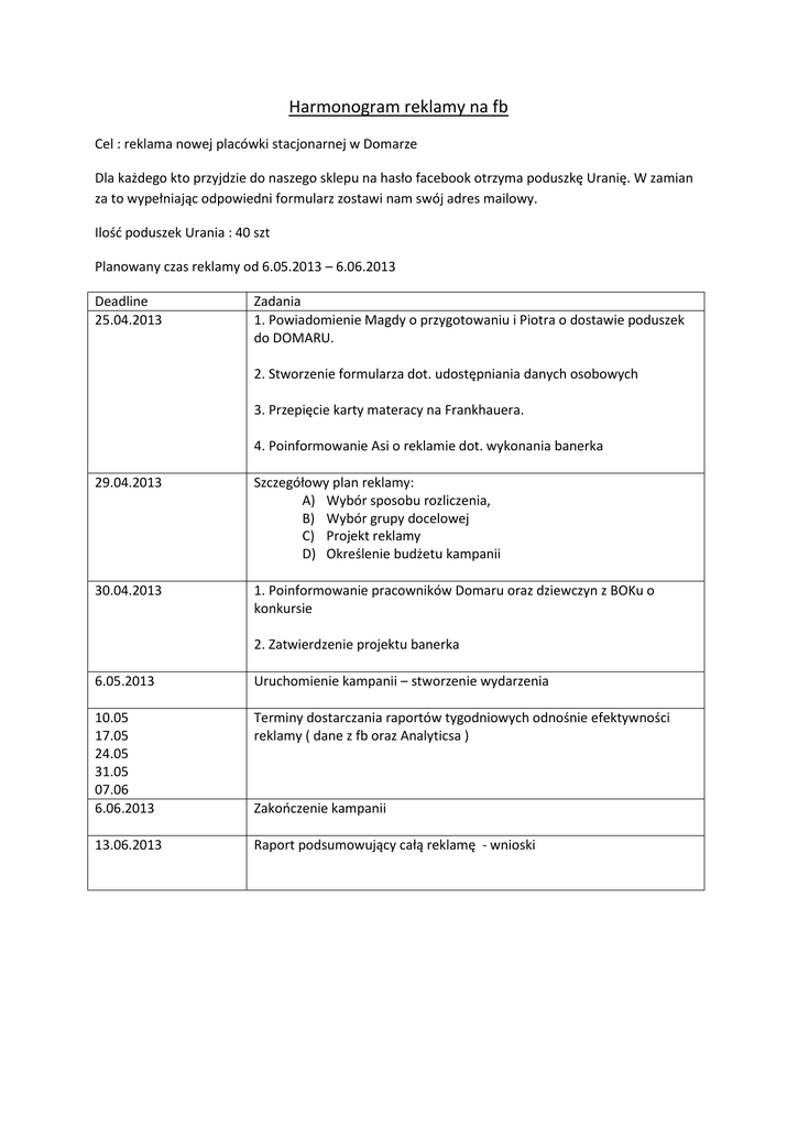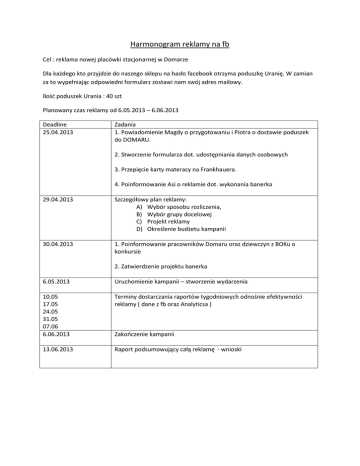 Harmonogram reklamy na fb Cel : reklama nowej placówki stacjonarnej w Domarze Dla każdego kto przyjdzie do naszego sklepu na hasło facebook otrzyma poduszkę Uranię. W zamian za to wypełniając odpowiedni formularz zostawi nam swój adres mailowy. Ilośd poduszek Urania : 40 szt Planowany czas reklamy od 6.05.2013 – 6.06.2013 Deadline 25.04.2013 Zadania 1. Powiadomienie Magdy o przygotowaniu i Piotra o dostawie poduszek do DOMARU. 2. Stworzenie formularza dot. udostępniania danych osobowych 3. Przepięcie karty materacy na Frankhauera. 4. Poinformowanie Asi o reklamie dot. wykonania banerka 29.04.2013 Szczegółowy plan reklamy: A) Wybór sposobu rozliczenia, B) Wybór grupy docelowej C) Projekt reklamy D) Określenie budżetu kampanii 30.04.2013 1. Poinformowanie pracowników Domaru oraz dziewczyn z BOKu o konkursie 2. Zatwierdzenie projektu banerka 6.05.2013 Uruchomienie kampanii – stworzenie wydarzenia 10.05 17.05 24.05 31.05 07.06 6.06.2013 Terminy dostarczania raportów tygodniowych odnośnie efektywności reklamy ( dane z fb oraz Analyticsa ) 13.06.2013 Raport podsumowujący całą reklamę - wnioski Zakooczenie kampanii