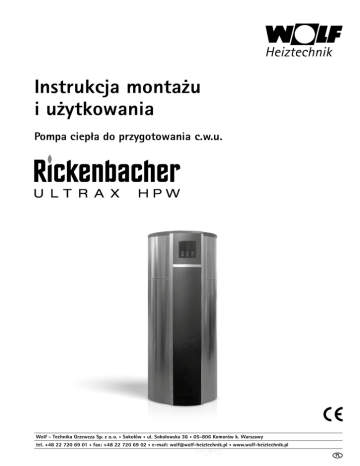 Instrukcja montażu i użytkowania Pompa ciepła do przygotowania c.w.u. Wolf - Technika Grzewcza Sp. z o. o. • Sokołów • ul. Sokołowska 36 • 05-806 Komorów k. Warszawy tel. +48 22 720 69 01 • fax: +48 22 720 69 02 • e-mail: [email protected] • www.wolf-heiztechnik.pl PL Spis treści 1. Wskazówki dotyczące bezpieczeństwa / obowiązujące normy i przepisy ........................................................................................................... 3 2. Skrócony opis .................................................................................................................................................................................................................................. 4 3. Wymogi poprawnej i bezawaryjnej pracy .................................................................................................................................................................... 5-6 3.1 Wymogi montażowe i bezpieczeństwa .................................................................................................................................................................... 5 3.2 Umiejscowienie pompy ciepła ...................................................................................................................................................................................... 6 4. Zasada działania ............................................................................................................................................................................................................................ 7 5. Budowa ......................................................................................................................................................................................................................................... 8-9 6. Dane techniczne ......................................................................................................................................................................................................................... 10 7. Instalacja na obiekcie ....................................................................................................................................................................................................... 11-16 7.1 Podłączenie do instalacji elektrycznej ................................................................................................................................................................... 11 7.2 Podłączenie hydrauliczne . .................................................................................................................................................................................... 11-12 7.3 Odprowadzenie skroplin (kondensatu) .................................................................................................................................................................. 13 7.4 Montaż kanałów powietrznych . ........................................................................................................................................................................ 14-15 7.5 Dodatkowe możliwości wykorzystania pompy ciepła i kanałów powietrznych ................................................................................. 16 8. Wyłączenie z ruchu ................................................................................................................................................................................................................... 16 9. Obsługa sterownika ........................................................................................................................................................................................................... 17-21 9.1 Panel obsługowy .............................................................................................................................................................................................................. 17 9.2 Panel sterowniczy ............................................................................................................................................................................................................ 18 9.3 Przegląd funkcji, zmiana parametrów,programowanie .......................................................................................................................... 18-20 9.4 Parametry techniczne i ustawienia ......................................................................................................................................................................... 21 10. Usterki: przyczyna – usuwanie ......................................................................................................................................................................................... 22 10.1 Wyświetlanie błędów i usterek ............................................................................................................................................................................... 22 10.2 Usterki – ich przyczyny i sposoby rozwiązania ............................................................................................................................................... 22 11. Konserwacja ........................................................................................................................................................................................................................ 23-24 11.1 Demontaż obudowy ..................................................................................................................................................................................................... 23 11.2 Czynności konserwacyjne .......................................................................................................................................................................................... 
