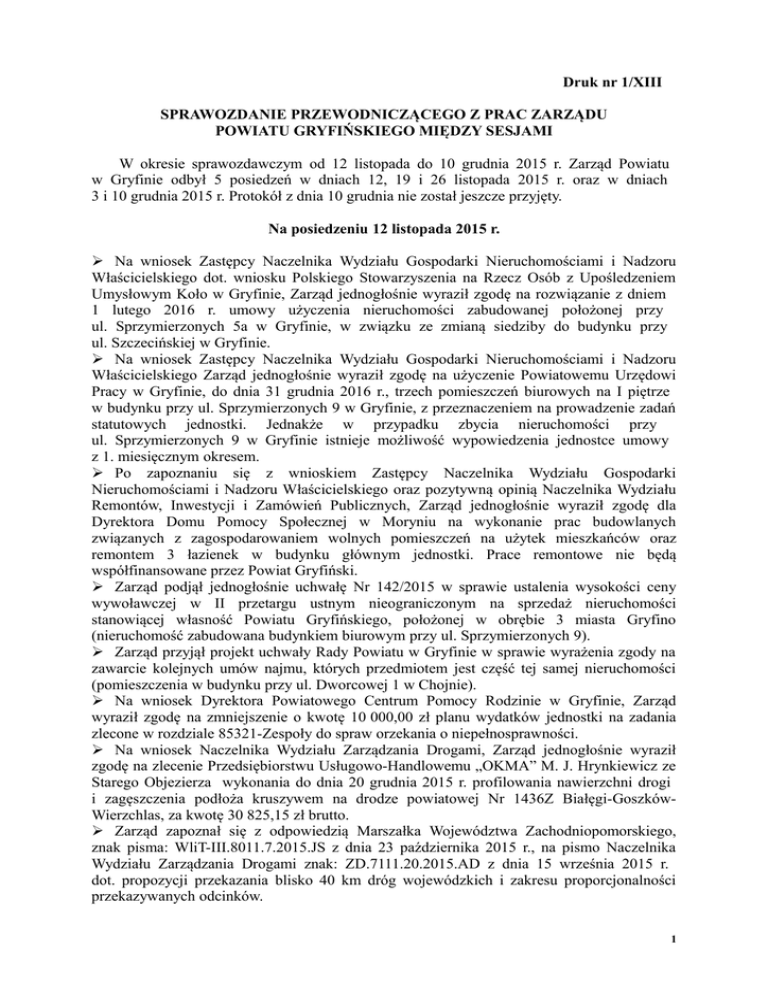 Druk nr 1/XIII SPRAWOZDANIE PRZEWODNICZĄCEGO Z PRAC ZARZĄDU POWIATU GRYFIŃSKIEGO MIĘDZY SESJAMI W okresie sprawozdawczym od 12 listopada do 10 grudnia 2015 r. Zarząd Powiatu w Gryfinie odbył 5 posiedzeń w dniach 12, 19 i 26 listopada 2015 r. oraz w dniach 3 i 10 grudnia 2015 r. Protokół z dnia 10 grudnia nie został jeszcze przyjęty. Na posiedzeniu 12 listopada 2015 r. Na wniosek Zastępcy Naczelnika Wydziału Gospodarki Nieruchomościami i Nadzoru Właścicielskiego dot. wniosku Polskiego Stowarzyszenia na Rzecz Osób z Upośledzeniem Umysłowym Koło w Gryfinie, Zarząd jednogłośnie wyraził zgodę na rozwiązanie z dniem 1 lutego 2016 r. umowy użyczenia nieruchomości zabudowanej położonej przy ul. Sprzymierzonych 5a w Gryfinie, w związku ze zmianą siedziby do budynku przy ul. Szczecińskiej w Gryfinie. Na wniosek Zastępcy Naczelnika Wydziału Gospodarki Nieruchomościami i Nadzoru Właścicielskiego Zarząd jednogłośnie wyraził zgodę na użyczenie Powiatowemu Urzędowi Pracy w Gryfinie, do dnia 31 grudnia 2016 r., trzech pomieszczeń biurowych na I piętrze w budynku przy ul. Sprzymierzonych 9 w Gryfinie, z przeznaczeniem na prowadzenie zadań statutowych jednostki. Jednakże w przypadku zbycia nieruchomości przy ul. Sprzymierzonych 9 w Gryfinie istnieje możliwość wypowiedzenia jednostce umowy z 1. miesięcznym okresem. Po zapoznaniu się z wnioskiem Zastępcy Naczelnika Wydziału Gospodarki Nieruchomościami i Nadzoru Właścicielskiego oraz pozytywną opinią Naczelnika Wydziału Remontów, Inwestycji i Zamówień Publicznych, Zarząd jednogłośnie wyraził zgodę dla Dyrektora Domu Pomocy Społecznej w Moryniu na wykonanie prac budowlanych związanych z zagospodarowaniem wolnych pomieszczeń na użytek mieszkańców oraz remontem 3 łazienek w budynku głównym jednostki. Prace remontowe nie będą współfinansowane przez Powiat Gryfiński. Zarząd podjął jednogłośnie uchwałę Nr 142/2015 w sprawie ustalenia wysokości ceny wywoławczej w II przetargu ustnym nieograniczonym na sprzedaż nieruchomości stanowiącej własność Powiatu Gryfińskiego, położonej w obrębie 3 miasta Gryfino (nieruchomość zabudowana budynkiem biurowym przy ul. Sprzymierzonych 9). Zarząd przyjął projekt uchwały Rady Powiatu w Gryfinie w sprawie wyrażenia zgody na zawarcie kolejnych umów najmu, których przedmiotem jest część tej samej nieruchomości (pomieszczenia w budynku przy ul. Dworcowej 1 w Chojnie). Na wniosek Dyrektora Powiatowego Centrum Pomocy Rodzinie w Gryfinie, Zarząd wyraził zgodę na zmniejszenie o kwotę 10 000,00 zł planu wydatków jednostki na zadania zlecone w rozdziale 85321-Zespoły do spraw orzekania o niepełnosprawności. Na wniosek Naczelnika Wydziału Zarządzania Drogami, Zarząd jednogłośnie wyraził zgodę na zlecenie Przedsiębiorstwu Usługowo-Handlowemu „OKMA” M. J. Hrynkiewicz ze Starego Objezierza wykonania do dnia 20 grudnia 2015 r. profilowania nawierzchni drogi i zagęszczenia podłoża kruszywem na drodze powiatowej Nr 1436Z Białęgi-GoszkówWierzchlas, za kwotę 30 825,15 zł brutto. Zarząd zapoznał się z odpowiedzią Marszałka Województwa Zachodniopomorskiego, znak pisma: WliT-III.8011.7.2015.JS z dnia 23 października 2015 r., na pismo Naczelnika Wydziału Zarządzania Drogami znak: ZD.7111.20.2015.AD z dnia 15 września 2015 r. dot. propozycji przekazania blisko 40 km dróg wojewódzkich i zakresu proporcjonalności przekazywanych odcinków. 1 Na wniosek Naczelnika Wydziału Edukacji, Kultury, Sportu i Turystyki, Zarząd jednogłośnie wyraził zgodę na dofinansowanie w kwocie 800,00 zł II edycji Powiatowego Konkursu Profilaktycznego organizowanego w dniu 1 grudnia 2015 r. przez Zespól Szkół Ponadgimnazjalnych w Chojnie, z przeznaczeniem na zakup nagród. Na wniosek Naczelnika Wydziału Edukacji, Kultury, Sportu i Turystyki, Zarząd jednogłośnie wyraził zgodę na podpisanie Aneksu nr 4 do porozumienia nr EK-3/09 zawartego w dniu 10 lutego 2009 r. pomiędzy Powiatem Gryfińskim a Gminą Gryfino w sprawie powierzenia prowadzenia zadań publicznych w zakresie kultury fizycznej. Na wniosek Dyrektora Powiatowego Centrum Pomocy Rodzinie w Gryfinie, Zarząd jednogłośnie zapoznał się z koncepcją projektu pn. „Aktywizacja wychowanków pieczy zastępczej i osób niepełnosprawnych w powiecie gryfińskim – Razem w przyszłość”. Zarząd podjął jednogłośnie uchwałę Nr 143/2015 w sprawie udzielenia pełnomocnictwa dla dyrektora PCPR do wykonywania czynności związanych z przystąpieniem do realizacji projektu pn. „Aktywizacja wychowanków pieczy zastępczej i osób niepełnosprawnych w powiecie gryfińskim - Razem w przyszłość”. Zarząd przyjął projekt uchwały Rady Powiatu w Gryfinie w sprawie wyrażenia woli realizacji projektu „Aktywizacja wychowanków pieczy zastępczej i osób niepełnosprawnych w powiecie gryfińskim - Razem w przyszłość”. Na wniosek Dyrektora Powiatowego Centrum Pomocy Rodzinie w Gryfinie, Zarząd jednogłośnie wyraził zgodę na zmniejszenie planu wydatków Centrum Placówek Opiekuńczo-Wychowawczych w Chojnie w dziale 851, rozdziale 85156, paragrafie 4130 – Składki na ubezpieczenia zdrowotne o kwotę 140,40 zł, przy jednoczesnym zwiększeniu o tę kwotę planu wydatków Zespołu Szkół Ponadgimnazjalnych w Chojnie w dziale 851, rozdziale 85156, paragrafie 4130 – Składki na ubezpieczenia zdrowotne. Na wniosek Dyrektora Powiatowego Centrum Pomocy Rodzinie w Gryfinie, Zarząd jednogłośnie wyraził zgodę na zwiększenie o 2 612,80 zł planu wydatków z przeznaczeniem na dotację celową dla Stowarzyszenia „Pod Dębami” prowadzącego Dom Pomocy Społecznej w Dębcach oraz o 9 323,20 zł planu wydatków Domu Pomocy Społecznej w Nowym Czarnowie, przy jednoczesnym zmniejszeniu dotacji dla Zgromadzenia Sióstr Benedyktynek Samarytanek Krzyża Chrystusowego w Niegowie prowadzącego Dom Pomocy Społecznej w Moryniu o 11 926,60 zł i Stowarzys
