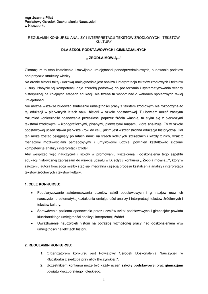 mgr Joanna Piłat Powiatowy Ośrodek Doskonalenia Nauczycieli w Kluczborku REGULAMIN KONKURSU ANALIZY I INTERPRETACJI TEKSTÓW ŹRÓDŁOWYCH I TEKSTÓW KULTURY DLA SZKÓŁ PODSTAWOWYCH I GIMNAZJALNYCH „ ŹRÓDŁA MÓWIĄ...” Gimnazjum to etap kształcenia i rozwijania umiejętności ponadprzedmiotowych, budowania podstaw pod przyszłe struktury wiedzy. Na arenie historii taką kluczową umiejętnością jest analiza i interpretacja tekstów źródłowych i tekstów kultury. Nabycie tej kompetencji daje szeroką podstawę do poszerzania i systematyzowania wiedzy historycznej na kolejnych etapach edukacji, nie trzeba tu wspominać o walorach społecznych takiej umiejętności. Nie można wszakże budować skutecznie umiejętności pracy z tekstem źródłowym nie rozpoczynając tej edukacji w pierwszych latach nauki historii w szkole podstawowej. Tu bowiem uczeń zaczyna rozumieć konieczność poznawania przeszłości poprzez źródła właśnie, tu styka się z pierwszymi tekstami źródłowymi – ikonograficznymi, pisanymi, pierwszymi mapami, które analizuje. To w szkole podstawowej uczeń stawia pierwsze kroki do celu, jakim jest wszechstronna edukacja historyczna. Cel ten może zostać osiągnięty po latach nauki na trzech kolejnych szczeblach i każdy z nich, wraz z rosnącymi możliwościami percepcyjnymi i umysłowymi ucznia, powinien kształtować złożone kompetencje analizy i interpretacji źródeł. Aby wesprzeć więc nauczycieli i szkoły w promowaniu kształcenia i doskonalenia tego aspektu edukacji historycznej zapraszam do wzięcia udziału w IX edycji konkursu „ Źródła mówią...”, który w założeniu autora koncepcji miałby stać się integralną częścią procesu kształcenia analizy i interpretacji tekstów źródłowych i tekstów kultury. 1. CELE KONKURSU: Popularyzowanie zainteresowania uczniów szkół podstawowych i gimnazjów oraz ich nauczycieli problematyką kształcenia umiejętności analizy i interpretacji tekstów źródłowych i tekstów kultury. Sprawdzenie poziomu opanowania przez uczniów szkół podstawowych i gimnazjów powiatu kluczborskiego umiejętności analizy i interpretacji źródeł. Uwrażliwienie nauczycieli historii na potrzebę wzmożonej pracy nad doskonaleniem w\w umiejętności na lekcjach historii. 2. REGULAMIN KONKURSU: 1. Organizatorem konkursu jest Powiatowy Ośrodek Doskonalenia Nauczycieli w Kluczborku z siedzibą przy ulicy Byczyńskiej 7. 2. Uczestnikiem konkursu może być każdy uczeń szkoły podstawowej oraz gimnazjum powiatu kluczborskiego i oleskiego. 1 3. Szkoły otrzymują informację o konkursie do 30 września 2012 roku. 4. Konkurs odbywa się na dwóch szczeblach: Etap szkolny : listopad – grudzień 2012 Etap rejonowy: marzec - kwiecień 2013 5. Szkolne komisje konkursowe I etapu nie później niż do 15 stycznia 2013 roku wysyłają do Organizatora protokół przebiegu I etapu konkursu wraz z listą uczestników zakwalifikowanych do II etapu konkursu w formie deklaracji uczestnictwa w konkursie zał. nr 1. 6. Do II etapu kwalifikuje się co najwyżej 2 najlepszych uczniów z palcówki liczącej do 200 uczniów i co najwyżej 3 najlepszych uczniów z placówki liczącej powyżej 200 uczniów. 7. Konkurs odbywa się w dwóch osobnych kategoriach: Uczniowie szkół podstawowych Uczniowie szkół gimnazjalnych 8. Uczeń startuje w konkursie indywidualnie. 9. Konkurs polega na wypełnieniu testu opartego na analizie i interpretacji różnego rodzaju tekstów źródłowych i tekstów kultury. 10. Nauczyciele szkół biorących udział w konkursie opracowują zestaw tekstów źródłowych do analizy do etapu I. Organizator – Powiatowy Ośrodek Doskonalenia Nauczycieli w Kluczborku - przygotowuje zestaw tekstów źródłowych do etapu II. 11. Zadania pisemne na wszystkich etapach konkursu są anonimowe. Dane dotyczące uczestnika ( imię i nazwisko, szkoła, klasa) uczestnik dołącza do pracy w zaklejonej kopercie w obecności członka komisji nadzorującej przebieg konkursu. 12. Odtajnienie danych osobowych z zaklejonych kopert następuje dopiero po ustaleniu punktacji oraz podjęciu decyzji, co do dopuszczenia autora do etapu II konkursu lub określeniu laureatów i finalistów II etapu. 13. Prace uczniów na II etapie konkursu oceniane są na podstawie schematu punktowania przygotowanego przez autora zestawu tekstów przez komisję powołaną przez dyrektora Powiatowego Ośrodka Doskonalenia Nauczycieli w Kluczborku. W skład komisji wchodzi doradca metodyczny historii i wiedzy o społeczeństwie ( jako przewodniczący) i czterech członków powołanych ze szkół i placówek biorących udział w konkursie. 14. Dokumentacja komisji szkolnej i powiatowej obejmuje: Listę członków komisji Protokoły zawodów odpowiedniego stopnia Prace pisemne zawodników Pisma przychodzące i wychodzące Listę uczniów zgłoszonych do konkursu Listę szkół i placówek zgłoszonych do etapu powiatowego 15. Wydatki związane z organizacją konkursu pokrywa Organizator. 16. Organizator ma prawo dokonywać zmian w niniejszym regulaminie. 2 3. UMIEJĘTNOŚCI BADANE W TRAKCIE KONKURSU: Na szczeblu powiatowym test zostanie przygotowany oddzielnie dla uczniów szkół podstawowych i dla gimnazjalistów. Znajdą się w nim więc źródła i zadania odpowiednio dobrane do możliwości ucznia w zakresie opanowania umiejętności analizy i interpretacji tekstów źródłowych. Poniższe zestawienie zawiera listę umiejętności koniecznych do pracy ze źródłami w trakcie poznawania przeszłości, zadania testowe przygotowane zostaną w oparciu o nią z uwzględnieniem poziomu rozwoju ucznia. Rodzaj operacji do wykonania, umiejętności Uczeń potrafi: Podać informacje zaczerpnięte ze źródła historycznego, Dokonać selekcji materiału Wyciągać wnioski ze źródeł historycznych Określić rodzaj źródeł historycznych Odróżnić opinie od faktów Umieszczać wykorzystywane źródła w kontekście Przedstawić info