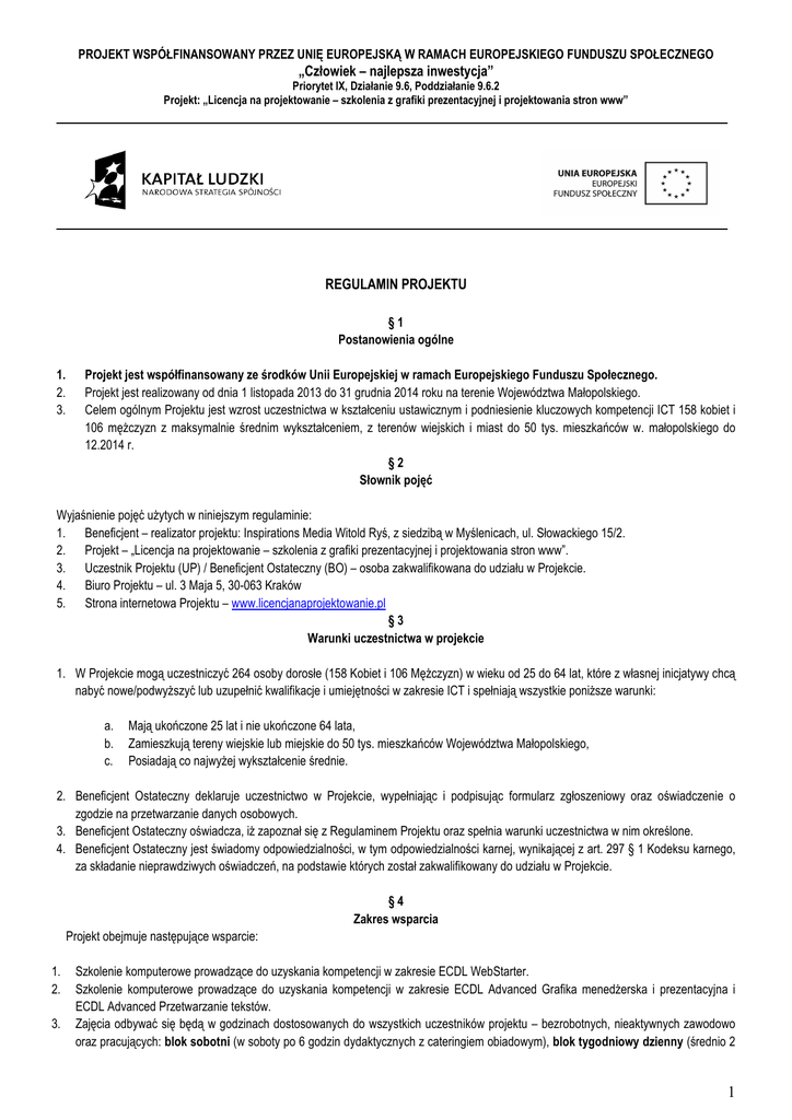PROJEKT WSPÓŁFINANSOWANY PRZEZ UNIĘ EUROPEJSKĄ W RAMACH EUROPEJSKIEGO FUNDUSZU SPOŁECZNEGO „Człowiek – najlepsza inwestycja” Priorytet IX, Działanie 9.6, Poddziałanie 9.6.2 Projekt: „Licencja na projektowanie – szkolenia z grafiki prezentacyjnej i projektowania stron www” REGULAMIN PROJEKTU §1 Postanowienia ogólne 1. 2. 3. Projekt jest współfinansowany ze środków Unii Europejskiej w ramach Europejskiego Funduszu Społecznego. Projekt jest realizowany od dnia 1 listopada 2013 do 31 grudnia 2014 roku na terenie Województwa Małopolskiego. Celem ogólnym Projektu jest wzrost uczestnictwa w kształceniu ustawicznym i podniesienie kluczowych kompetencji ICT 158 kobiet i 106 mężczyzn z maksymalnie średnim wykształceniem, z terenów wiejskich i miast do 50 tys. mieszkańców w. małopolskiego do 12.2014 r. §2 Słownik pojęć Wyjaśnienie pojęć użytych w niniejszym regulaminie: 1. Beneficjent – realizator projektu: Inspirations Media Witold Ryś, z siedzibą w Myślenicach, ul. Słowackiego 15/2. 2. Projekt – „Licencja na projektowanie – szkolenia z grafiki prezentacyjnej i projektowania stron www”. 3. Uczestnik Projektu (UP) / Beneficjent Ostateczny (BO) – osoba zakwalifikowana do udziału w Projekcie. 4. Biuro Projektu – ul. 3 Maja 5, 30-063 Kraków 5. Strona internetowa Projektu – www.licencjanaprojektowanie.pl §3 Warunki uczestnictwa w projekcie 1. W Projekcie mogą uczestniczyć 264 osoby dorosłe (158 Kobiet i 106 Mężczyzn) w wieku od 25 do 64 lat, które z własnej inicjatywy chcą nabyć nowe/podwyższyć lub uzupełnić kwalifikacje i umiejętności w zakresie ICT i spełniają wszystkie poniższe warunki: a. b. c. Mają ukończone 25 lat i nie ukończone 64 lata, Zamieszkują tereny wiejskie lub miejskie do 50 tys. mieszkańców Województwa Małopolskiego, Posiadają co najwyżej wykształcenie średnie. 2. Beneficjent Ostateczny deklaruje uczestnictwo w Projekcie, wypełniając i podpisując formularz zgłoszeniowy oraz oświadczenie o zgodzie na przetwarzanie danych osobowych. 3. Beneficjent Ostateczny oświadcza, iż zapoznał się z Regulaminem Projektu oraz spełnia warunki uczestnictwa w nim określone. 4. Beneficjent Ostateczny jest świadomy odpowiedzialności, w tym odpowiedzialności karnej, wynikającej z art. 297 § 1 Kodeksu karnego, za składanie nieprawdziwych oświadczeń, na podstawie których został zakwalifikowany do udziału w Projekcie. §4 Zakres wsparcia Projekt obejmuje następujące wsparcie: 1. 2. 3. Szkolenie komputerowe prowadzące do uzyskania kompetencji w zakresie ECDL WebStarter. Szkolenie komputerowe prowadzące do uzyskania kompetencji w zakresie ECDL Advanced Grafika menedżerska i prezentacyjna i ECDL Advanced Przetwarzanie tekstów. Zajęcia odbywać się będą w godzinach dostosowanych do wszystkich uczestników projektu – bezrobotnych, nieaktywnych zawodowo oraz pracujących: blok sobotni (w soboty po 6 godzin dydaktycznych z cateringiem obiadowym), blok tygodniowy dzienny (średnio 2 1 PROJEKT WSPÓŁFINANSOWANY PRZEZ UNIĘ EUROPEJSKĄ W RAMACH EUROPEJSKIEGO FUNDUSZU SPOŁECZNEGO „Człowiek – najlepsza inwestycja” Priorytet IX, Działanie 9.6, Poddziałanie 9.6.2 Projekt: „Licencja na projektowanie – szkolenia z grafiki prezentacyjnej i projektowania stron www” 4. 5. 6. 7. 8. 9. 10. 11. 12. 13. x 4 godziny dydaktyczne tygodniowo, w dni robocze, między 9 a 16, z zapewnionym cateringiem kawowym), blok tygodniowy popołudniowy (średnio 2 x 3 lub 2 x 4 godziny dydaktyczny tygodniowo, w dni robocze, w godzinach popołudniowych). Ukończenie kursu potwierdzone certyfikatem zakończenia szkoleń. Po każdym szkoleniu przeprowadzony zostanie egzamin wewnętrzny badający poziom wiedzy UP. Aby otrzymać certyfikat zakończenia szkoleń UP nie może opuścić więcej niż 20% godzin zajęć bez podawania przyczyny nieobecności. Wszystkie szkolenia odbędą się na terenie woj. Małopolskiego w miejscowościach wybranych wspólnie przez UP, pod warunkiem dostępności sal komputerowych we wskazanych miejscowościach. Egzaminy ECDL odbędą się w jednym z certyfikowanych centrum egzaminacyjnym ECDL z woj. małopolskiego po zakończonym szkoleniu. Każdy z UP będzie miał zapewnioną możliwość zdania egzaminu ECDL WebStarter lub ECDL Advanced (moduły Przetwarzanie tekstów i Grafika menedżerska), który zakończy się uzyskaniem certyfikatu ECDL. W razie konieczności przewidziane są również egzaminy poprawkowe. Grupa szkoleniowa wynosi 11 osób. Kurs trwa 60 godzin dydaktycznych (po 45 minut) i obejmuje tematykę zgodną z Sylabusem ECDL dostępnym na stronie www.ecdl.pl. UP wybiera tylko jeden kurs: ECDL WebStarter lub ECDL Advanced. Osoby bezrobotne mogą ubiegać się o zwrot kosztów dojazdu na zajęcia, na podstawie wniosku, stanowiącego Załącznik nr 1 do Regulaminu. Każdy UP utrzyma podręcznik do samodzielnej nauki poza zajęciami. Zajęcia prowadzone będą przez wykwalifikowana kadrę szkoleniową. §5 Procedury rekrutacji 1. Rekrutacja będzie prowadzona na bieżąco i będzie obejmować cały okres trwania Projektu. 2. W trakcie trwania rekrutacji wyłonionych zostanie 264 Uczestników Projektu z obszaru woj. małopolskiego. 3. Procedura rekrutacji obejmuje następujące etapy: a. b. c. d. e. analiza złożonych formularzy zgłoszeniowych, weryfikacja kryteriów formalnych weryfikacja kryteriów strategicznych, kwalifikacja na podstawie dodatkowych punktów: + 1 punkt dla osób bezrobotnych (na podstawie zaświadczenia z Urzędu Pracy) + 1 punkt dla osób korzystających z pomocy społecznej (na podstawie zaświadczenia z Ośrodka Pomocy Społęcznej) + 1 punkt dla osób powyżej 50 roku życia + 1 punkt dla osób zamieszkałych na terenach wiejskich + 1 punkt dla kobiet ogłoszenie listy osób zakwalifikowanych i listy rezerwowej (o kolejności na listach decyduje największa liczba punktów a w przypadku tej samej liczby punktów data złożenia lub data nad