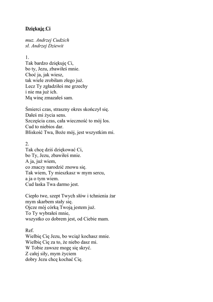Dziękuję Ci muz. Andrzej Cudzich sł. Andrzej Dziewit 1. Tak bardzo dziękuję Ci, bo ty, Jezu, zbawiłeś mnie. Choć ja, jak wiesz, tak wiele zrobiłam złego już. Lecz Ty zgładziłeś me grzechy i nie ma już ich. Mą winę zmazałeś sam. Śmierci czas, straszny okres skończył się. Dałeś mi życia sens. Szczęścia czas, cała wieczność to mój los. Cud to niebios dar. Bliskość Twa, Boże mój, jest wszystkim mi. 2. Tak chcę dziś dziękować Ci, bo Ty, Jezu, zbawiłeś mnie. A ja, już wiem, co znaczy narodzić znowu się. Tak wiem, Ty mieszkasz w mym sercu, a ja o tym wiem. Cud łaska Twa darmo jest. Ciepło twe, szept Twych słów i tchnienia żar mym skarbem stały się. Ojcze mój córką Twoją jestem już. To Ty wybrałeś mnie, wszystko co dobrem jest, od Ciebie mam. Ref. Wielbię Cię Jezu, bo wciąż kochasz mnie. Wielbię Cię za to, że niebo dasz mi. W Tobie zawsze mogę się skryć. Z całej siły, mym życiem dobry Jezu chcę kochać Cię.
