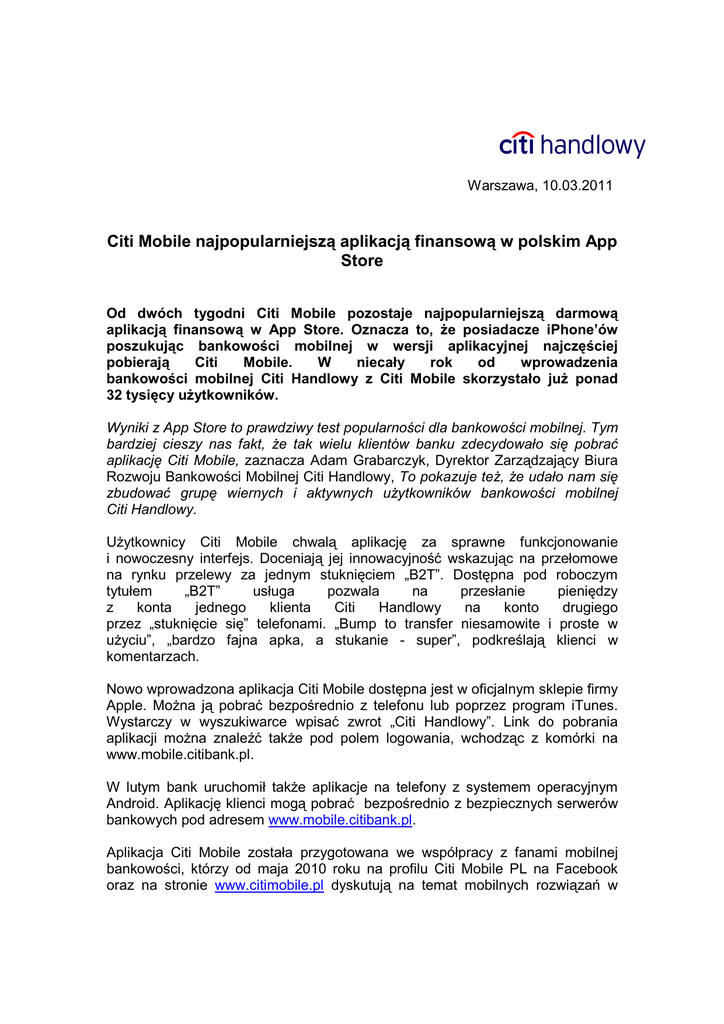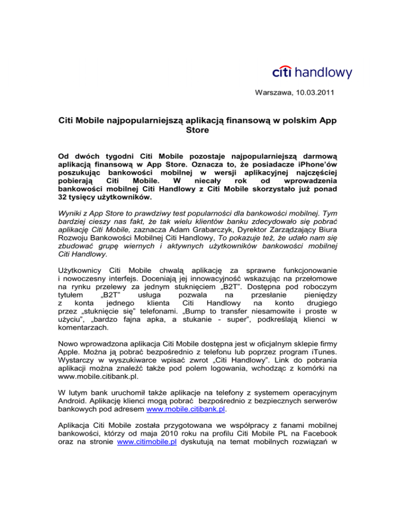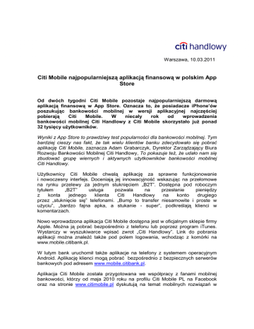 Warszawa, 10.03.2011 Citi Mobile najpopularniejszą aplikacją finansową w polskim App Store Od dwóch tygodni Citi Mobile pozostaje najpopularniejszą darmową aplikacją finansową w App Store. Oznacza to, Ŝe posiadacze iPhone’ów poszukując bankowości mobilnej w wersji aplikacyjnej najczęściej pobierają Citi Mobile. W niecały rok od wprowadzenia bankowości mobilnej Citi Handlowy z Citi Mobile skorzystało juŜ ponad 32 tysięcy uŜytkowników. Wyniki z App Store to prawdziwy test popularności dla bankowości mobilnej. Tym bardziej cieszy nas fakt, Ŝe tak wielu klientów banku zdecydowało się pobrać aplikację Citi Mobile, zaznacza Adam Grabarczyk, Dyrektor Zarządzający Biura Rozwoju Bankowości Mobilnej Citi Handlowy, To pokazuje teŜ, Ŝe udało nam się zbudować grupę wiernych i aktywnych uŜytkowników bankowości mobilnej Citi Handlowy. UŜytkownicy Citi Mobile chwalą aplikację za sprawne funkcjonowanie i nowoczesny interfejs. Doceniają jej innowacyjność wskazując na przełomowe na rynku przelewy za jednym stuknięciem „B2T”. Dostępna pod roboczym tytułem „B2T” usługa pozwala na przesłanie pieniędzy z konta jednego klienta Citi Handlowy na konto drugiego przez „stuknięcie się” telefonami. „Bump to transfer niesamowite i proste w uŜyciu”, „bardzo fajna apka, a stukanie - super”, podkreślają klienci w komentarzach. Nowo wprowadzona aplikacja Citi Mobile dostępna jest w oficjalnym sklepie firmy Apple. MoŜna ją pobrać bezpośrednio z telefonu lub poprzez program iTunes. Wystarczy w wyszukiwarce wpisać zwrot „Citi Handlowy”. Link do pobrania aplikacji moŜna znaleźć takŜe pod polem logowania, wchodząc z komórki na www.mobile.citibank.pl. W lutym bank uruchomił takŜe aplikacje na telefony z systemem operacyjnym Android. Aplikację klienci mogą pobrać bezpośrednio z bezpiecznych serwerów bankowych pod adresem www.mobile.citibank.pl. Aplikacja Citi Mobile została przygotowana we współpracy z fanami mobilnej bankowości, którzy od maja 2010 roku na profilu Citi Mobile PL na Facebook oraz na stronie www.citimobile.pl dyskutują na temat mobilnych rozwiązań w bankowości. Teraz entuzjaści „banku w komórce” zadecydują takŜe, jaką nazwę zdobędą innowacyjne przelewy Citi Handlowy za jednym stuknięciem. Do 15 marca przez formularz zamieszczony na profilu Citi Mobile PL na Facebook fani mogą zgłaszać swoje propozycje nazwy na nową usługę. O tym, które hasło zwycięŜy w konkursie zadecydują w głosowaniu sami internauci. Osoba, której hasło zdobędzie największą liczbę głosów otrzyma główną nagrodę – Tablet Samsung Galaxy Tab. Dla kolejnych osób z największą liczbą wskazań czekają nagrody - karty przedpłacone o wartości 500 zł kaŜda i 50 pamięci USB z logo Citi Mobile. Dodatkowo, jury konkursu moŜe przyznać (bez względu na liczbę oddanych przez Internautów głosów) jednemu z pomysłodawców nagrodę specjalną – kartę przedpłaconą o wartości 1000 zł. Szczegółowe informacje na temat konkursu „Wymyśl nazwę dla B2T – przelew za jednym stuknięciem”, w tym regulamin konkursu, znaleźć moŜna na stronie www.citimobile.pl/b2t oraz na profilu Citi Mobile PL na Facebook i BLIP. Dodatkowych informacji udzielają: Paweł Zegarłowicz, Dyrektor Biura Prasowego, E-mail: [email protected], tel. (0-22) 657 72 97 Dorota Szostek-Rustecka, Kierownik ds. kontaktów z mediami, e-mail: [email protected], tel. (0-22) 22 690 1049 Bank Handlowy w Warszawie S.A. to jedna z największych instytucji finansowych w Polsce, oferująca pod marką Citi Handlowy bogaty i nowoczesny asortyment produktów i usług bankowości korporacyjnej, inwestycyjnej i detalicznej. Bank Handlowy obsługuje 20 tys. klientów korporacyjnych i 800 tys. klientów indywidualnych poprzez nowoczesne kanały dystrybucji oraz sieć ponad 188 oddziałów. W skład grupy kapitałowej Banku wchodzą takie podmioty jak: Dom Maklerski Banku Handlowego i Handlowy Leasing. PrzynaleŜność do Citigroup, największej na świecie instytucji finansowej, zapewnia klientom Banku Handlowego dostęp do usług finansowych w ponad 100 krajach. Dodatkowe informacje moŜna uzyskać na stronie internetowej www.citihandlowy.pl. Citi (NYSE:C) to wiodąca globalna firma świadcząca usługi finansowe. Obsługuje około 200 milionów klientów indywidualnych, korporacyjnych, rządowych i instytucjonalnych w ponad 100 krajach. Zapewnia bogaty wachlarz produktów i usług finansowych, jak bankowość komercyjna i inwestycyjna, bankowość detaliczna, kredytowanie, ubezpieczenia, usługi na rynków papierów wartościowych i zarządzanie aktywami. Główne marki pod znakiem handlowym Citigroup to Citibank, CitiFinancial, Primerica, Smith Barney i Banamex. Dodatkowe informacje moŜna uzyskać na stronie internetowej www.citigroup.com.