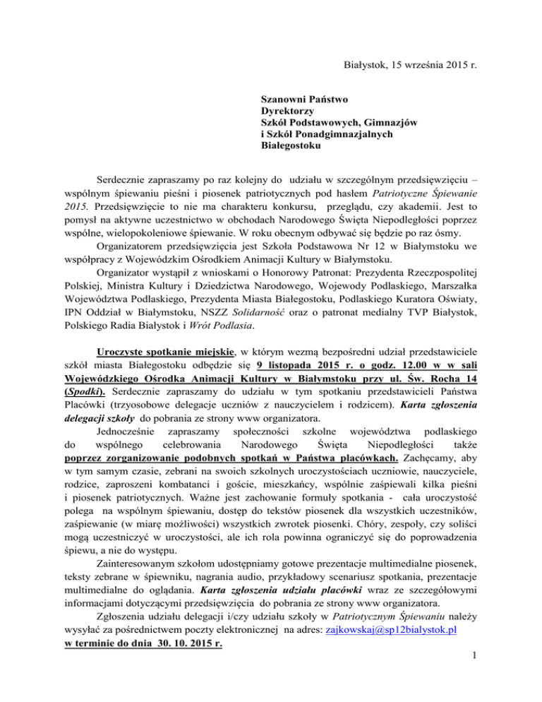 Białystok, 15 września 2015 r. Szanowni Państwo Dyrektorzy Szkół Podstawowych, Gimnazjów i Szkół Ponadgimnazjalnych Białegostoku Serdecznie zapraszamy po raz kolejny do udziału w szczególnym przedsięwzięciu – wspólnym śpiewaniu pieśni i piosenek patriotycznych pod hasłem Patriotyczne Śpiewanie 2015. Przedsięwzięcie to nie ma charakteru konkursu, przeglądu, czy akademii. Jest to pomysł na aktywne uczestnictwo w obchodach Narodowego Święta Niepodległości poprzez wspólne, wielopokoleniowe śpiewanie. W roku obecnym odbywać się będzie po raz ósmy. Organizatorem przedsięwzięcia jest Szkoła Podstawowa Nr 12 w Białymstoku we współpracy z Wojewódzkim Ośrodkiem Animacji Kultury w Białymstoku. Organizator wystąpił z wnioskami o Honorowy Patronat: Prezydenta Rzeczpospolitej Polskiej, Ministra Kultury i Dziedzictwa Narodowego, Wojewody Podlaskiego, Marszałka Województwa Podlaskiego, Prezydenta Miasta Białegostoku, Podlaskiego Kuratora Oświaty, IPN Oddział w Białymstoku, NSZZ Solidarność oraz o patronat medialny TVP Białystok, Polskiego Radia Białystok i Wrót Podlasia. Uroczyste spotkanie miejskie, w którym wezmą bezpośredni udział przedstawiciele szkół miasta Białegostoku odbędzie się 9 listopada 2015 r. o godz. 12.00 w w sali Wojewódzkiego Ośrodka Animacji Kultury w Białymstoku przy ul. Św. Rocha 14 (Spodki). Serdecznie zapraszamy do udziału w tym spotkaniu przedstawicieli Państwa Placówki (trzyosobowe delegacje uczniów z nauczycielem i rodzicem). Karta zgłoszenia delegacji szkoły do pobrania ze strony www organizatora. Jednocześnie zapraszamy społeczności szkolne województwa podlaskiego do wspólnego celebrowania Narodowego Święta Niepodległości także poprzez zorganizowanie podobnych spotkań w Państwa placówkach. Zachęcamy, aby w tym samym czasie, zebrani na swoich szkolnych uroczystościach uczniowie, nauczyciele, rodzice, zaproszeni kombatanci i goście, mieszkańcy, wspólnie zaśpiewali kilka pieśni i piosenek patriotycznych. Ważne jest zachowanie formuły spotkania - cała uroczystość polega na wspólnym śpiewaniu, dostęp do tekstów piosenek dla wszystkich uczestników, zaśpiewanie (w miarę możliwości) wszystkich zwrotek piosenki. Chóry, zespoły, czy soliści mogą uczestniczyć w uroczystości, ale ich rola powinna ograniczyć się do poprowadzenia śpiewu, a nie do występu. Zainteresowanym szkołom udostępniamy gotowe prezentacje multimedialne piosenek, teksty zebrane w śpiewniku, nagrania audio, przykładowy scenariusz spotkania, prezentacje multimedialne do oglądania. Karta zgłoszenia udziału placówki wraz ze szczegółowymi informacjami dotyczącymi przedsięwzięcia do pobrania ze strony www organizatora. Zgłoszenia udziału delegacji i/czy udziału szkoły w Patriotycznym Śpiewaniu należy wysyłać za pośrednictwem poczty elektronicznej na adres: [email protected] w terminie do dnia 30. 10. 2015 r. 1 Organizatorom bardzo zależy na zebraniu informacji o przebiegu spotkania w Państwa placówce, dlatego uprzejmie prosimy o wysłanie kliku zdjęć i krótkiego sprawozdania z przebiegu uroczystości w Państwa Placówce wg wzoru (do pobrania ze strony www organizatora) w terminie do 20. 11. 2015 r. na adres: [email protected] Formularze kart zgłoszeń i wzór sprawozdania oraz wszelkie materiały multimedialne do pobrania dostępne są na stronie www.sp12bialystok.pl w zakładce: Nasze przedsięwzięcia – Patriotyczne Śpiewanie. Lista delegacji szkół i placówek uczestniczących w Patriotycznym Śpiewaniu będzie wyświetlona na ekranie podczas uroczystego spotkania miejskiego, zamieszczona w Śpiewniku pieśni i piosenek patriotycznych – pamiątce ze spotkania, w sprawozdaniach do osób, które objęły przedsięwzięcie honorowym i medialnym patronatem oraz w fotorelacji przygotowanej w formie pliku filmowego i umieszczonej na stronie www organizatora. Każde kolejne Patriotyczne Śpiewanie jest potwierdzeniem, jak bardzo zaproponowana przez organizatorów formuła obchodów Narodowego Święta Niepodległości trafia w potrzeby społeczne i serca ludzi. Patriotyczne Śpiewanie integruje społeczności szkolne i lokalne województwa podlaskiego wokół idei patriotycznych. Jest też spotkaniem pokoleń - umożliwia dzieciom i młodzieży bezpośredni kontakt z bohaterami z czasów wojny. Śpiewając wspólnie polskie pieśni patriotyczne umacniamy naszą tożsamość narodową w sercach młodych Polaków i uhonorowujemy ludzi, którzy walczyli o niepodległość Polski. Dzięki temu to przedsięwzięcie ma wyjątkowe znaczenie dla kultury polskiej i ochrony dziedzictwa narodowego. Serdecznie zapraszamy do udziału w przedsięwzięciu i upowszechnianiu idei patriotycznego, wielopokoleniowego śpiewania. Z poważaniem Anna Satuła Dyrektor Szkoły Podstawowej Nr 12 w Białymstoku 2