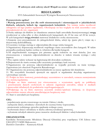 W zdrowym ciele zdrowy duch! Wsiądź na rower - będziesz zuch! REGULAMIN XVI Zabrzańskich Szosowych Wyścigów Rowerowych Niezrzeszonych Postanowienia ogólne! 1.Wyścig przeznaczony jest dla osób niezrzeszonych i nietrenujących w jakichkolwiek klubach, sekcjach, kołach itp. organizacjach kolarskich. Nie istnieje żadna możliwość odstępstwa od tego punktu regulaminu. Obowiązuje on bez względu na wiek uczestnika i czas przynależności do ww. organizacji. 2.Osoby należące do klubów (w charakterze amatora bądź zawodnika licencjonowanego) mogą rywalizować ze sobą tylko w dwu dodatkowych kategoriach: do 23 lat oraz od 24 lat wzwyż. W tych kategoriach mogą również startować dodatkowo osoby niezrzeszone. 3.Zatajenie swej przynależności do jakiegokolwiek klubu, sekcji itp. (patrz pkt.1.) wiąże się z dożywotnią dyskwalifikacją. 4.Uczestnicy wyścigu startują w odpowiedniej dla swego wieku kategorii. 5.Organizatorzy dopuszczają możliwość wspólnego startu uczestników dwu kategorii. W takim przypadku punktacja będzie osobna tj. właściwa dla każdej kategorii. 6.Od niepełnoletnich wymagana jest pisemna zgoda rodziców na start dziecka. Jest ona równoznaczna z wzięciem odpowiedzialności za dziecko w trakcie trwania wyścigu i całej imprezy. 7.Przy zapisie należy wykazać się legitymacją lub dowodem osobistym. 8.Dopuszczeni do startu zostaną tylko uczestnicy posiadający kask sztywny. 9.Organizatorzy nie ponoszą odpowiedzialności za wypadki powstałe na trasie wyścigu. Zapewniona jest obecność Pogotowia Ratunkowego. 10. Organizatorzy nie ponoszą odpowiedzialności za rzeczy zgubione lub skradzione. 11. We wszystkich kwestiach spornych nie ujętych w regulaminie decydują organizatorzy i prowadzący zawody. 12. Podpis na liście startowej, potwierdzający uczestnictwo w zawodach, oznacza zaznajomienie się z treścią regulaminu. 13.Podpis na liście startowej jest równoznaczny z wyrażeniem zgody na publikację i przetwarzanie danych osobowych w zakresie organizacji zawodów, relacji w mediach i sprawozdań składanych do podmiotów współorganizujących. 14.Podpisując się na liście startowej uczestnik (rodzic/opiekun) deklaruje, że dysponuje odpowiednim stanem zdrowia umożliwiającym bezpieczny start. 15. Start w zawodach jest bezpłatny. CEL: - popularyzacja sportu rowerowego na terenie Zabrza i okolic, - zachęcenie dzieci, młodzieży i dorosłych do czynnej formy wypoczynku, - promowanie rodzinnego sposobu spędzania wolnego czasu, - wychowanie dzieci i młodzieży w duchu zdrowej rywalizacji sportowej, - wyłonienie młodych talentów przez trenerów okolicznych klubów i sekcji kolarskich. ORGANIZATOR: Katolickie Stowarzyszenie Młodzieży Diecezji Gliwickiej przy współpracy UM Zabrze oraz UKS QVO VADIS Makoszowy. Dyrektor Zawodów – Katarzyna Kłysik Koordynator ds. sportowych – ks. prob. Rafał Wyleżoł TERMIN I MIEJSCE: 25. września 2016 r. Dwujezdniowy odcinek ul. Bytomskiej łączącej Centrum z Biskupicami. Start od strony Centrum (przy skrzyżowaniu z ul. Hagera). Wyścig przeprowadzony zostanie na trasie okrężnej o długości 2700 m, przy ruchu ulicznym zamkniętym. Za zamknięcie i zorganizowanie objazdu odpowiadają wyznaczeni pracownicy Miejskiego Zarządu Dróg i Infrastruktury Informatycznej w Zabrzu. Porządek zapewniają wolontariusze KSM i UKS Quo Vadis Makoszowy pod przewodnictwem p. dyr. Ryszarda Bębna. ZAPISY: Przy starcie od godz. 12.00 do 13.00 KATEGORIE: (osobno dla mężczyzn i kobiet) Do lat 6 - dystans specjalny 200 m (2010-2015) od 7 do 9 lat – jedno okrążenie (2007-2009) od 10 do 12 lat – jedno okrążenie (2004-2006) od 13 do 15 lat – dwa okrążenia (2001-2003) od 16 do 19 lat – dwa okrążenia (1997-2000) od 20 do 29 lat – trzy okrążenia (1987-1996) od 30 do 39 lat – trzy okrążenia (1977-1986) od 40 do 49 lat – dwa okrążenia (1967-1976) od 50 do 59 lat – jedno okrążenie (1957-1966) od 60 lat wzwyż – jedno okrążenie (1956 i niżej) dodatkowo zrzeszeni: do 23 lat – trzy okrążenia (1993 i wyżej) od 24 lat wzwyż – trzy okrążenia (1992 i niżej) UWAGA! Bezwzględne kryterium startu w poszczególnych kategoriach stanowi ROK URODZENIA, bez względu na dzień i miesiąc!!! PATRONAT HONOROWY: Prezydent Zabrza Małgorzata Mańka Szulik PATRONAT MEDIALNY: TVP Katowice, Gość Niedzielny, Radio eM, Głos Zabrza i Rudy Śląskiej, TV Zabrze. SPONSORZY: Mostostal Zabrze, Merida. NAGRODY: Medale, dyplomy i nagrody za miejsca 1 – 3, pamiątkowe dyplomy oraz losowanie (także b. cennych) upominków dla wszystkich po zakończonym starcie w swojej kategorii niezależnie od wyniku. Organizator życzy startującym pozytywnych emocji i przyjaznej atmosfery podczas trwania zawodów. Gdy się zdrowo ciało rusza lepiej się w nim czuje dusza:) Informacje i pytania: 601 – 295 – 446, [email protected], 606-911-788, [email protected] Galeria zdjęć: www.wyscigizabrze.pl