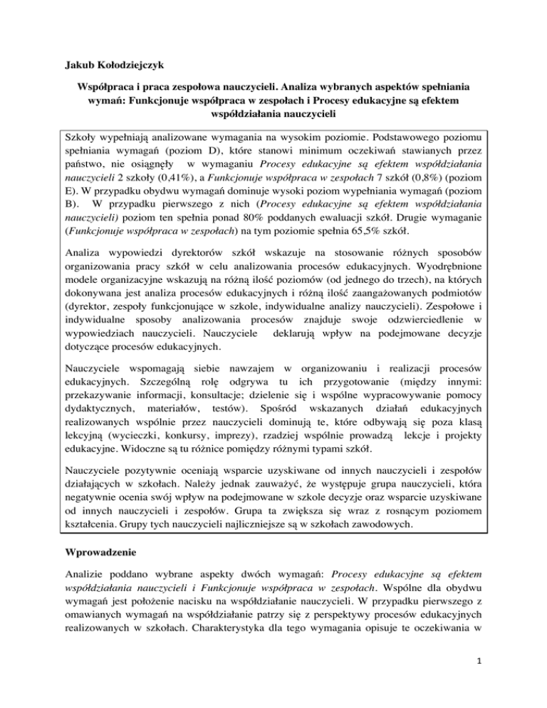 Jakub Kołodziejczyk Współpraca i praca zespołowa nauczycieli. Analiza wybranych aspektów spełniania wymań: Funkcjonuje współpraca w zespołach i Procesy edukacyjne są efektem współdziałania nauczycieli Szkoły wypełniają analizowane wymagania na wysokim poziomie. Podstawowego poziomu spełniania wymagań (poziom D), które stanowi minimum oczekiwań stawianych przez państwo, nie osiągnęły w wymaganiu Procesy edukacyjne są efektem współdziałania nauczycieli 2 szkoły (0,41%), a Funkcjonuje współpraca w zespołach 7 szkół (0,8%) (poziom E). W przypadku obydwu wymagań dominuje wysoki poziom wypełniania wymagań (poziom B). W przypadku pierwszego z nich (Procesy edukacyjne są efektem współdziałania nauczycieli) poziom ten spełnia ponad 80% poddanych ewaluacji szkół. Drugie wymaganie (Funkcjonuje współpraca w zespołach) na tym poziomie spełnia 65,5% szkół. Analiza wypowiedzi dyrektorów szkół wskazuje na stosowanie różnych sposobów organizowania pracy szkół w celu analizowania procesów edukacyjnych. Wyodrębnione modele organizacyjne wskazują na różną ilość poziomów (od jednego do trzech), na których dokonywana jest analiza procesów edukacyjnych i różną ilość zaangażowanych podmiotów (dyrektor, zespoły funkcjonujące w szkole, indywidualne analizy nauczycieli). Zespołowe i indywidualne sposoby analizowania procesów znajduje swoje odzwierciedlenie w wypowiedziach nauczycieli. Nauczyciele deklarują wpływ na podejmowane decyzje dotyczące procesów edukacyjnych. Nauczyciele wspomagają siebie nawzajem w organizowaniu i realizacji procesów edukacyjnych. Szczególną rolę odgrywa tu ich przygotowanie (między innymi: przekazywanie informacji, konsultacje; dzielenie się i wspólne wypracowywanie pomocy dydaktycznych, materiałów, testów). Spośród wskazanych działań edukacyjnych realizowanych wspólnie przez nauczycieli dominują te, które odbywają się poza klasą lekcyjną (wycieczki, konkursy, imprezy), rzadziej wspólnie prowadzą lekcje i projekty edukacyjne. Widoczne są tu różnice pomiędzy różnymi typami szkół. Nauczyciele pozytywnie oceniają wsparcie uzyskiwane od innych nauczycieli i zespołów działających w szkołach. Należy jednak zauważyć, że występuje grupa nauczycieli, która negatywnie ocenia swój wpływ na podejmowane w szkole decyzje oraz wsparcie uzyskiwane od innych nauczycieli i zespołów. Grupa ta zwiększa się wraz z rosnącym poziomem kształcenia. Grupy tych nauczycieli najliczniejsze są w szkołach zawodowych. Wprowadzenie Analizie poddano wybrane aspekty dwóch wymagań: Procesy edukacyjne są efektem współdziałania nauczycieli i Funkcjonuje współpraca w zespołach. Wspólne dla obydwu wymagań jest położenie nacisku na współdziałanie nauczycieli. W przypadku pierwszego z omawianych wymagań na współdziałanie patrzy się z perspektywy procesów edukacyjnych realizowanych w szkołach. Charakterystyka dla tego wymagania opisuje te oczekiwania w 1 następujący sposób1: Nauczyciele współdziałają w tworzeniu i analizie procesów edukacyjnych.(Poziom D) Nauczyciele wspomagają siebie nawzajem w organizowaniu i realizacji procesów edukacyjnych. Wprowadzanie zmian dotyczących przebiegu procesów edukacyjnych następuje w wyniku wspólnych ustaleń między nauczycielami (poziom B). Podkreśla ona, że proces edukacyjny realizowany w szkole (spójny, uzupełniający się) nie jest wyłącznie indywidualną sprawą prowadzących go nauczycieli, lecz jest wynikiem wspólnych działań. Ponadto stawia przed nauczycielami oczekiwanie angażowania się we wspólne przedsięwzięcia edukacyjne, wzajemnego wspierania się podczas ich realizacji i pomagania przez nauczycieli, ale także pomagania sobie nawzajem w rozwiązywaniu napotykanych w pracy problemów i wprowadzania zmian. Drugie analizowane wymaganie Funkcjonuje współpraca w zespołach koncentruje się na sposobie zorganizowania działania nauczycieli w szkole, zatem większą rolę odgrywa tu sposób zarządzania szkołą. Charakterystyka dla tego wymagania brzmi następująco: Nauczyciele pracują zespołowo i analizują efekty swojej pracy (poziom D). Nauczyciele wspólnie planują działania podejmowane w szkole i doskonalą metody i formy współpracy (poziom B). Pierwsza część charakterystyki podkreśla, że organizacja i realizacja procesów edukacyjnych prowadzonych w szkole jest wspólnym dziełem nauczycieli, wymagającym stworzenia odpowiednich warunków dla zespołowego działania i wymaga refleksji nad prowadzoną działalnością. Drugi element dotyczy rozwiązywania problemów w szkole, które zwykle nie są wyłącznie indywidualnymi problemami, lecz dotyczą większej liczby nauczycieli oraz podkreśla konieczność ciągłego doskonalenia współpracy i pracy zespołowej. W analizie skoncentrowano się na dwóch problemach przenikających omówione wyżej wymagania. Pierwszy z nich związany jest ze współdziałaniem nauczycieli podczas analizowania procesów edukacyjnych w szkołach, sposobu organizacji ich pracy oraz wpływu na podejmowane decyzje. Drugi zogniskowany jest wokół wzajemnie udzielanej przez nauczycieli pomocy podczas planowania i realizowania procesów edukacyjnych, zarówno formalnej (zespoły funkcjonujące w szkole) jak i nieformalnej. Celem analizy nie jest porównanie poziomów spełniania przez szkoły wymagań, ale skoncentrowanie się na specyficznych problemach zawartych w charakterystykach (współpracy nauczycieli podczas tworzenia i realizacji procesów edukacyjnych i pracy zespołowej), które stanowią swoje uzupełnienie. Z tego względu przedstawiona niżej analiza poziomu spełnienia wymagań ma charakter informacyjny, którego celem jest nakreślenie tła dla dalszych rozważań. Analiza poziomu spełniania wymagań 1 Rozporządzenie Ministra Edukacji Narodowej z dnia 7 października 2009 r. w sprawie nadzoru pedagogicznego (Dz. U. z dnia 9 październik
