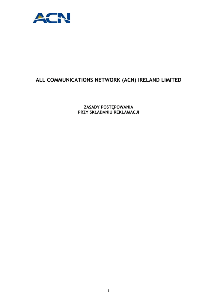 ALL COMMUNICATIONS NETWORK (ACN) IRELAND LIMITED ZASADY POSTĘPOWANIA PRZY SKŁADANIU REKLAMACJI 1 ALL COMMUNICATIONS NETWORK (ACN) IRELAND LIMITED ZASADY POSTĘPOWANIA PRZY SKŁADANIU REKLAMACJI CEL NINIEJSZEGO DOKUMENTU Niniejsze zasady postępowania („Regulamin”) dotyczą klientów korzystających z usług All Communications Network Limited („ACN”) w Irlandii. Regulamin ten zawiera: Informacje o produktach i usługach ACN; Informacje o tym, jak złożyć reklamację. Informacje o tym, jak uzyskać niezależną poradę Prosimy pamiętać, że dostępność produktów i usług opisanych w niniejszym regulaminie jest różna i może podlegać zmianom bez uprzedzenia. Niniejszy regulamin jest zgodny z europejską i irlandzką legislacją dotyczącą tego typu regulaminów. PUBLIKACJE REGULAMINU Kopie niniejszego regulaminu można otrzymać poprzez skontaktowanie się z naszym Biurem Obsługi Klienta. Regulamin można także pobrać z internetowej strony ACN www.acneuro.com z sekcji “Obsługa Klienta”. 2 SPIS TREŚCI: O NAS 3 USŁUGI ACN 3 KLIENCI 3 KONTAKT Z KLIENTAMI 4 REKLAMACJE 4 ZASADY PRZYZNAWANIA REKOMPENSATY 5 JAK UZYSKAĆ NIEZALEŻNĄ PORADĘ 6 O NAS ACN jest prywatną spółką z ograniczoną odpowiedzialnością. ACN jest częścią grupy ACN, która działa w Ameryce Północnej, Europie, Nowej Zelandii i Australii. Wyjątkowość grupy ACN polega na korzystaniu przez nas z metod MLM przy pozyskiwaniu klientów. ACN rozprowadza swoje usługi za pomocą sieci Niezależnych Przedstawicieli, którzy korzystając z zasady “ciepłego marketingu” sprzedają usługi ludziom, których znają. ACN rozpoczęło działalność na rynku europejskim w 1998 roku, a w Irlandii w roku 2002. Aby uzyskać więcej informacji o ACN, prosimy skorzystać z naszej strony internetowej www.acneuro.com. USŁUGI ACN W chwili obecnej ACN dostarcza usługę preselekcji oraz pracuje nad rozszerzeniem swojej oferty o usługę internetu i telefonii komórkowej. Preselekcja Dzięki usłudze preselekcji rozmowy mogą być automatycznie łączone przez ACN bez konieczności wybierania prefiksu. Usługa preselekcji jest dostępna dla klientów w Irlandii. Usługa ta pozwala na wybór operatora telekomunikacyjnego, który będzie realizował nasze rozmowy. Oznacza to, że posiadając linię telefoniczną Eircom, można korzystać z usług innego operatora. Umowa o świadczenie usługi preselekcji zawierana jest na czas nieokreślony. Naszym klientom oferujemy szeroką gamę uniwersalnych planów taryfowych. Aby otrzymać więcej informacji na ten temat, prosimy o kontakt pod numerem telefonu 1 800 931785 lub odwiedzenie naszej strony: www.acneuro.com, sekcja ‘Produkty’. KLIENCI Na ACN spoczywa szereg obowiązków wobec klientów wynikających z prawodawstwa irlandzkiego. Kiedy klient chce korzystać z naszych usług, wymaga to podpisania z nami prawnie wiążącej umowy. Umowa ta określa prawa i obowiązki klienta i ACN. Kopię tych zasad można znaleźć na naszej stronie internetowej www.acneuro.com w sekcji ‘Produkty’. 3 KONTAKT Z KLIENTAMI ACN komunikuje się ze swoimi klientami na różne sposoby. Jednocześnie informujemy, że przestrzegamy wszelkich zasad odnośnie ochrony danych osobowych w naszych kontaktach z klientami. Pomimo, że nie podejmujemy bezpośrednich działań marketingowych w stosunku do naszych klientów, nasi Niezależni Przedstawiciele mogą kontaktować się z klientami w celu zaoferowania dodatkowych usług. W przypadku jakichkolwiek problemów ze strony naszych Niezależnych Przedstawicieli, prosimy o kontakt z Biurem Obsługi Klienta. Nasi klienci od czasu do czasu mogą otrzymywać aktualne informacje dotyczące usług razem ze swoim rachunkiem telefonicznym. Będą to informacje dotyczące produktów i usług oraz promocji i ofert specjalnych. REKLAMACJE Jak skontaktować się z ACN w przypadku składania reklamacji W przypadku wszelkich wątpliwości i pytań dotyczących naszych usług, prosimy o kontakt listowny, telefoniczny, za pomocą faksu lub poczty elektronicznej. Aby skontaktować się z nami, można: • Zadzwonić na numer Biura Obsługi Klienta: Godziny otwarcia Biura Obsługi Klienta – Czas Greenwich (GMT) Numer telefonu do Biura Obsługi Klienta 1 800 931785 pon-pt 7:30-18:00 Fax 0207 744 0096 • Napisać do Działu Obsługi Klienta na poniższy adres: Główna siedziba ACN w Europie: PO Box 90364 1006 BJ Amsterdam Holandia • All Communications Limited Regus Harcourt Centre Dublin 2 Irlandia Network (ACN) Ireland Wysłać wiadomość e-mail na adres:[email protected] Co powinna zawierać reklamacja W przypadku składania reklamacji lub zażaleń prosimy podać: Szczegóły składanej skargi; Numer konta klienckiego w ACN; Swoje imię i nazwisko, numer telefonu, numer faksu, adres korespondencyjny i adres e-mail. Rozpatrywanie skarg Otrzymanie skargi zostanie potwierdzone w ciągu dwóch dni od daty jej złożenia, a numer referencyjny danej reklamacji zostanie dostarczony klientowi. 4 W przypadku reklamacji związanych z rachunkami, odpowiedź powinna nastąpić w ciągu 10 dni roboczych od daty otrzymania skargi. W przypadku zażaleń związanych z innymi sprawami - w ciągu 15 dni roboczych licząc od dnia otrzymania danej skargi. Jeżeli wspomniane terminy nie będą mogły zostać dotrzymane, klient zostanie poinformowany o tym fakcie oraz podany zostanie do jego wiadomości przypuszczalny termin rozpatrzenia sprawy. Wynik rozpatrzenia reklamacji w formie pisemnej zostanie przesłany do klienta, a akta tej sprawy będą przechowywane przez okres co najmniej roku. Jeżeli klient nie jest zadowolony ze sposobu przyjmowania reklamacji przez naszych agentów z Biura Obsługi Klienta, może on zawsze przekazać skargę bezpośrednio kierownikowi tego Biura. Kierownik powinien podać klientowi przewidywany czas rozwiązania danej sprawy. ZASADY PRZYZNAWANIA REKOMPENSATY Jeżeli kwestią sporną jest wysokość rachunku, klient musi zapłaci