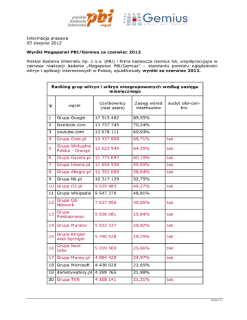 Informacja prasowa 03 sierpnia 2012 Wyniki Megapanel PBI/Gemius za czerwiec 2012 Polskie Badania Internetu Sp. z o.o. (PBI) i firma badawcza Gemius SA, współpracujące w zakresie realizacji badania „Megapanel PBI/Gemius” – standardu pomiaru oglądalności witryn i aplikacji internetowych w Polsce, opublikowały wyniki za czerwiec 2012. Ranking grup witryn i witryn niezgrupowanych według zasięgu miesięcznego lp. węzeł Użytkownicy (real users) Zasięg wśród internautów Audyt site-centric 1 Grupa Google 17 515 402 89,55% 2 facebook.com 13 737 745 70,24% 3 youtube.com 13 678 111 69,93% 4 Grupa Onet.pl 13 437 858 68,71% tak 5 Grupa Wirtualna 12 625 945 Polska - Orange 64,55% tak 6 Grupa Gazeta.pl 11 773 097 60,19% tak 7 Grupa Interia.pl 11 655 539 59,59% tak 8 Grupa Allegro.pl 11 352 009 58,04% tak 9 Grupa Nk.pl 10 317 129 52,75% 9 635 983 49,27% 11 Grupa Wikipedia 9 547 370 48,81% 10 Grupa O2.pl tak 12 Grupa GG Network 7 637 956 39,05% tak 13 Grupa Polskapresse 5 836 081 29,84% tak 5 832 337 29,82% tak 14 Grupa Murator 15 Grupa Ringier Axel Springer 5 740 528 29,35% tak 16 Grupa Next Infor 5 019 500 25,66% tak 17 Grupa Money.pl 4 884 420 24,97% tak 18 Grupa Microsoft 4 430 020 22,65% 19 demotywatory.pl 4 299 765 21,98% 20 Grupa TVN 21,31% 4 168 141 tak Strona 1 z 7 Źródło: Megapanel PBI/Gemius, czerwiec 2012 Ranking domen według zasięgu miesięcznego lp. węzeł użytkownicy (real users) zasięg wśród internautów audyt site-centric 1 google.pl 16 970 213 86,77% 2 facebook.com 13 737 745 70,24% 3 youtube.com 13 678 111 69,93% 4 onet.pl 12 461 702 63,71% 5 google.com 11 916 043 60,92% 6 wp.pl 11 192 674 57,23% tak 7 allegro.pl 10 625 224 54,32% tak 8 nk.pl 10 309 736 52,71% 9 wikipedia.org 9 482 341 48,48% 10 gazeta.pl 8 387 270 42,88% tak 11 interia.pl 7 437 487 38,03% tak 12 chomikuj.pl 6 167 456 31,53% tak 13 blogspot.com 5 352 139 27,36% 14 demotywatory.pl 4 299 765 21,98% 15 zumi.pl 4 099 151 20,96% tak 16 ceneo.pl 3 992 197 20,41% tak 17 ask.com 3 989 106 20,40% 18 kwejk.pl 3 952 940 20,21% 19 o2.pl 3 952 799 20,21% tak 20 blox.pl 3 859 885 19,73% tak tak Źródło: Megapanel PBI/Gemius, czerwiec2012 Ranking grup witryn i witryn niezgrupowanych objętych audytem site-centric według miesięcznej liczby odsłon krajowych audyt odsłony krajo- użytkownicy lp. węzeł sitewe ogółem (real users) -centric 1 Grupa Allegro.pl 4 194 557 341 11 352 009 tak 2 Grupa Onet.pl 2 583 460 037 13 437 858 tak 3 Grupa Wirtualna Polska - Orange 2 359 313 893 12 625 945 tak Strona 2 z 7 4 Grupa Gazeta.pl 1 128 394 771 11 773 097 tak 5 Grupa Interia.pl 1 068 065 164 11 655 539 tak 6 Grupa O2.pl 933 540 978 9 635 983 tak 7 plemiona.pl 550 082 975 230 265 tak 8 Grupa Spolecznosci.pl 526 388 741 2 807 587 tak 9 tablica.pl 281 425 076 2 651 910 tak 171 842 371 3 375 471 tak 10 filmweb.pl Źródło: Megapanel PBI/Gemius, czerwiec 2012 Ranking grup witryn i witryn niezgrupowanych objętych audytem site-centric według miesięcznego czasu lp. węzeł czas [godz] średni czas na użytkownika [godz:min:s] użytkownicy (real users) audyt site-centric 1 Grupa Wirtualna Polska - Orange 72624900,74 05:45:07 12 625 945 tak 2 Grupa Onet.pl 72270263,91 05:22:41 13 437 858 tak 3 Grupa Allegro.pl 48017501,33 04:13:48 11 352 009 tak 4 Grupa Interia.pl 44306970,38 03:48:05 11 655 539 tak 5 Grupa Gazeta.pl 25603911,39 02:10:29 11 773 097 tak 6 Grupa O2.pl 25100261,06 02:36:17 9 635 983 tak 7 Grupa TVN 18903118,60 04:32:07 4 168 141 tak 8 Grupa Murator 8771102,96 01:30:14 5 832 337 tak 9 Grupa Spolecznosci.pl 6805029,70 02:25:26 2 807 587 tak 10 Grupa GG Network 6389739,54 00:50:12 7 637 956 tak 11 Grupa Polskie Radio 4176303,63 03:01:30 1 380 582 tak 12 Grupa Eurozet 3660433,54 05:45:05 636 432 tak 13 plemiona.pl 3233666,50 14:02:36 230 265 tak 14 tablica.pl 2990721,88 01:07:40 2 651 910 tak 15 Grupa Ling.pl 2627146,35 04:06:44 638 866 tak 16 wiocha.pl 2470736,07 01:22:50 1 789 817 tak 17 Grupa Targeo.pl 1950436,82 01:13:53 1 584 078 tak 18 Grupa Polskapresse 1730763,33 00:17:48 5 836 081 tak 1599730,16 00:16:43 5 740 528 tak 19 Grupa Ringier Axel Springer Strona 3 z 7 20 Grupa TVP 1595994,96 00:42:33 2 250 857 tak Źródło: Megapanel PBI/Gemius, czerwiec 2012 Ranking grup witryn i witryn niezgrupowanych objętych audytem site-centric według zasięgu lp. węzeł użytkownicy (real users) zasięg wśród internautów audyt site-centric 1 Grupa Onet.pl 13 437 858 68,71% tak 2 Grupa Wirtualna Polska - Orange 12 625 945 64,55% tak 3 Grupa Gazeta.pl 11 773 097 60,19% tak 4 Grupa Interia.pl 11 655 539 59,59% tak 5 Grupa Allegro.pl 11 352 009 58,04% tak 6 Grupa O2.pl 9 635 983 49,27% tak 7 Grupa GG Network 7 637 956 39,05% tak 8 Grupa Polskapresse 5 836 081 29,84% tak 9 Grupa Murator 5 832 337 29,82% tak 10 Grupa Ringier Axel Springer 5 740 528 29,35% tak 11 Grupa Next Infor 5 019 500 25,66% tak 12 Grupa Money.pl 4 884 420 24,97% tak 13 Grupa TVN 4 168 141 21,31% tak Grupa Media Regionalne 3 992 439 20,41% tak 15 Grupa Netshare 3 684 852 18,84% tak 16 Grupa Edipresse.pl 3 564 199 18,22% tak 17 dobreprogramy.pl 3 522 815 18,01% tak 18 filmweb.pl 3 375 471 17,26% tak 19 nokaut.pl 2 905 916 14,86% tak 20 Grupa Spolecznosci.pl 2 807 587 14,35% tak 14 Źródło: Megapanel PBI/Gemius, czerwiec 2012 Ranking aplikacji według uruchomionych aplikacji (%)* Strona 4 z 7 lp. węzeł uruchomione aplikacje uruchomione aplikacji (%) 1 Grupa GG NetworkKomunikator Gadu-Gadu 9 251 033 47,30% 2 Grupa Microsoft-Komunikator 8 344 907 Skype 42,67% 3 Grupa Microsoft-Windows Media Player 7 730 993 39,53% 4 Winamp 3 021 040 15,45% 5 Grupa Ipla-Ipla 2 592 910 13,26% 6 OpenFM 1 455 883 7,44% 7 RealPlayer 1 315 914 6,73% 8 Grupa Microsoft-Komunikator 1 081 429 Windows Live Messenger 5,53% 9 VLC media player 954 584 4,88% 10 Grupa O2.pl-Komunikator Tlen.pl 655 634 3,35% 11 Grupa Google-Aplikacja Google Desktop 605 276 3,09% 12 iTunes 579 638 2,96% 13 Grupa Google-Google Earth 578 796 2,96% Komunikator Facebook Messenger 532 687 2,72% 1
