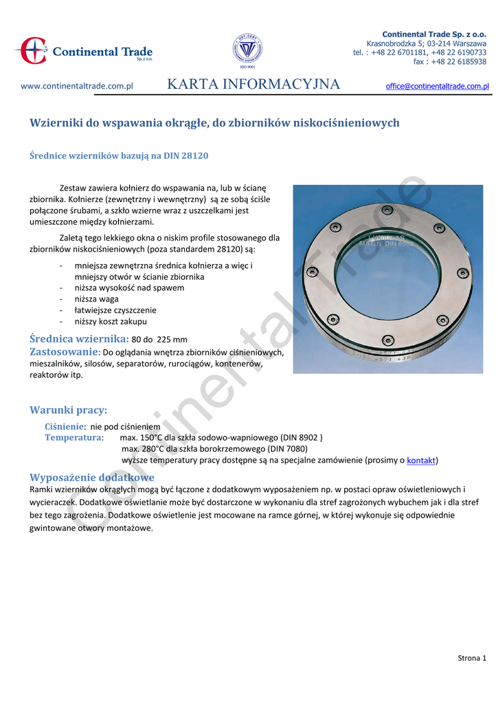 Continental Trade Sp. z o.o. Krasnobrodzka 5; 03-214 Warszawa tel. : +48 22 6701181, +48 22 6190733 fax : +48 22 6185938 KARTA INFORMACYJNA www.continentaltrade.com.pl [email protected] Wzierniki do wspawania okrągłe, do zbiorników niskociśnieniowych Zaletą tego lekkiego okna o niskim profile stosowanego dla zbiorników niskociśnieniowych (poza standardem 28120) są: ta - mniejsza zewnętrzna średnica kołnierza a więc i mniejszy otwór w ścianie zbiornika niższa wysokość nad spawem niższa waga łatwiejsze czyszczenie niższy koszt zakupu lT - ra d Zestaw zawiera kołnierz do wspawania na, lub w ścianę zbiornika. Kołnierze (zewnętrzny i wewnętrzny) są ze sobą ściśle połączone śrubami, a szkło wzierne wraz z uszczelkami jest umieszczone między kołnierzami. e Średnice wzierników bazują na DIN 28120 Średnica wziernika: 80 do 225 mm Zastosowanie: Do oglądania wnętrza zbiorników ciśnieniowych, tin Warunki pracy: en mieszalników, silosów, separatorów, rurociągów, kontenerów, reaktorów itp. C on Ciśnienie: nie pod ciśnieniem Temperatura: max. 150°C dla szkła sodowo-wapniowego (DIN 8902 ) max. 280°C dla szkła borokrzemowego (DIN 7080) wyższe temperatury pracy dostępne są na specjalne zamówienie (prosimy o kontakt) Wyposażenie dodatkowe Ramki wzierników okrągłych mogą być łączone z dodatkowym wyposażeniem np. w postaci opraw oświetleniowych i wycieraczek. Dodatkowe oświetlanie może być dostarczone w wykonaniu dla stref zagrożonych wybuchem jak i dla stref bez tego zagrożenia. Dodatkowe oświetlenie jest mocowane na ramce górnej, w której wykonuje się odpowiednie gwintowane otwory montażowe. Strona 1 Continental Trade Sp. z o.o. Krasnobrodzka 5; 03-214 Warszawa tel. : +48 22 6701181, +48 22 6190733 fax : +48 22 6185938 KARTA INFORMACYJNA www.continentaltrade.com.pl [email protected] 2 uszczelka 3 szkło wzierne Instalacja: lT ta 5 ramka górna (wierzchnia) śruby stal nierdzewna A2 lub podobna zabezpieczające en 4 Materiał stal nierdzewna 1.4571 (316 Ti) lub podobna KLINGERsil C-4400, Silikon, PTFE lub podobna - szkło sodowo - wapniowe, hartowane - DIN 8902 - szkło borokrzemowe, hartowane - DIN 7080 stal nierdzewna 1.4571 (316 Ti) lub podobna ra d Poz. Element ramka dolna 1 (bazowa) e Elementy składowe zestawu C on tin Po wspawaniu ramki dolnej - kołnierza (1) na, lub w ścianę zbiornika, uszczelki (2), szkło wzierne (3) i ramkę górną (4) umieszcza się razem w pokazanej kolejności. Następnie całość skręca się śrubami (5) dokręcając równomiernie szkło i podkładki. Śruby dokręca się ostrożnie i z równomierną siłą, zawsze dokręcając śruby leżące naprzeciwko siebie. Strona 2 Continental Trade Sp. z o.o. Krasnobrodzka 5; 03-214 Warszawa tel. : +48 22 6701181, +48 22 6190733 fax : +48 22 6185938 KARTA INFORMACYJNA www.continentaltrade.com.pl [email protected] C on Kołnierze DN d1 d2 s D k h1 h2 ilość wielkość d1 d7 Śruby mocujące Uszczelki 1 50 80 100 10 140 120 10 15 4 M6 80 102 tin Rozmiar Wymiar otworu Średnica wziernika Średnica i grubość szkła wziernego en ta lT ra d e Dostępne rozmiary 2 80 100 125 10 165 145 10 15 8 M6 100 127 3 100 125 150 10 190 170 10 15 8 M6 125 152 4 125 150 175 10 215 195 10 15 8 M6 150 177 5 150 175 200 10 240 220 10 15 8 M6 175 202 6 200 225 250 10 290 270 10 15 8 M6 225 252 7 300 300 325 15 370 345 15 20 12 M8 327 300 Strona 3