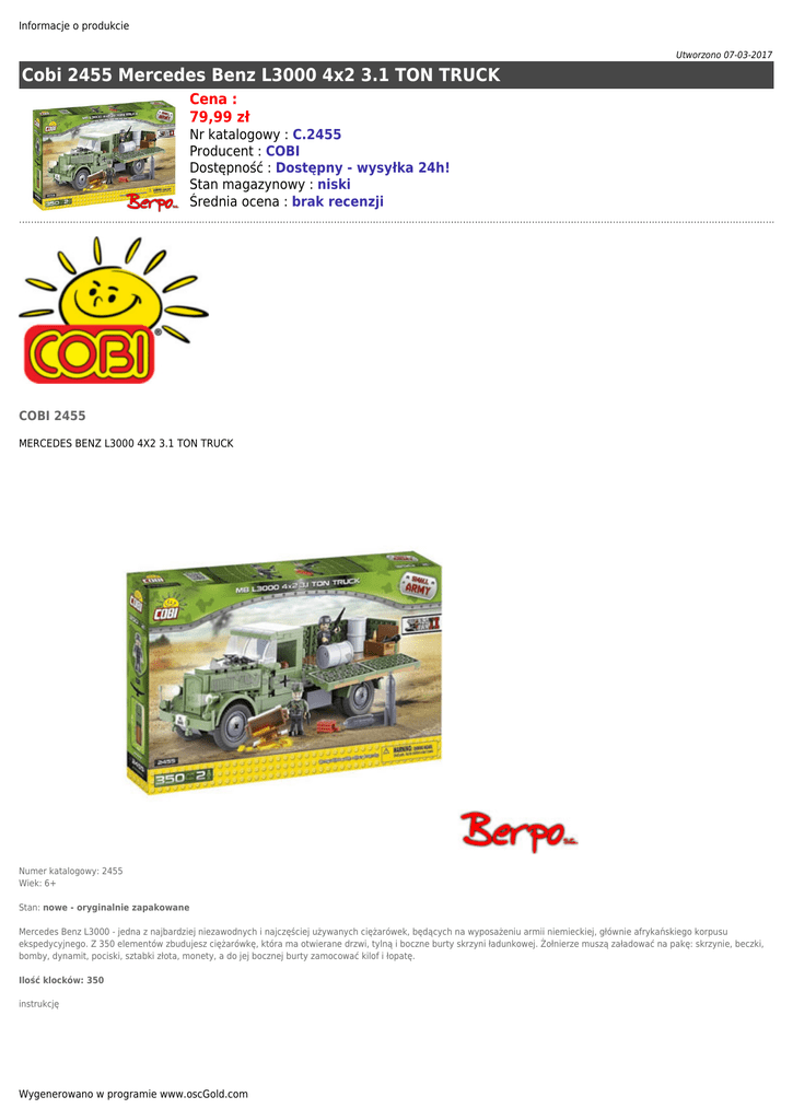 Informacje o produkcie Utworzono 07-03-2017 Cobi 2455 Mercedes Benz L3000 4x2 3.1 TON TRUCK Cena : 79,99 zł Nr katalogowy : C.2455 Producent : COBI Dostępność : Dostępny - wysyłka 24h! Stan magazynowy : niski Średnia ocena : brak recenzji COBI 2455 MERCEDES BENZ L3000 4X2 3.1 TON TRUCK Numer katalogowy: 2455 Wiek: 6+ Stan: nowe - oryginalnie zapakowane Mercedes Benz L3000 - jedna z najbardziej niezawodnych i najczęściej używanych ciężarówek, będących na wyposażeniu armii niemieckiej, głównie afrykańskiego korpusu ekspedycyjnego. Z 350 elementów zbudujesz ciężarówkę, która ma otwierane drzwi, tylną i boczne burty skrzyni ładunkowej. Żołnierze muszą załadować na pakę: skrzynie, beczki, bomby, dynamit, pociski, sztabki złota, monety, a do jej bocznej burty zamocować kilof i łopatę. Ilość klocków: 350 instrukcję Wygenerowano w programie www.oscGold.com Dostępność w salonach: Ilość sztuk: Sklep - Złotniki: 0 Sklep - zlikwidowany: 0 Sklep - Szczepankowo: 1 Dostępne opcje Cobi 2455 Mercedes Benz L3000 4x2 3.1 TON TRUCK » Wiek: 5 - 7 lat, 8 - 11 lat, 12 lat i więcej.
