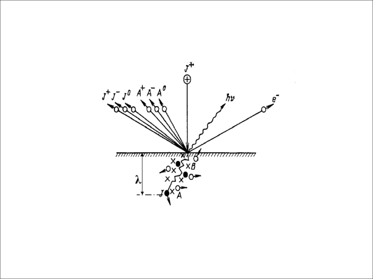 λ Głębokość wnikania jonów λ x λ No N N(x) λ x Hamowanie jonu - oddziaływania z elektronami - oddziaływanie z atomami Hamowanie jonu materiał amorficzny, polikrystaliczny dE dE dE − = + dx dx n dx e dE − = N [ Sn ( E ) + Se ( E ) ] dx λ E 1 o dE λ = ∫ dx = ∫ N S ( E ) + Se ( E ) 0 0 n Hamowanie jądrowe V’1 dp p jon E V1 x x+dx p β atom Tn γ V2 p – parametr zderzenia Tn -energia atomu po zderzeniu dx dla N- liczba atomów w 1 cm3 ∞ dE − = − N ∫ Tn ( E , p )2π pdp dx o ∞ S n = ∫ Tn dσ 0 jonu oddziaływuje z atomami znajdującymi się w pierścieniu o powierzchni 2πpdp dσ = 2π pdp ∞ S n = ∫ Tn dσ 0 p = 0 → Tmax Hamowanie elektronowe 4 M 1M 2 = E ( M1 + M 2 ) Se ( E ) = cV1 = c1 E o p = ∞ → Tmin = 0 Zi Z 2 2 r V (r ) = e f r a λ = 4 ⋅ 1017 r- odległość między jądrami atomu i knu a – promień ekranowania jądra atomowego elektronami orbitalnymi. S = 2,8 ⋅ 10 o n − 15 (Z Z1 Z 2 2/3 1 + Z ) 2 / 3 1/ 2 2 λ − nm E − Jule M1 M1 + M 2 (Z 2/3 1 + Z 22 / 3 Z1 Z 2 ) 1/ 2 M1 + M 2 E M1 Hamowanie jądrowe, elektronowe jonizacja dE dx Sn Eo = c1 Hamowanie elektronowe Hamowanie jądrowe E1/2 Hamowanie materiał monokrystaliczny d Ψο Si (110) ψ o a = d 2Z1 Z 2 e 2 dE o 1 2 a- promień ekranowania Ν Małe hamowanie elektronowe Ψ < Ψο Duże hamowanie elektronowe Ψ > Ψο λ Zdefektowanie struktury λ T ~ 1000oC t ~ 10-11s N d ≈ 0,4 N s Sn ( E ) Ed Ed – 15-30 eV (energia progowa przemieszczenia atomu) Ns doza jonów bombardujących Uszkodzenia radiacyjne Jednostki względne N/m Implantowane domieszki λp μm 0,1 0,2 0,3 mv R= eH B N+