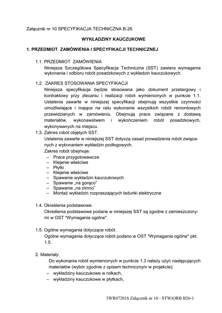 Załącznik nr 10 SPECYFIKACJA TECHNICZNA B-26 WYKŁADZINY KAUCZUKOWE 1. PRZEDMIOT ZAMÓWIENIA I SPECYFIKACJI TECHNICZNEJ 1.1. PRZEDMIOT ZAMÓWIENIA Niniejsza Szczegółowa Specyfikacja Techniczna (SST) zawiera wymagania wykonania i odbioru robót posadzkowych z wykładzin kauczukowych. 1.2. ZAKRES STOSOWANIA SPECYFIKACJI Niniejsza specyfikacja będzie stosowana jako dokument przetargowy i kontraktowy przy zlecaniu i realizacji robót wymienionych w punkcie 1.1. Ustalenia zawarte w niniejszej specyfikacji obejmują wszystkie czynności umożliwiające i mające na celu wykonanie wszystkich robót remontowych przewidzianych w zamówieniu. Obejmują prace związane z dostawą materiałów, wykonawstwem i wykończeniem robót posadzkowych, wykonywanych na miejscu. 1.3. Zakres robót objętych SST. Ustalenia zawarte w niniejszej SST dotyczą zasad prowadzenia robót związanych z wykonaniem wykładzin podłogowych. Zakres robót obejmuje: – Prace przygotowawcze – Klejenie właściwe – Płytki – Klejenie właściwe – Spawanie wykładzin kauczukowych – Spawanie „na gorąco” – Spawanie „na zimno” – Montaż wykładzin rozpraszających ładunki elektryczne 1.4. Określenia podstawowe. Określenia podstawowe podane w niniejszej SST są zgodne z zamieszczonymi w OST "Wymagania ogólne". 1.5. Ogólne wymagania dotyczące robót. Ogólne wymagania dotyczące robót podano w OST "Wymagania ogólne" pkt. 1.5. 2. Materiały. Do wykonania robót wymienionych w punkcie 1.3 należy użyć następujących materiałów (wybór zgodnie z opisem technicznym w projekcie): – wykładziny kauczukowe w rolkach, – wykładziny kauczukowe w płytkach, 3WR072016 Załącznik nr 10 - STWiORB B26-1 – kleje akrylowe dyspersyjne, – kleje epoksydowe, – kleje poliuretanowe. Kleje Kleje posiadają różny skład i stosowane są w zależności od warunków i charakteru podłoża. Należy zawsze postępować zgodnie z zaleceniami producenta kleju. Klej akrylowy dyspersyjny Kleje na bazie dyspersji akrylowej utwardzają się poprzez parowanie i absorpcję wody, którą zawierają, dzięki czemu nadają się do porowatych podłoży. Przeznaczone do instalacji wykładzin w pomieszczeniach wewnętrznych, na podłożach cementowych, na których przewiduje się średni ruch pieszy i gdzie podczas czyszczenia nie używa się dużej ilości wody. Klej epoksydowy dwuskładnikowy Złożony z polimeru epoksydowego (składnik A), który jest utwardzany przez zmieszanie ze specjalnym utwardzaczem (składnik B). Wiązanie kleju następuje dzięki reakcji chemicznej zachodzącej pomiędzy dwoma składnikami (A i B). Przeznaczony jest do zastosowań wewnętrznych na podłożach cementowych, gdzie przewiduje się średnie lub duże natężenie ruchu. Klej poliuretanowy dwuskładnikowy Złożony z polimeru poliuretanowego (składnik A), który jest utwardzany przez zmieszanie ze specjalnym utwardzaczem (składnik B). Wiązanie kleju następuje dzięki reakcji chemicznej zachodzącej pomiędzy dwoma składnikami (A i B). Odpowiedni do podłoży cementowych, gdzie przewiduje się średnie lub duże natężenie ruchu (np. w obiektach służby zdrowia) Ten rodzaj kleju jest również dostępny w wersji przewodzącej przy instalacjach wykładzin kauczukowych rozpraszających ładunki elektryczne (static dissipative). Klej kontaktowy neoprenowy Składa się on z dyspersji neoprenu w rozpuszczalniku, który utwardza się dzięki parowaniu i absorpcji poprzez porowaty materiał. Zaletą tego rodzaju kleju jest jego szybkie wiązanie, co sprawia, że jest on odpowiedni do montażu akcesoriów (stopnie schodowe, noski schodowe, listwy przyścienne itp.). Klej kontaktowy nakłada się zawsze na obie łączone powierzchnie. 3. Sprzęt. Ogólne wymagania dotyczące sprzętu podano w OST "Wymagania ogólne" pkt. 3. Sprzęt stosowany do wykonania robót powinien być zaakceptowany przez Inspektora Nadzoru. Do wykonania robót związanych z montażem okien stosować następujący sprzęt i narzędzia: -narzędzia ręczne, elektronarzędzia. 4. Transport. Ogólne wymagania dotyczące transportu podano w OST "Wymagania ogólne" pkt. 4. 3WR072016 Załącznik nr 10 - STWiORB B26-2 4.1. Użyte pojazdy poruszające się po drogach publicznych powinny spełniać wymagania dotyczące przepisów i przepisów ruchu drogowego. 5. Wykonanie robót. Ogólne zasady wykonania robót podano w OST "Wymagania ogólne" pkt. 5. Zasady wbudowania i odbioru stolarki okiennej: Montaż wykonać wg instrukcji podanej przez producenta i z zastosowaniem zalecanych przez niego akcesoriów. Podłoża Pierwszy i najważniejszy warunek zapewniający dobrą, trwałą i solidną instalację każdej wykładziny elastycznej, związany jest z prawidłowym przygotowaniem podłoża. Podłoże przygotowywane powinno być przez firmę budowlaną, a prawidłowość jego wykonania musi zostać sprawdzona przez uprawnionego montażystę, przed przystąpieniem do instalacji wykładziny. Najbardziej spotykanymi podłożami są: – podłoża wykonane na bazie cementu (w nowo budowanych obiektach) – podłogi istniejące, – podłoża specjalne. Podłoża na bazie cementu Wylewka cementowa wykonywana jest przez firmę budowlaną. Powinna ona być odpowiednio twarda, mocna, odporna na uderzenia, pozbawiona spękań, o minimalnej grubości 4cm, sucha i czysta. Zaleca się zużycie co najmniej 350 kg/m3 cementu portlandzkiego 325, czystego piasku rzecznego i użycia odpowiedniej ilości wody w celu uzyskania właściwej konsystencji. Instalacja wykładzin elastycznych wymaga, aby podłoże betonowe było suche zarówno podczas układania, jak również w czasie ich użytkowania. Wilgotność bezwzględna podłoża nie powinna przekraczać 2%. Dlatego właśnie podłoża, które są wylewane bezpośrednio na gruncie powinny być należycie przewietrzane i posiadać skuteczną izolację przeciwwilgociową, która powinna być wyprowadzana na ściany. Powierzchnia podłoża pow