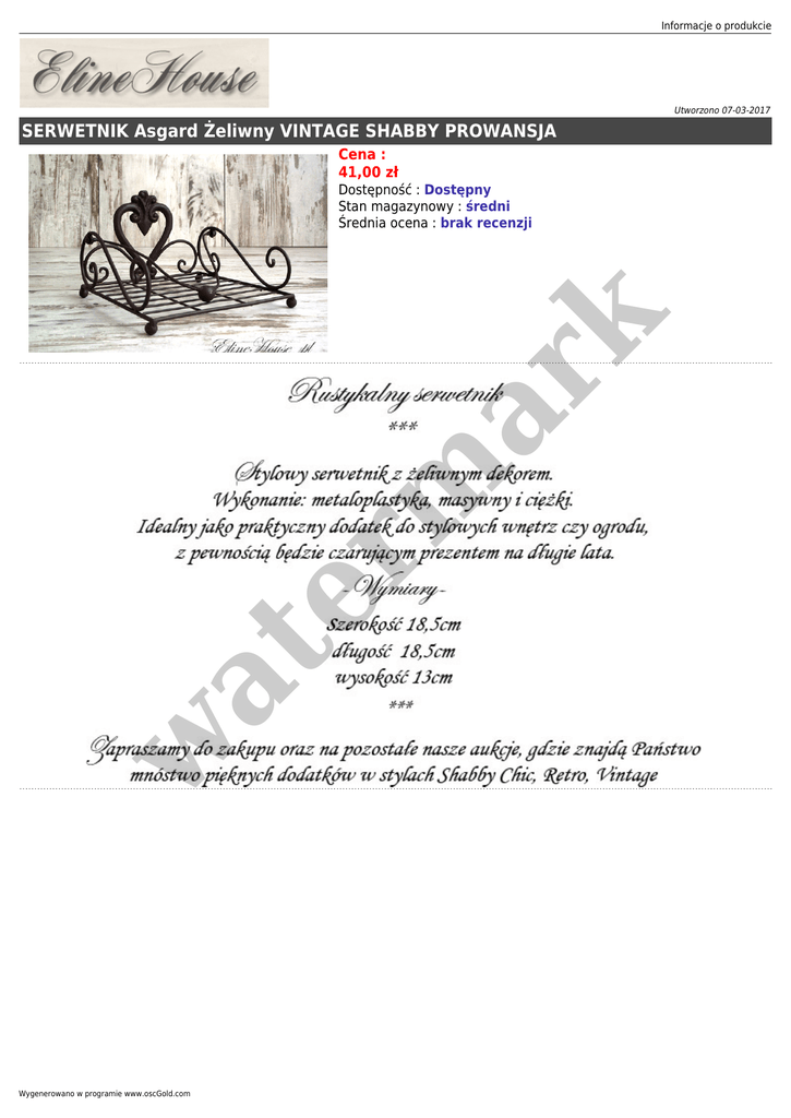 Informacje o produkcie Utworzono 07-03-2017 SERWETNIK Asgard Żeliwny VINTAGE SHABBY PROWANSJA Cena : 41,00 zł w at er m ar k Dostępność : Dostępny Stan magazynowy : średni Średnia ocena : brak recenzji Wygenerowano w programie www.oscGold.com