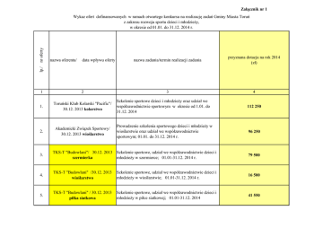 Załącznik nr 1 nazwa oferenta/ data wpływu oferty nazwa zadania/termin realizacji zadania przyznana dotacja na rok 2014 (zł) 3 4 lp./ nr oferty Wykaz ofert dofinansowanych w ramach otwartego konkursu na realizację zadań Gminy Miasta Toruń z zakresu rozwoju sportu dzieci i młodzieży, w okresie od 01.01. do 31.12. 2014 r. 1 2 1. Toruński Klub Kolarski "Pacific"/ 30.12. 2013 kolarstwo Szkolenie sportowe dzieci i młodzieży oraz udział we współzawodnictwie sportowym w okresie od 1.01. do 31.12. 2014 112 250 2. Akademicki Związek Sportowy/ 30.12. 2013 wioślarstwo Prowadzenie szkolenia sportowego dzieci i młodzieży w wioślarstwie oraz udział we współzawodnictwie sportowym; 01.01. do 31.12. 2014 r. 96 250 3. TKS-T "Budowlani"/ 30.12. 2013 szermierka Szkolenie sportowe, udział we współzawodnictwie dzieci i młodzieży w szermierce; 01.01-31.12. 2014 r. 79 500 4. TKS-T "Budowlani" /30.12. 2013 wioślarstwo Szkolenie sportowe, udział we współzawodnictwie dzieci i młodzieży w wioślarstwie; 01.01-31.12. 2014 r. 16 500 5. TKS-T "Budowlani" / 30.12. 2013 piłka siatkowa Szkolenie sportowe, udział we współzawodnictwie dzieci i młodzieży w piłce siatkowej; 01.01-31.12. 2014 41 550 Prowadzenie szkolenia dzieci i młodzieży w sekcji gimnastycznej oraz udział we współzawodnictwie sportowym; w okresie 01.01-31.12. 2014 r. 64 310 KS "Pomorzanin" /23.12. 2013 hokej na trawie Szkolenie sportowe dzieci i młodzieży sekcja hokej na trawie; w okresie 01.01-31.12. 2014 r; 70 350 8. KS "Pomorzanin" / 23.12. 2013 piłka nożna Szkolenie dzieci i młodzieży sekcja piłka nożna; 01.0131.12. 2014 r. 91 200 9. KS "Pomorzanin" / 23.12. 2013 piłka nożna kat. 17-23 l ata Szkolenie sportowe oraz udzial we współzawodnictwie sportowym - piłka nozna; 01.01-31.12. 2014 r. 20 000 10. KS "Start-Wisła" / 16.12. 2013 tenis ziemny Szkolenie sportowe dzieci i młodzieży oraz udział we współzawodnictwie sportowym; 01.01-31.12. 2014 21 100 11. KS "Laguna" / 30.12. 2013 pływanie w płetwach Popularyzacja kultury fizycznej wśród dzieci i młodzieży; 01.01.-31.12. 2014 30 180 12. MKLa Toruń / 30.12. 2013 lekkoatletyka Prowadzenie szkolenia sportowego dzieci i mlodzieży oraz udział we współzawodnictwie sportowym Mijeksiego Klubu Lekkoatletycznego Toruń"; 01.01-31.12. 2014 r. 90 800 13. TKS JUDO/ 30.12. 2013 judo Szkolenie dzieci i młodzieży oraz udział we współzawodnictwie sportowym w sekcji judo; 01.01.31.12. 2014 r. 48 760 6. TKG "Olimpijczyk" /30.12. 2013 skoki n a trampolinie 7. 14. KS-T "Energa-Manekin" /19.12.2013 tenis stołowy Rozwój sportu dzieci i mlodzieży uzdolnionej sportowo poprzez szkolenie sportowe, udział we współzawodnictwie sportowym, organizację i udizal w imprezach i wydarzeniach spoprtowych o charakterze lokalnym; 01.0131.12. 2014 r. 56 470 15. Toruńskie Stowarzyszenie Żużlowe/ Szkolenie sportowe dzieci i młodzieży, udział we 30.12. 2032 współzawodnictwie sportowym; 01.01-31.12. 2014 r. speedrowaery 10 520 16. Prowadzeniue szkolenia sportowego dzieci i mlodziezy Toruński Kub Żeglarski / 23.12 2013 oraz udzial we współzawodnictwie sportowym w r. żeglarstwo żeglarstwie regatowym; 01.01.-31.12. 2014 16 720 17. 18. 19. 20. Akademicki Klub Karate Tradycyjnego/ 18.12.2013 karate tradycyjne Szkolenie sportowe dzieci i młodzieży w 2014 r. ; 01.01.-31.12. 2014 Klub Karate Shotokan DOJO Toruń, Szkolenie sportowe dzieci i młodzieży oraz udział we 30.12. 2013 współzawpodnictwie sportowym; 01.01-31.12. 2014 karate shotokan ZANSHIN Toruński Klub Karate Shotokan/ 27.12. 2013 karate shotokan Szkolenie sportowe dzieci i młodzieży w dyscyplinie karate Shotokan oraz udział we współzawodnictwie sportowym Toruński Klub Karate Tradycyjnego Rozwój sportu dzieci i młodzieży w karate tradycyjnym; KUMADE / 30.12. 2013 01.01-31.12. 2014 r. karate tradycyjne 20 270 8 050 460 20 120 21. Tor. Klub Karate KYOKUSHIN/ 30.12. 2013 karate kyokushin Szkolenie sportowe dzieci i młodzieży w dyscyplinie karate kyokushin; 01.01-31.12. 2014 r. 18 860 22. Toruński Klub Karate-Do "RONIN" karate shotokan Szkolenie zawodników (organizacja i udział w stażach) oraz współzawodnictwo sportowe; 01.01.-31.12. 2014 9 660 23. Stowarzyszenie Sportów Walki "Ring Szkolenie sportowe dzieci i młodzieży w sekcji boksu Wolny" /30.12. 2013 01.01-31.12. 2014 r. boks 13 740 24. Toruński Klub Bowlingowy / 30.12. 2013 bowling Prowadzenie szkolenia sportowego dzieci i młodzieży oraz udział we współzawodnictwie sportowym - bowling; 01.01-31.12. 2014 3 680 25. Toruńska Akadamia Futsalu / 30.12. 2013 futsal Rozwój sportu dzieci i młodzieży w piłce halowej; 01.0131.12. 2014 23 000 26. Toruńska Akadamia Futsalu/ 30.12. 2013 pilka nożna Rozwój sportu dzieci i młodzieży w piłce nożnej na trawie w TAF; 01.01-31.12. 2014 4 800 27. Automobilklub Toruński / 30.12.2013 karting Młodziezowa sekcja kartingowa; 1 440 01.01-31.12.2014 28. Akademicki Zwi ązek Sportowy Organizacja Środowiskowa /30.12.2013 piłka siatkowa 29. Stowaryszenie Miłośników Sportów Szkolenie sportowe dzieci i młodzieży oraz udział we Motorowych "Stal" Toruń/ 30.12. współzawodnictwie sportowym; 01.01-31.12. 2014 2013 r. sporty motorowe 13 000 30. Toruński Ludowy Klub Jeździecki/ 30.12. 2013 jeździectwo 3 680 31. Klub Szachowy "64-Toruń"/ 30.12.2013 r. szachy 32. 33. 34. Szkolenie, rozwój dzieci i młodzieży oraz popularyzacja piłki siatkowej chłopców w Toruniu. Udział w rozgrywkach KPZPS i PZPS; 01.01-31.14. 2014; Rozwój sportu dzieci i młodzieży; 01.01-31.12. 2014 r. Szkolenie sportowe dzieci i młodzieży oraz udział we współzawodnictwie sportowym; 01.01-31.12. 2014 Toruński Klub Modelarski "Hercules" 30.12. 2013 Szkolenie w sekcji modelarskiej; 01.01-31.12. 2014 modelarstwo Klub Piłkarski "Start" Toruń / 30.12. 2013 piłka nożna Szkolenie sportowe dla dzieci i młodzieży oraz udział we współzawodnictwie sportowym. 01.01-31.12. 2014 r. Klub Sportowy ANGE