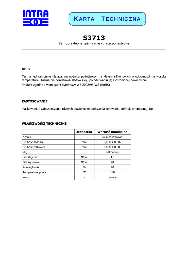 S3713 Samoprzylepna taśma maskująca poliestrowa OPIS Taśma jednostronnie klejąca, na nośniku poliestrowym z klejem silikonowym o odporności na wysoką temperaturę. Taśma nie pozostawia śladów kleju po oderwaniu jej z chronionej powierzchni. Produkt zgodny z wymogami dyrektywy WE 2002/95/WE (RoHS) ZASTOSOWANIE Maskowanie i zabezpieczanie różnych powierzchni podczas lakierowania, obróbki chemicznej, itp. WŁAŚCIWOŚCI TECHNICZNE Jednostka Wartość nominalna - folia poliestrowa Grubość nośnika mm 0,050 ± 0,002 Grubość całkowita mm 0.080 ± 0,003 - silikonowy Siła klejenia N/cm 4,5 Siła zrywania N/cm 78 Rozciągliwość % 70 Temperatura pracy °C 180 - zielony Nośnik Klej Kolor STANDARDOWE ROZMIARY • • • • • Długość rolki: 66m Szerokość rolki: 25, 50, 75, 100 (lub inne na zamówienie) Rdzeń: 76mm Oznakowanie: neutralne Pakowanie: luzem w kartonach ZASADY MAGAZYNOWANIA Rolki taśmy powinny być przechowywane w pozycji leżącej prostopadłej do krawędzi cięcia w oryginalnych opakowaniach. Rolki muszą być zabezpieczone przed kurzem, wilgocią, bezpośrednim nasłonecznieniem oraz oparami rozpuszczalników Temperatura składowania powinna wynosić pomiędzy +10ºC a +25ºC.. WARUNKI NAKŁADANIA TAŚMY Powierzchnia powinna być czysta, sucha oraz bez kurzu, tłuszczu, olejów, rozpuszczalników i innych zanieczyszczeń. Zalecane jest nakładanie w temperaturze pokojowej (+10ºC ... +40ºC) Z zachowaniem powyższych warunków taśma może być magazynowana 12 miesięcy. Powyższe dane techniczne opierają się na przeprowadzonych testach i doświadczeniach producenta, wg naszej opinii wiarygodnych i niezawodnych. Nie dają one jednak pełnej gwarancji i nie zwalniają użytkownika od przeprowadzenia prób i testów, właściwych dla konkretnego zastosowania. Uprzejmie informujemy, iż nie ponosimy odpowiedzialności za jakiekolwiek powstałe szkody czy straty, także w stosunku do osób trzecich. Dystrybutor: INTRA Sp. z o.o., ul. Wierzbowa 44, 90-133 Łódź, tel. +48 42 678 01 94, faks +48 42 678 10 09 e-mail: [email protected]