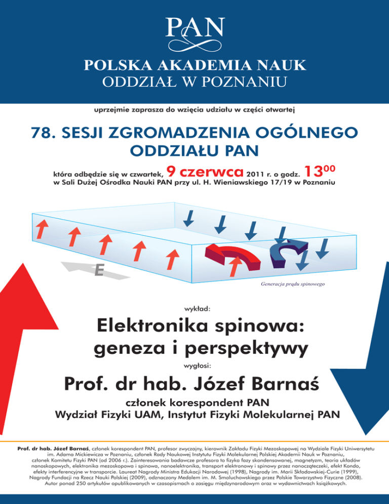 uprzejmie zaprasza do wzięcia udziału w części otwartej 78. SESJI ZGROMADZENIA OGÓLNEGO ODDZIAŁU PAN 00 która odbędzie się w czwartek, 9 czerwca 2011 r. o godz. 13 w Sali Dużej Ośrodka Nauki PAN przy ul. H. Wieniawskiego 17/19 w Poznaniu E Generacja prądu spinowego wykład: Elektronika spinowa: geneza i perspektywy wygłosi: Prof. dr hab. Józef Barnaś członek korespondent PAN Wydział Fizyki UAM, Instytut Fizyki Molekularnej PAN Prof. dr hab. Józef Barnaś, członek korespondent PAN, profesor zwyczajny, kierownik Zakładu Fizyki Mezoskopowej na Wydziale Fizyki Uniwersytetu im. Adama Mickiewicza w Poznaniu, członek Rady Naukowej Instytutu Fizyki Molekularnej Polskiej Akademii Nauk w Poznaniu, członek Komitetu Fizyki PAN (od 2006 r.). Zainteresowania badawcze profesora to fizyka fazy skondensowanej, magnetyzm, teoria układów nanoskopowych, elektronika mezoskopowa i spinowa, nanoelektronika, transport elektronowy i spinowy przez nanocząteczeki, efekt Kondo, efekty interferencyjne w transporcie. Laureat Nagrody Ministra Edukacji Narodowej (1998), Nagrody im. Marii Skłodowskiej-Curie (1999), Nagrody Fundacji na Rzecz Nauki Polskiej (2009), odznaczony Medalem im. M. Smoluchowskiego przez Polskie Towarzystwo Fizyczne (2008). Autor ponad 250 artykułów opublikowanych w czasopismach o zasięgu międzynarodowym oraz w wydawnictwach książkowych.