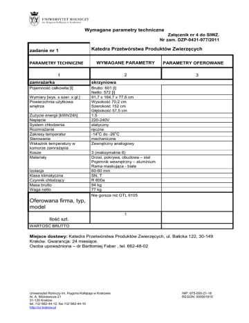 Wymagane parametry techniczne Załącznik nr 4 do SIWZ. Nr zam. DZP-0431-977/2011 zadanie nr 1 PARAMETRY TECHNICZNE Katedra Przetwórstwa Produktów Zwierzęcych WYMAGANE PARAMETRY 2 1 zamrażarka skrzyniowa Pojemność całkowita [l] Brutto: 601 [l] Netto: 572 [l] 91,7 x 164,7 x 77,6 cm Wysokość 70,2 cm Szerokość 152 cm Głębokość 57,5 cm 1.5 220-240V statyczny ręczne o o -14 C do -26 C mechaniczne Zewnętrzny analogowy Wymiary [wys. x szer. x gł.] Powierzchnia użytkowa wnętrza Zużycie energii [kWh/24h] Napięcie System chłodzenia Rozmrażanie Zakresy temperatur Sterowanie Wskaźnik temperatury w komorze zamrażąnia Kosze Materiały Izolacja Klasa klimatyczna Czynnik chłodzący Masa brutto Waga netto PARAMETRY OFEROWANE 3 3 (maksymalnie 6) Drzwi, pokrywa, obudowa – stal Pojemnik wewnętrzny – aluminium Rama maskująca - biała 60-60 mm SN, T R 600a 94 kg 77 kg Nie gorsza niż GTL 6105 Oferowana firma, typ, model 1 Ilość szt. WARTOŚĆ BRUTTO Miejsce dostawy: Katedra Przetwórstwa Produktów Zwierzęcych, ul. Balicka 122, 30-149 Kraków. Gwarancja: 24 miesiące. Osoba upoważniona – dr Bartłomiej Faber , tel. 662-48-02 Uniwersytet Rolniczy im. Hugona Kołłątaja w Krakowie Al. A. Mickiewicza 21 31-120 Kraków tel. /12/ 662-44-12, fax /12/ 662-44-10 http://ur.krakow.pl NIP: 675-000-21-18 REGON: 000001815 Katedra Fizjologii i Endokrynologii Zwierząt zadanie nr 2 PARAMETRY TECHNICZNE WYMAGANE PARAMETRY 2 1 Chłodziarko-zamrażarka Pojemność netto [l] Wymiary (wys.xszer.xgł.) [cm] Zużycie energii dobowe[kWh] Roczne zużycie energii Poziom hałasu [dB] Zdolność zamrażania [kg/24h] Zdolność utrzymania temperatury bez zasilania [h] Ilość półek Pojemniki na warzywa Pojemniki w zamrażarce System chłodzenia Sterowanie Wyświetlacz Kolor Powłoka antybakteryjna Technologie Cyrkulacja powietrza Klasa klimatyczna Klasa energetyczna wyposażenie Inne PARAMETRY OFERTOWE 3 Szafkowa, dwudrzwiowa, zamrażalnik na dole całkowita 287 (+/-1%) chłodziarki 221 (+/-1%) zamrażalnika 66 (+/-1%) 185 x 60 x 65 (+/-1%) 0,77 280 42 8 17 4 szklane 2 szt. 3 szt. Multi Airflow elektroniczne LED inox Anti bacteria Automatyczne odszranianie, Super mrożenie No frost Automatyczna, wymuszona SN-T A+ Kalendarz zamrażania żywności Pojemnik na kostki lodu Oświetlenie wnętrza obustronny montaż drzwi Z przodu nóżki o regulowanej wysokości, za tyłu rolki Nie gorsza niż Bosch KGN 36X43 Oferowana firma, typ, model 1 Ilość – szt. WARTOŚĆ BRUTTO Miejsce dostawy: Katedra Fizjologii i Endokrynologii Zwierząt, al. Mickiewicza 24/28, 30059 Kraków. Gwarancja: 24 miesiące. Osoba upoważniona – mgr inż. Maria Kwaśniewska , tel. 662-41-07 Uniwersytet Rolniczy im. Hugona Kołłątaja w Krakowie Al. A. Mickiewicza 21 31-120 Kraków tel. /12/ 662-44-12, fax /12/ 662-44-10 http://ur.krakow.pl NIP: 675-000-21-18 REGON: 000001815 zadanie nr 3 Katedra Fizjologii i Endokrynologii Zwierząt PARAMETRY TECHNICZNE WYMAGANE PARAMETRY 1 2 Chłodziarko-zamrażarka Pojemność netto [l] Wymiary (wys.xszer.xgł.) [cm] Zużycie energii dobowe [kWh] Roczne zużycie energii Poziom hałasu [dB] Zdolność zamrażania [kg/24h] Zdolność utrzymania temperatury bez zasilania [h] Ilość półek Półki na butelki Balkoniki w chłodziarce Pojemniki na warzywa Pojemniki w zamrażarce Sterowanie Kolor Technologie Klasa klimatyczna Klasa energetyczna Ilość agregatów Inne Oferowana firma, typ, model PARAMETRY OFEROWANE 3 Szafkowa, dwudrzwiowa, zamrażalnik na dole całkowita 323 (+/-1%) chłodziarki 245 (+/-1%) zamrażalnika 78 (+/-1%) 185 x 60 x 63,2 (+/-1%) 0,82 299 42 4 18 3 szklane 1 szt. 3 szt. 2 szt. 3 szt. mechaniczne biały No Frost, Fresh Frost Free, Fresh Zone Sn-N-ST-T A+ 1 Automatyczne rozmrażanie obustronny montaż drzwi Nie gorsza niż ELECTROLUX ENB34633 W 1 Ilość – szt. WARTOŚĆ BRUTTO Miejsce dostawy: Katedra Fizjologii i Endokrynologii Zwierząt, al.Mickiewicza 24/28,30-059 Kraków Gwarancja: 24 miesiące. Osoba upoważniona – mgr inż. Maria Kwaśniewska , tel. 662-41-07 Uniwersytet Rolniczy im. Hugona Kołłątaja w Krakowie Al. A. Mickiewicza 21 31-120 Kraków tel. /12/ 662-44-12, fax /12/ 662-44-10 http://ur.krakow.pl NIP: 675-000-21-18 REGON: 000001815 zadanie nr 4 Katedra Sadownictwa i Pszczelnictwa WYMAGANE PARAMETRY PARAMETRY TECHNICZNE PARAMETRY OFEROWANE 2 1 Chłodziarko-zamrażarka Pojemność netto [l] Wymiary (wys.xszer.xgł.) [cm] Zużycie energii [kWh] Roczne zużycie energii Zdolność zamrażania [kg/24h] Ilość półek Stelaż na butelki Pojemniki na warzywa Pojemniki w zamrażarce Sterowanie Kolor Powłoka antybakteryjna Technologie Cyrkulacja powietrza Zdolność utrzymania temperatury bez zasilania Funkcje Klasa energetyczna Inne 3 Szafkowa, dwudrzwiowa, zamrażalnik na dole chłodziarki 190 zamrażalnika 68 155 x 60 x 65 0,85 310 3 4 szklane wymagany 2 szuflady elektroniczne biały Anti bacteria Etagenfrost wymagana 24 h Automatyczne odszranianie chłodziarki Szybkie zamrażanie Szybkie schładzanie A 1 kompresor Obustronny montaż drzwi Nie gorsza niż Bosch KGN 26X03 Oferowana firma, typ, model 1 Ilość – szt. WARTOŚĆ BRUTTO Miejsce dostawy: Katedra Sadownictwa i Pszczelnictwa, al. 29 listopada 54,31-425 Kraków. Gwarancja: 24 miesiące. Osoba upoważniona – Prof. Marek Grabowski , tel. 662-52-26 Uniwersytet Rolniczy im. Hugona Kołłątaja w Krakowie Al. A. Mickiewicza 21 31-120 Kraków tel. /12/ 662-44-12, fax /12/ 662-44-10 http://ur.krakow.pl NIP: 675-000-21-18 REGON: 000001815 zadanie nr 5 Katedra Genetyki, Hodowli i Nasiennictwa WYMAGANE PARAMETRY PARAMETRY TECHNICZNE PARAMETRY OFEROWANE 2 1 3 Wytwornica lodu Wydajność / 24 h Pojemność zbiornika lodu Temperatura lodu Obieg wody Parownik Wymiary lodu Wymiary zewnętrzne (szer. x dł. x wys.) Czynnik chłodzący Obudowa Technika produkcji lodu Zasilanie Zużycie mocy Waga Poziom hałasu min. 110 kg lodu min. 35 kg o - 0,5 C zamknięty zamontowany na stałe Lód drobny typu MicroIce - 