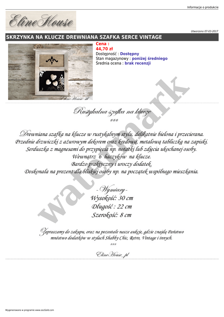 Informacje o produkcie Utworzono 07-03-2017 SKRZYNKA NA KLUCZE DREWNIANA SZAFKA SERCE VINTAGE Cena : 44,70 zł w at er m ar k Dostępność : Dostępny Stan magazynowy : poniżej średniego Średnia ocena : brak recenzji Wygenerowano w programie www.oscGold.com