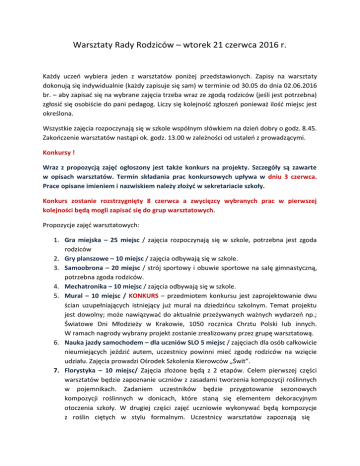 Warsztaty Rady Rodziców – wtorek 21 czerwca 2016 r. Każdy uczeń wybiera jeden z warsztatów poniżej przedstawionych. Zapisy na warsztaty dokonują się indywidualnie (każdy zapisuje się sam) w terminie od 30.05 do dnia 02.06.2016 br. – aby zapisać się na wybrane zajęcia trzeba wraz ze zgodą rodziców (jeśli jest potrzebna) zgłosić się osobiście do pani pedagog. Liczy się kolejność zgłoszeń ponieważ ilość miejsc jest określona. Wszystkie zajęcia rozpoczynają się w szkole wspólnym słówkiem na dzień dobry o godz. 8.45. Zakończenie warsztatów nastąpi ok. godz. 13.00 w zależności od ustaleń z prowadzącymi. Konkursy ! Wraz z propozycją zajęć ogłoszony jest także konkurs na projekty. Szczegóły są zawarte w opisach warsztatów. Termin składania prac konkursowych upływa w dniu 3 czerwca. Prace opisane imieniem i nazwiskiem należy złożyć w sekretariacie szkoły. Konkurs zostanie rozstrzygnięty 8 czerwca a zwycięzcy wybranych prac w pierwszej kolejności będą mogli zapisać się do grup warsztatowych. Propozycje zajęć warsztatowych: 1. Gra miejska – 25 miejsc / zajęcia rozpoczynają się w szkole, potrzebna jest zgoda rodziców 2. Gry planszowe – 10 miejsc / zajęcia odbywają się w szkole. 3. Samoobrona – 20 miejsc / strój sportowy i obuwie sportowe na salę gimnastyczną, potrzebna zgoda rodziców. 4. Mechatronika – 10 miejsc / zajęcia odbywają się w szkole. 5. Mural – 10 miejsc / KONKURS – przedmiotem konkursu jest zaprojektowanie dwu ścian uzupełniających istniejący już mural na dziedzińcu szkolnym. Temat projektu jest dowolny; może nawiązywać do aktualnie przeżywanych ważnych wydarzeń np.; Światowe Dni Młodzieży w Krakowie, 1050 rocznica Chrztu Polski lub innych. W ramach nagrody wybrany projekt zostanie zrealizowany przez grupę warsztatową. 6. Nauka jazdy samochodem – dla uczniów SLO 5 miejsc / zajęciach dla osób całkowicie nieumiejących jeździć autem, uczestnicy powinni mieć zgodę rodziców na wzięcie udziału. Zajęcia prowadzi Ośrodek Szkolenia Kierowców „Świt”. 7. Florystyka – 10 miejsc/ Zajęcia złożone będą z 2 etapów. Celem pierwszej części warsztatów będzie zapoznanie uczniów z zasadami tworzenia kompozycji roślinnych w pojemnikach. Zadaniem uczestników będzie przygotowanie sezonowych kompozycji roślinnych w donicach, które staną się elementem dekoracyjnym otoczenia szkoły. W drugiej części zajęć uczniowie wykonywać będą kompozycje z roślin ciętych w stylu formalnym. Uczestnicy warsztatów zapoznają się z materiałami, narzędziami oraz naczyniami do wykonywania kompozycji z roślin ozdobnych. Ponadto nauczą się stosować zasady kompozycji i kolorystyki w wykonywaniu dekoracji roślinnych. Warsztaty skierowane są do wszystkich, którzy chcieliby rozwijać swoje zainteresowania w tworzeniu kompozycji roślinnych. 8. Taniec towarzyski – 20 miejsc / zajęcia taneczne dla wszystkich chętnych, obowiązuje konieczność zmiennego obuwia. 9. Teatr – 15 miejsc / zajęcia poprowadzi p. Monika Kazimierczyk, która jest animatorem kultury i instruktorem teatralnym, reżyserem i teatroterapeutą. Założyła grupę teatralną „Zmysł” i grupę teatralną „Przebudzeni”. Ważnym elementem jej pracy są autorskie spektakle, happeningi, warsztaty z zakresu dramy, autoprezentacji, zadań aktorskich i reżyserskich. Zajęcia odbywają się w szkole. Potrzebny będzie strój właściwy do wykonywania ćwiczeń. 10. Żagle – 10 miejsc /niezbędny jest strój uwzględniający warunki atmosferyczne, potrzebna jest zgoda rodziców. 11. Rzeźba – 10 miejsc / zajęcia z rzeźbiarzem ludowym, rzeźba w drewnie - w trakcie zajęć będzie możliwość wykonania płaskorzeźby lub płaskorzeźby przestrzennej według wcześniej przygotowanego własnego projektu (projekt ma być prosty np. kwiatka, liścia, łabędzia). Zajęcia odbywają się w szkole, potrzebna zgoda rodziców. 12. Glina i garncarstwo – 10 miejsc / zajęcia poprowadzi „Kaflarnia Warmińskia”. 13. Mozaika – 10 miejsc / zajęcia poprowadzi „Kaflarnia Warmińskia”. KONKURS – temat przewodni powinien uwzględniać logo salezjańskie i sylwetkę św. Dominika Savio. Projekt może także uwzględniać napis Salezjańskie Gimnazjum i Liceum Ogólnokształcące. Wybrany projekt będzie stanowił podstawę do wykonania mozaiki na ścianie zewnętrznej szkoły od strony głównego wejścia (prawa strona od okien „Okęcia”). Wymiary mozaiki: 1 m x 2 m – orientacja pionowa. Projekt może zakładać także technikę 3d. 14. Warsztaty filmowe – 10 miejsc / zajęcia pokazujące proces tworzenia filmu od „a do z” (scenariusz, filmowanie, montaż) rozwijające umiejętności aktorskie, interpersonalne, wzmacniające poczucie własnej wartości. Uczestnicy mogą posiadać swój własny sprzęt do utrwalania rzeczywistości (kamera, telefon komórkowy). Celem warsztatu i zamierzeniem jest nakręcenie filmu. 15. Wytwórnia słodyczy – 10 miejsc / zajęcia odbywają się w szkole, wytwarzanie pralinek, czekoladek i „słodkości” domowymi sposobami.