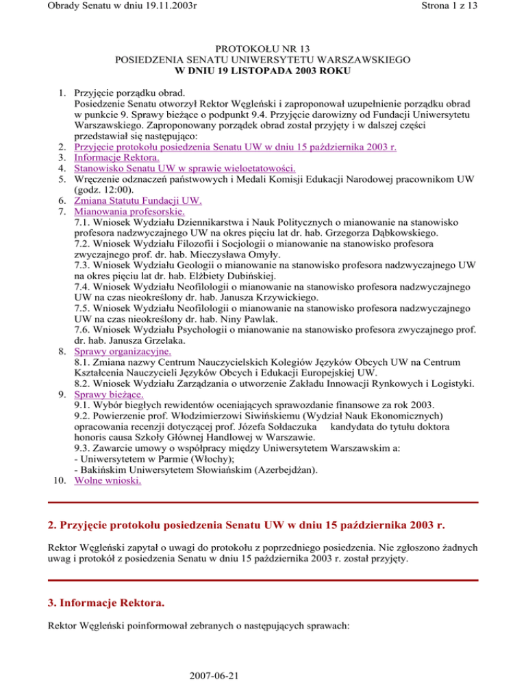 Obrady Senatu w dniu 19.11.2003r Strona 1 z 13 PROTOKOŁU NR 13 POSIEDZENIA SENATU UNIWERSYTETU WARSZAWSKIEGO W DNIU 19 LISTOPADA 2003 ROKU 1. Przyjęcie porządku obrad. Posiedzenie Senatu otworzył Rektor Węgleński i zaproponował uzupełnienie porządku obrad w punkcie 9. Sprawy bieżące o podpunkt 9.4. Przyjęcie darowizny od Fundacji Uniwersytetu Warszawskiego. Zaproponowany porządek obrad został przyjęty i w dalszej części przedstawiał się następująco: 2. Przyjęcie protokołu posiedzenia Senatu UW w dniu 15 października 2003 r. 3. Informacje Rektora. 4. Stanowisko Senatu UW w sprawie wieloetatowości. 5. Wręczenie odznaczeń państwowych i Medali Komisji Edukacji Narodowej pracownikom UW (godz. 12:00). 6. Zmiana Statutu Fundacji UW. 7. Mianowania profesorskie. 7.1. Wniosek Wydziału Dziennikarstwa i Nauk Politycznych o mianowanie na stanowisko profesora nadzwyczajnego UW na okres pięciu lat dr. hab. Grzegorza Dąbkowskiego. 7.2. Wniosek Wydziału Filozofii i Socjologii o mianowanie na stanowisko profesora zwyczajnego prof. dr. hab. Mieczysława Omyły. 7.3. Wniosek Wydziału Geologii o mianowanie na stanowisko profesora nadzwyczajnego UW na okres pięciu lat dr. hab. Elżbiety Dubińskiej. 7.4. Wniosek Wydziału Neofilologii o mianowanie na stanowisko profesora nadzwyczajnego UW na czas nieokreślony dr. hab. Janusza Krzywickiego. 7.5. Wniosek Wydziału Neofilologii o mianowanie na stanowisko profesora nadzwyczajnego UW na czas nieokreślony dr. hab. Niny Pawlak. 7.6. Wniosek Wydziału Psychologii o mianowanie na stanowisko profesora zwyczajnego prof. dr. hab. Janusza Grzelaka. 8. Sprawy organizacyjne. 8.1. Zmiana nazwy Centrum Nauczycielskich Kolegiów Języków Obcych UW na Centrum Kształcenia Nauczycieli Języków Obcych i Edukacji Europejskiej UW. 8.2. Wniosek Wydziału Zarządzania o utworzenie Zakładu Innowacji Rynkowych i Logistyki. 9. Sprawy bieżące. 9.1. Wybór biegłych rewidentów oceniających sprawozdanie finansowe za rok 2003. 9.2. Powierzenie prof. Włodzimierzowi Siwińskiemu (Wydział Nauk Ekonomicznych) opracowania recenzji dotyczącej prof. Józefa Sołdaczuka kandydata do tytułu doktora honoris causa Szkoły Głównej Handlowej w Warszawie. 9.3. Zawarcie umowy o współpracy między Uniwersytetem Warszawskim a: - Uniwersytetem w Parmie (Włochy); - Bakińskim Uniwersytetem Słowiańskim (Azerbejdżan). 10. Wolne wnioski. 2. Przyjęcie protokołu posiedzenia Senatu UW w dniu 15 października 2003 r. Rektor Węgleński zapytał o uwagi do protokołu z poprzedniego posiedzenia. Nie zgłoszono żadnych uwag i protokół z posiedzenia Senatu w dniu 15 października 2003 r. został przyjęty. 3. Informacje Rektora. Rektor Węgleński poinformował zebranych o następujących sprawach: 2007-06-21 Obrady Senatu w dniu 19.11.2003r Strona 2 z 13 - Usprawiedliwienie nieobecności nadesłała dr Barbara Jacennik - Wydział Psychologii. - W przerwie obrad Salę Senatu opuści Dziekan Wydziału Geografii i Studiów Regionalnych, prof. dr hab. Andrzej Richling. W zastępstwie Prodziekan - dr hab. Maciej Jędrusik. - Do dyskusji nad pkt 6. Zmiana Statutu Fundacji UW został zaproszony prof. dr hab. Hubert Izdebski - Przewodniczący Zarządu Fundacji UW. - Prezydent Rzeczypospolitej Polskiej postanowieniem z dnia 21 października 2003 r. nadał tytuł naukowy profesora nauk humanistycznych dr. hab. Andrzejowi Krzysztofowi Nowakowi (Wydział Psychologii). - 14 listopada 2003 r. odbyła się uroczystość nadania tytułu doktora honoris causa Uniwersytetu Wrocławskiego prof. dr. hab. Janowi Baszkiewiczowi (Wydział Dziennikarstwa i Nauk Politycznych). - Nagrody Fundacji na Rzecz Nauki Polskiej za wybitne osiągnięcia i odkrycia naukowe otrzymali: z z w dziedzinie nauk humanistycznych i społecznych - prof. Jerzy Szacki - za dzieło "Historia myśli socjologicznej", w dziedzinie nauk ścisłych - dr Marek Pfützner - za doświadczalne potwierdzenie istnienia nowego rodzaju promieniotwórczości - rozpadu dwuprotonowego. - Nagrody Prezesa Rady Ministrów za rozprawy doktorskie i habilitacyjne za rok 2002 otrzymali: z z z z z dr hab. Wiktor Koźmiński (Wydział Chemii), dr hab. Rafał Latała (Wydział Matematyki, Informatyki i Mechaniki), dr hab. Wojciech Plandowski (Wydział Matematyki, Informatyki i Mechaniki), dr Piotr Bębas (Wydział Biologii), dr Monika Wilde-Piórko (Wydział Fizyki). - Studenci Wydziału Matematyki, Informatyki i Mechaniki zajęli I miejsce w Mistrzostwach Europy Środkowej w Programowaniu Zespołowym i po raz dziesiąty zakwalifikowali się do światowych finałów w tych zawodach. - Prorektor Tygielski poinformował o tym, że w listopadzie 2003 r. odbyła się Międzynarodowa Konferencja Uniwersytetów Stołecznych UNICA w Oslo, na której postanowiono, że każdy Uniwersytet należący do sieci UNICA do końca roku 2003 ma przedstawić te kierunki studiów, które są atrakcyjne i na których podstawie można stworzyć z zagranicznymi partnerami wspólne studia oraz te kierunki, które są słabe i którym inne Uniwersytety mogłyby pomóc w stworzeniu atrakcyjnych programów dydaktycznych. Prorektor Tygielski dodał ponadto, że także Uniwersytet Warszawski stoi przed problemem stworzenia programów studiów w języku angielskim lub jeszcze innych językach europejskich. Współpracą z UW byłyby zainteresowane trzy uczelnie: na Cyprze w Nikozji, Uniwersytet w Lozannie i Uniwersytet Humboldta. - 12 października odbyła się w Kościele Akademickim Św. Anny w Warszawie Centralna Inauguracja Roku Akademickiego 2003/2004 oraz koncert z okazji "Dnia Papieskiego 2003", a także "Apel Warszawy z Papieżem". - 16-20 października Rektor Węgleński uczestniczył w obchodach 25-lecia podpisania umowy o współpracy między UW a Uniwersytetem w Bonn. - 21 października - wykład A. Wajdy pt. "Lekcja polskiego kina" z cyklu "8 Wykładów na Nowe Tysiąclecie". - 23 października - wizyta Ministra Edukacji Nowej Zelandii; finał konkurs