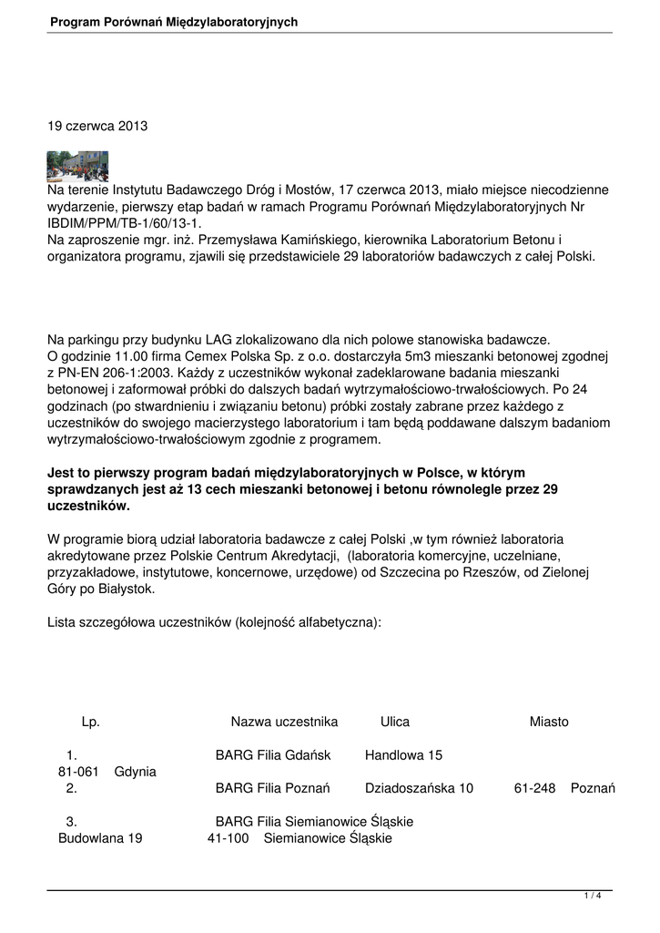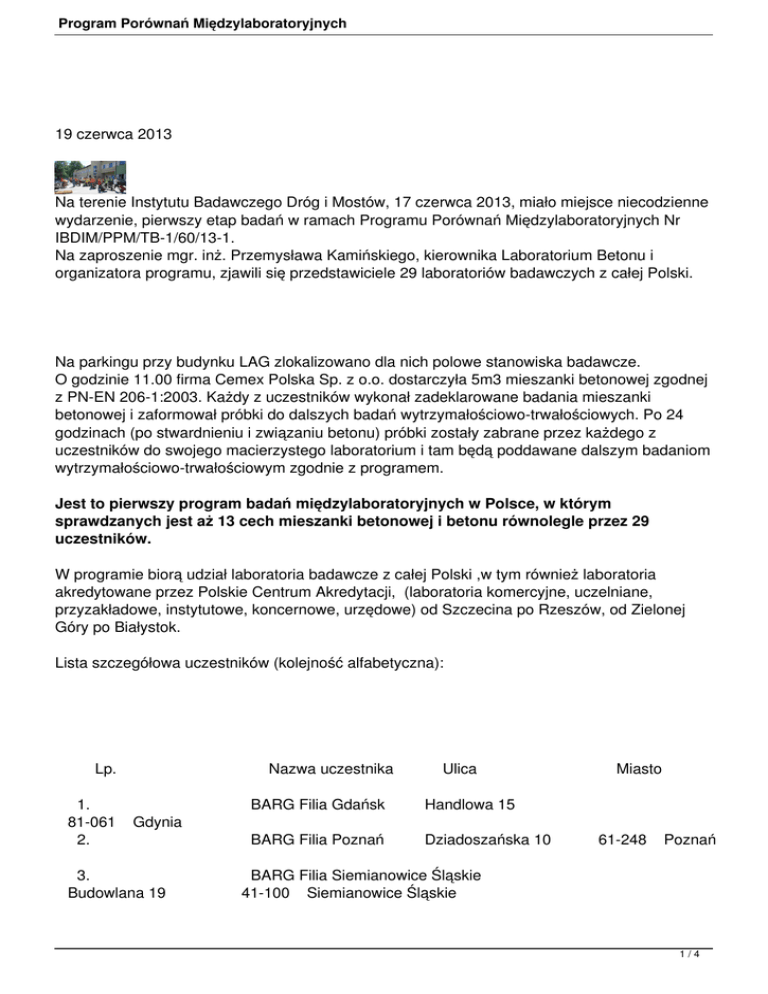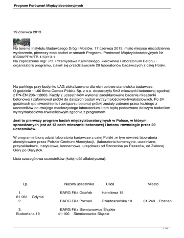 Program Porównań Międzylaboratoryjnych 19 czerwca 2013 Na terenie Instytutu Badawczego Dróg i Mostów, 17 czerwca 2013, miało miejsce niecodzienne wydarzenie, pierwszy etap badań w ramach Programu Porównań Międzylaboratoryjnych Nr IBDIM/PPM/TB-1/60/13-1. Na zaproszenie mgr. inż. Przemysława Kamińskiego, kierownika Laboratorium Betonu i organizatora programu, zjawili się przedstawiciele 29 laboratoriów badawczych z całej Polski. Na parkingu przy budynku LAG zlokalizowano dla nich polowe stanowiska badawcze. O godzinie 11.00 firma Cemex Polska Sp. z o.o. dostarczyła 5m3 mieszanki betonowej zgodnej z PN-EN 206-1:2003. Każdy z uczestników wykonał zadeklarowane badania mieszanki betonowej i zaformował próbki do dalszych badań wytrzymałościowo-trwałościowych. Po 24 godzinach (po stwardnieniu i związaniu betonu) próbki zostały zabrane przez każdego z uczestników do swojego macierzystego laboratorium i tam będą poddawane dalszym badaniom wytrzymałościowo-trwałościowym zgodnie z programem. Jest to pierwszy program badań międzylaboratoryjnych w Polsce, w którym sprawdzanych jest aż 13 cech mieszanki betonowej i betonu równolegle przez 29 uczestników. W programie biorą udział laboratoria badawcze z całej Polski ,w tym również laboratoria akredytowane przez Polskie Centrum Akredytacji, (laboratoria komercyjne, uczelniane, przyzakładowe, instytutowe, koncernowe, urzędowe) od Szczecina po Rzeszów, od Zielonej Góry po Białystok. Lista szczegółowa uczestników (kolejność alfabetyczna): Lp. 1. 81-061 Gdynia 2. 3. Budowlana 19 Nazwa uczestnika Ulica BARG Filia Gdańsk Handlowa 15 BARG Filia Poznań Dziadoszańska 10 Miasto 61-248 Poznań BARG Filia Siemianowice Śląskie 41-100 Siemianowice Śląskie 1/4 Program Porównań Międzylaboratoryjnych 4. 5. 32-400 Myślenice 6. Chmielewskiego 13 70-028 Szczecin 7. BARG Filia Warszawa Delfina 4b 03-196 Warszawa BASF Polska Sp. z o.o. Kazimierza Wlk. 58 Betotest Polska Sp. z o.o. Budimex S.A. Przejazdowa 24 05-800 Pruszków 8. BUDOKRUSZ Sp. z o.o. Osowiecka 47 Odrano Wola Grodzisk Mazowiecki 9. CEMEX Polska Sp. z o.o. al. Jerozolimskie 212A 02-486 Warszawa 10. Centrum Technologiczne Wiśniowa Chryso 40B/14 02-520 Warszawa 11. Przemysłowa 23 35-105 Rzeszów 12. Paderewskiego 43/45 25-950 Kielce 13. Zambrowska 2 16-001 Kleosin 14. CTB przy Politechnice Rzeszowskiej GDDKiA O. Bydgoszcz Nowotoruńska 31 85-839 Bydgoszcz 15. 32-020 Wieliczka 16. 91-857 Łódź 17. Sokola 4b 18. Rejtana 8a 19. Wiosenna 8 72-002 Szczecin 20. Środkowa 35C 21. 66-004 Racula 22. GDDKiA O. Kraków Krakowska 37 B GDDKiA O. Łódź Irysowa 2 23. 03-054 Warszawa 24. GDDKiA Kielce GDDKiA O. Białystok GDDKiA O. Olsztyn 11-041 Olsztyn GDDKiA O. Rzeszów 35-310 Rzeszów GDDKiA O. Szczecin GDDKiA O. Warszawa 05-816 Opacz Kolonia GDDKiA Zielona Góra Wierzbowa 6 Hydrobudowa 1 - Laboratorium Chlubna Główne 7 03-054 Warszawa Hydrobudowa 1 - Laboratorium Chlubna Mobilne 7 IBDiM Warszawa 2/4 Program Porównań Międzylaboratoryjnych Instytutowa 1 03-302 Warszawa 25. 40-397 Katowice 26. 27. 90-924 Łódź 28. Przemysłowa 3 29. Parzniewska 8 05-800 Pruszków LABOTEST Lwowska 38 PBL Mazowieckie Mosty Przemysłowa 13 Politechnika Łódzka 05-300 Mińsk Mazowie Aleja Politechniki 6 TPA Byków 55-095 Byków / Mirków TPA Pruszków W ramach programu zostaną sprawdzone następujące cechy mieszanki betonowej i betonu: a) Mieszanka betonowa (pobranie próbki do badań wg PN-EN 12350-1:2011: • Konsystencja metodą opadu stożka wg PN-EN 12350-2:2011, • Zawartość powietrza w zagęszczonej mieszance betonowej metodą ciśnieniomierza wg PN-EN 12350-7:2011; b) Beton stwardniały po 28 dniach pielęgnacji wg PN-EN 12390-2:2011 lub PN-88/B-06250 (odpowiednio dla danej metody badawczej) • Wytrzymałość na ściskanie wg PN-EN 12390-3:2011, • Wytrzymałość na ściskanie wg PN-88/B-06250, • Nasiąkliwość wg PN-88/B-06250, • Mrozoodporność dla stopnia F150 wg PN-88/B-06250, • Wodoszczelność (przepuszczalność wody) dla stopnia W8 wg PN-88/B-06250, • Wytrzymałość na rozciąganie przy zginaniu wg PN-EN 12390-5:2011 (schemat 3 punktowy), • Wytrzymałość na rozciąganie przy zginaniu wg PN-EN 12390-5:2011 (schemat 4 punktowy), • Wytrzymałość na rozciąganie przy rozłupywaniu wg PN-EN 12390-6:2011, • Gęstość betonu wg PN-EN 12390-7:2011, • Głębokość penetracji wody po 72 h pod ciśnieniem 0,5 MPa wg PN-EN 12390-8:2011, • Odporność na zamrażanie/rozmrażanie w 3% NaCl wg pr EN 12390-9. Badania mają charakter porównań międzylaboratoryjnych. Ich celem jest: • sprawdzenie kompetencji technicznych personelu i systemu zarządzania laboratorium pod kątem: 3/4 Program Porównań Międzylaboratoryjnych - potwierdzenia zgodności wykonywanych badań z odpowiednim dokumentem odniesienia, - sprawdzenia WPiB pod kątem jego precyzji i dokładności do odpowiednich badań, - uzyskania informacji o powtarzalności i odtwarzalności poszczególnych metod badawczych, • uzyskanie informacji o konieczności wprowadzenia działań korygujących lub zapobiegawczych, • informacja umożliwiająca podjęcie decyzji co do dalszego doskonalenia personelu technicznego w zakresie badań mieszanki betonowej i betonu, • walka z rutyną i złymi nawykami personelu wykonującego badania. Program Porównań Międzylaboratoryjnych Nr IBDIM/PPM/TB-1/60/13-1 jest zgodny z następującymi dokumentami odniesienia: • PN-EN ISO/IEC 17025:2005 Ogólne wymagania dotyczące kompetencji laboratoriów badawczych i wzorcujących. • PN-EN ISO/IEC 17043:2011 Ocena zgodności - Ogólne wymagania dotyczące badania biegłości. • DA - 05 Polityka dotycząca uczestnictwa w badaniach biegłości. Organizator zobowiązuje się do zachowania poufności wyników badań poszczególnych uczestników, bezstronności w ocenie działań uczestników i wyników ich badań. Każdy uczestnik badań jest zobowiązany do zachowania poufności uzyskanych