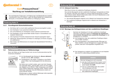 D Änderung Seite 46 5.11.3 Anbauort beim Bus ContiPressureCheck TM Beim Bus ist immer ein zusätzlicher Empfänger erforderlich. Nachtrag zur Installationsanleitung Das zentrale Steuergerät und den zusätzlichen Empfänger vorzugsweise am Chassis verbauen. Falls dies nicht möglich ist, können beide Komponenten im Kofferraum verbaut werden. Beide Komponenten dürfen nicht durch Metallwände zu den Reifensensoren abgeschirmt werden. Die nachfolgenden Änderungen und Ergänzungen sind Bestandteil der Installationsanleitung für das CPC-System. Legen Sie dieses Beiblatt der Installationsanleitung bei, um die aktuellen Informationen zur Verfügung zu haben. ■■ Das zentrale Steuergerät möglichst nah im Bereich der Vorderachse anbringen. ■■ Den zusätzliche Empfänger möglichst dicht im Bereich der Hinterachse/-n anbringen. Änderung Seite 31 5.4.1 Grundlegende Sicherheitshinweise: ■■ Die Lichtverhältnisse am Arbeitsplatz müssen jederzeit ausreichend sein. ■■ Der Arbeitsplatz und die verwendeten Geräte müssen in einwandfreiem und sauberen Zustand sein. ■■ Alle eingesetzen Produkte entsprechend den Verpackungsangaben lagern. ■■ Werkzeuge, Reinigungsmittel und Kleber für Unbefugte und Kinder unzugänglich aufbewahren. ■■ Beim Einbau des Reifensensors ist zwingend der Spezialklebstoff CB 2250 zu verwenden. Änderung Seite 41 Reifensensoraktivierung vor Reifenmontage Bevor der Reifen auf der Felge montiert wird, ist eine Funktionskontrolle des Reifensensors erforderlich. Am Handlesegerät den Menüpunkt „Sensor aktivieren“ aufrufen und mit „OK“ bestätigen. Handlesegerät in den Reifen unmittelbar an den Reifensensor führen. Das Handlesegerät führt die Aktivierung durch. Der Reifen kann montiert werden, wenn nach dem Vorgang der angezeigte Status „aktiviert (MP)“ lautet und wenn neben den Abgaben zu ID, DRUCK, TEMP (Temperatur) und STATUS keine weiteren Meldungen angezeigt werden. Werden weitere Meldungen angezeigt, muss der Reifensensor ersetzt und erneut aktiviert werden. Erläuterungen zu diesen weiteren Meldungen siehe separates Handbuch für das Handlesegerät. 5.12.2 Montage des Schlagschutzes auf den zusätzlichen Empfänger Nachdem der Kabelbaum D mit dem zusätzlichen Empfänger verbunden wurde (siehe Kapitel 5.13 Montage des Kabelbaums vom zentralen Steuergerät zum zusätzlichen Empfänger) ist der Schlagschutz zu montieren. Der Schlagschutz über den zusätzlichen Empfänger stülpen und im Halter verankern. Die 4 Schnapphaken in die entsprechenden Öffnungen am Halter einführen und den Schlagschutz so gegen den Halter pressen, dass alle 4 Schnapphaken eingerastet sind. Den Schlagschutz zusätzlich wie abgebildet mit zwei Kabelbindern (nicht im Lieferumfang enthalten) sichern. HINWEIS www.contipressurecheck.com 5.6 ADD_IA_CPC_0113_A1_D ■■ Der Arbeitsplatz muss ausreichend belüftet sein. Änderung Seite 48 17526480000 ■■ Der Einbau darf nur durch dafür qualifiziertes Personal durchgeführt werden. Wird der Schlagschutz nicht verwendet, ►►darf das ContiPressureCheck-System nicht für Gefahrguttransporte verwendet werden (siehe Kapitel 14.3 ADR). ►►kann es zu Beschädigungen des zusätzlichen Empfängers kommen. ►►vermindert sich die Empfangsreichweite des zusätzlichen Empfängers. Änderung Seite 53 Änderung Seite 64 Den Kabelbaum A vom Sicherungskasten beginnend zu Kabel B und C verlegen. Die integrierte Sicherung verbleibt im Kabelbaum. Den Zweig F vom zentralen Steuergerät am vorhandenen Kabelbaum zum Verteilerkasten bzw. zur Fahrzeug-Spannungsversorgung verlegen und mit Kabelbindern lose sichern. Eine geeignete Kabeldurchführung im Verteilerkasten suchen und das Kabel durchführen. Achtung Den Zweig F auf erforderliche Länge kürzen, falls notwendig. Kurzschlussgefahr! Durch eine fehlende Absicherung besteht Kurzschlussgefahr. HINWEIS ►►Die Versorgungsleitung A nicht an der Sicherungsseite kürzen. ►►Das Wellrohr am Kabelbaum wie nebenstehend abgebildet immer im „Berg“-Bereich und nicht im „Tal“-Bereich kürzen. Ansonsten besteht die Gefahr, dass die innen geführten Kabel sich an der „Tal“Kante im Betrieb durchscheuern. Die Kabelbäume B und C auf erforderliche Länge kürzen, falls notwendig. HINWEIS ►►Das Wellrohr am Kabelbaum wie nebenstehend abgebildet immer im „Berg“-Bereich und nicht im „Tal“-Bereich kürzen. Ansonsten besteht die Gefahr, dass die innen geführten Kabel sich an der „Tal“Kante im Betrieb durchscheuern. Zuerst die beiden CAN Anschlüsse (braun/weiß) des Kabelbaums C des zentralen Steuergerätes mit Flachsteckhülsen versehen und das Steckergehäuse montieren. Die Polung der Adern wie nebenstehend abgebildet vornehmen. Die Einkerbung (siehe Pfeil links) dient als Verpolungsschutz. (Die Kabelschuhe und die Steckergehäuse sind im Montagekit enthalten) Danach den Displaykabelbaum B mit Flachsteckern bestücken und das Steckergehäuse montieren. Die Polung von Stecker und Buchse müssen übereinstimmen. Die Nase (siehe Pfeil links) dient als Verpolungsschutz. Die Leitungen... Im Verteilerkasten... Änderung Seite 76 Status Information DisplayERROR FehlerCode 1006 1007 Bemerkung Diese Fehlermeldungen werden auf dem Display unabhängig von der eingestellten Sprache nur in Englisch dargestellt. Mögliche Fehlerursache Handlungsanweisung Display defekt. Handlesegerät an Display anschließen, Fehlercodes aus zentralem Steuergerät auslesen. Handlungsanweisungen im Handlesegerät befolgen. Ergänzung Seite 49, 50, 64 Nach erfolgter Kabelbaummontage wird empfohlen das Wellrohr am Eingang zur Abdeckung des Steckers mit einem zusätzlichen Kabelbinder (siehe Pfeil) zu fixieren, damit sich das Wellrohr bei ungünstigen Betriebsbedingungen nicht aus der Steckerabdeckung lösen kann. GB / USA Change to page 46 5.11.3 Installation location on the bus ContiPressureCheck TM An auxiliary receiver is always necessary on the bus. Addition to Installation instruction