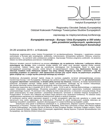 Instytut Europeistyki UJ Regionalny Ośrodek Debaty Europejskiej Oddział Krakowski Polskiego Towarzystwa Studiów Europejskich zapraszają na międzynarodową konferencję Europejskie narracje - Europa i Unia Europejska w XXI wieku jako przedmiot politycznych, społecznych i kulturowych konstrukcji 24-26 września 2015 r. w Krakowie Konferencje organizowane przez Instytut Europeistyki UJ są interdyscyplinarne. Opisujemy i wyjaśniamy procesy zachodzące w Europie jako socjologowie, politolodzy, kulturoznawcy, antropolodzy społeczni, historycy, prawnicy, językoznawcy – by wymienić tylko podstawowe podejścia. Zapraszając Państwa pragniemy podkreślić, że jesteśmy otwarci na różne perspektywy poznawcze i metodologie. Głównym tematem naszych konferencji są procesy składające się na społeczne, kulturowe i polityczne oblicza zmieniającej się Europy, która w połowie drugiej dekady XXI wieku musi sprostać większej liczbie wyzwań niż wcześniej. Całkiem realne stają się scenariusze dezintegracji Unii Europejskiej. Rodzi to wiele pytań wymagających poważnego namysłu, wśród których do najważniejszych należą: Czy Zjednoczona Europa w obecnym kształcie może efektywnie działać? Czy plany dalszej integracji są realne i sensowne – czy też pozostają projektem na papierze? Jeśli Zjednoczona Europa jest czymś więcej niż papierowym projektem, gdzie znajduje się i z czego wynika potencjał dalszego jej rozwoju? Konferencja „Europejskie narracje” będzie okazją do wymiany poglądów na temat wieloaspektowego procesu transformacji Europy i Unii Europejskiej. Interesują nas zarówno analizy rzeczywistości, jak i to, jak skonstruowane są typowe odpowiedzi i scenariusze, w obrębie jakiej narracji się mieszczą. Uważamy, że każda reprezentowana publicznie „europejska narracja” oddaje pewien aspekt rzeczywistości, otwierając się na możliwe interpretacje, ale również stanowiąc istotną dyskursywnie konstrukcję, która może wywierać realne skutki. Konferencja rozpocznie się w czwartek (24 IX 2015 r.) o godz. 14.00 w sali im. Michała Bobrzyńskiego, w najstarszej części Uniwersytetu Jagiellońskiego. Wcześniej wszystkim zainteresowanym zapewniamy możliwość zwiedzenia uniwersyteckiego muzeum. W pierwszym dniu odbędą się dwie sesje plenarne, a wieczorem uroczysta kolacja. Drugi dzień przeznaczamy na sesje panelowe i prezentacje tematyczne, tymrazem w siedzibie Instytutu Europeistyki w Przegorzałach. W trzecim dniu odbędzie się kolejna sesja plenarna oraz zamknięcie konferencji. Po obiedzie osoby zainteresowane zapraszamy do zwiedzenia historycznych atrakcji w centrum Krakowa. W konferencji wezmą udział zaproszeni eksperci z uczelni europejskich (jako key-note speakerzy w czasie sesji plenarnych) oraz osoby zgłaszające się indywidualnie. Przydział do paneli tematycznych zostanie dokonany po rejestracji wszystkich uczestników. Językami obowiązującymi w czasie konferencji są angielski i polski. Dotychczas swój udział w konferencji potwierdzili m. in. profesorowie: Zbigniew Czachór (Iniwersytet Adama Mickiewicza w Poznaniu, Thomas Faist (University of Bielefeld), Chris Hann (University of Kent, Max Planck Institute of Social Anthropology), Jan Kubik (School of Slavonic & East European Studies, University College London), Parick Lehnes (Interpret Europe), Zdzisław Mach (Uniwersytet Jagielloński), Maciej Szpunar (Trybunał Sprawiedliwości Unii Europejskiej), Jan Zielonka (Oxford University). Tematy i zagadnienia konferencji (1) Narracje i typy retoryki integracji / dezintegracji Europy w kontekście kryzysu politycznego i finansowego – dyskursy przyszłości / przeszłości Unii Europejskiej (w tym narracje: eurosceptyczna, eurorealistyczna, euroentuzjastyczna, kryzysowa i postkryzysowa, polityczno-instytucjonalna, dynamiki i zmiany społecznej, państwo-centryczna, federalistyczna, post- i transnarodowa, kosmopolityczna, normatywna, aksjologiczna, futurystyczna, obywatelska); (2) procesy zmiany politycznej, społecznej i kulturowej w Europie (europeizacja, jej konteksty i reprezentacje); (3) Europa Środkowa – konstrukcja rzeczywista, konstrukcja wyobrażona; (4) europejskie dziedzictwo, jego kulturowa transmisja i konstrukcje; (5) architektura i dyskursy bezpieczeństwa w Europie (wspólna polityka bezpieczeństwa w kontekście współczesnych zagrożeń); (6) Europejska przestrzeń prawna – kierunki rozwoju, aktualne spory i kontrowersje; (7) tożsamość europejska na rozdrożu: migracje a kryzys multikulturalizmu; (8) europejska demokracja, jej podmioty i wyobrażenia – na poziomie: wspólnot obywatelskich, ruchów miejskich i samorządów, regionów, państw narodowych, europejskiego państwa federalnego, europejskiego społeczeństwa; (9) kryzys zaufania społecznego a kryzys politycznej legitymizacji scenariuszy integracyjnych; (10) ewolucja i dewolucja instytucji europejskich. Abstrakty Abstrakty nie dłuższe niż 200 słów powinny zawierać: imię i nazwisko, stopień / tytuł naukowy, dyscyplinę nauki, tytuł wystąpienia, streszczenie podstawowych tez i wniosków oraz opis zastosowanej metodologii. Prosimy o przysyłanie zgłoszeń i abstraktów nie później niż do 15 maja 2015 r. na adres [email protected]. Zasady selekcji zgłoszeń Wszystkie nadesłane propozycje wystąpień zostaną ocenione przez Komitet Organizacyjny, który w szczególnych wypadkach może poprosić o sprecyzowanie treści, rozwinięcie lub skrócenie zgłoszenia. O wynikach selekcji zostaną Państwo powiadomieni 1 czerwca 2015. Proszę pamiętać, że wystąpienie zostanie wpisane w program konferencji pod warunkiem wniesienia opłaty konferencyjnej w terminie do 31 lipca 2015. Opłata za konferencję Opłata konferencyjna, wynosząca 400 zł od osoby, zostanie przeznaczona na materiału konferencyjne i promocyjne, poczęstunek w czasie przerw, koszty obiadów, uroczystą kolację w pierwszym dniu konferencji. N